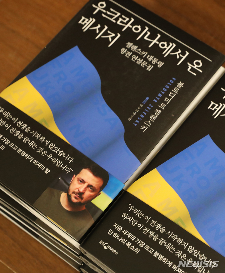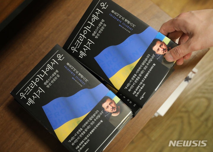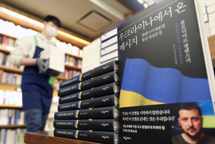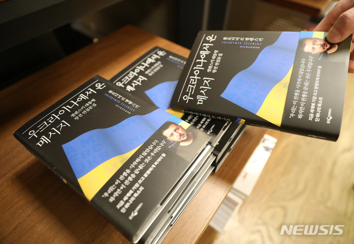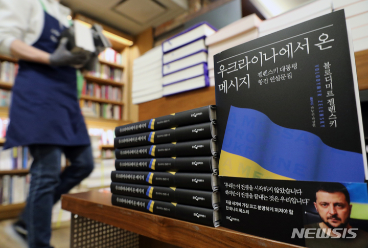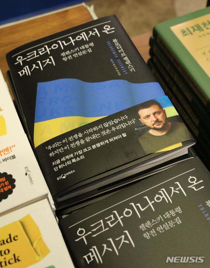 ソウル市内の書店に31日午前、ウクライナのウォロディミル・ゼレンスキー大統領の抗戦演説集『ウクライナから来たメッセージ』が並べられている様子。今回出版された韓国語版では、ペンギン・ランダムハウスから出た初版に3本の演説を追加し、計19本の演説が載っている。