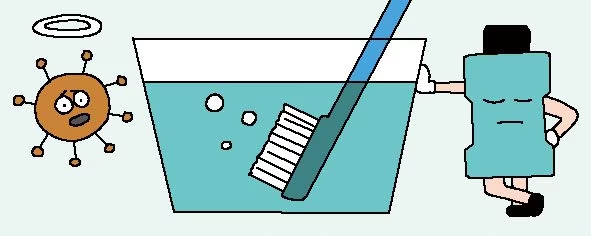 歯ブラシは、マウスウォッシュなどの口内洗浄剤に約30秒間浸した後、すすげば消毒できる。口内洗浄剤の中のアルコールに消毒の効果がある。