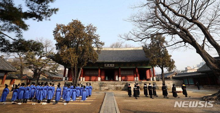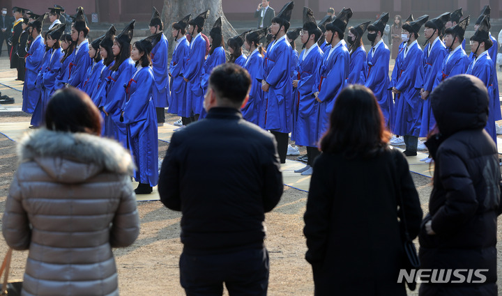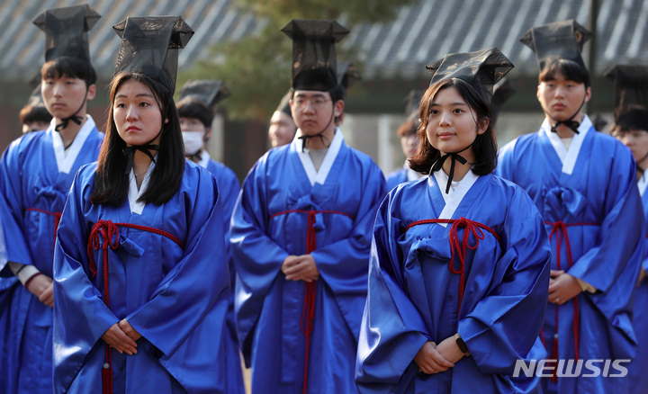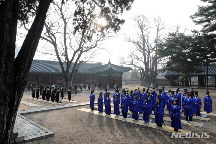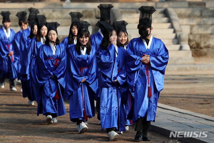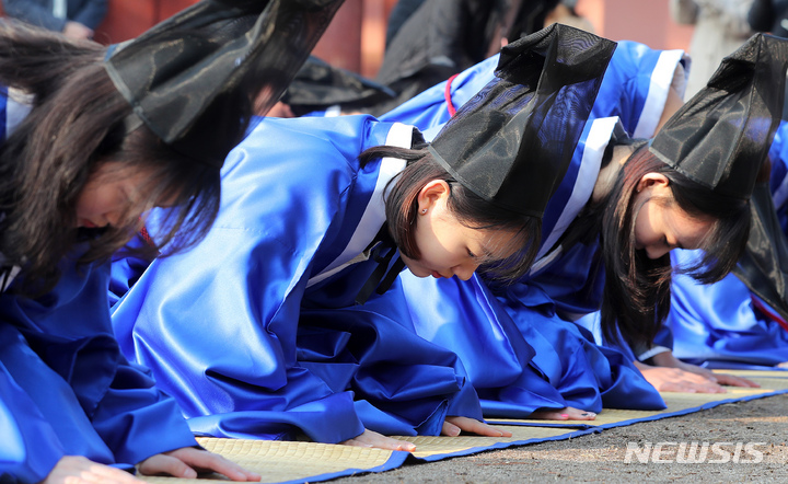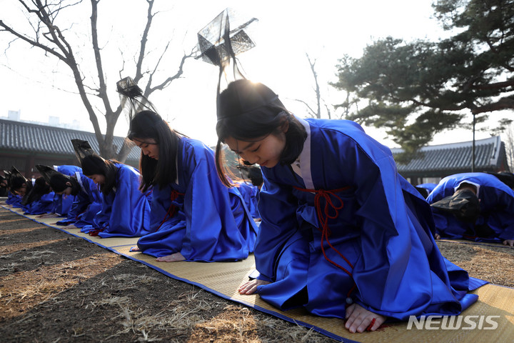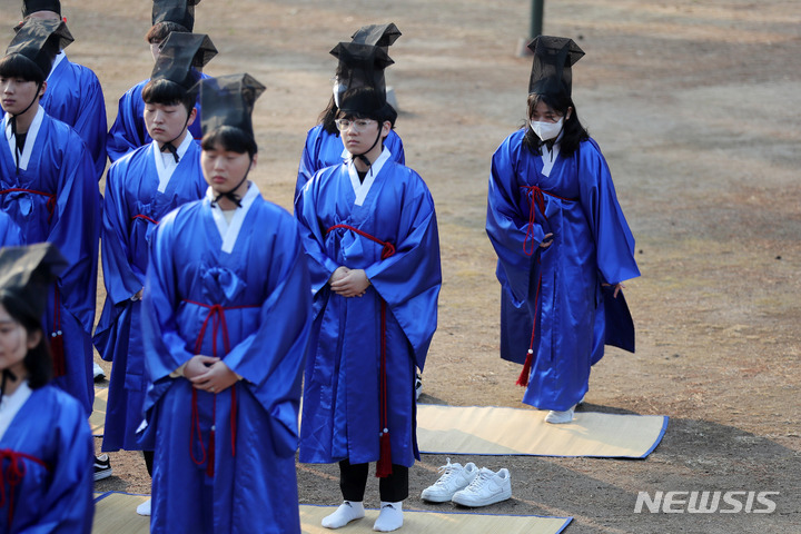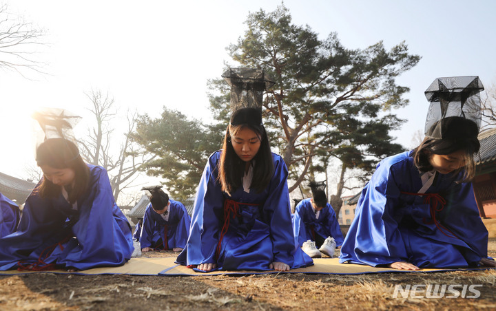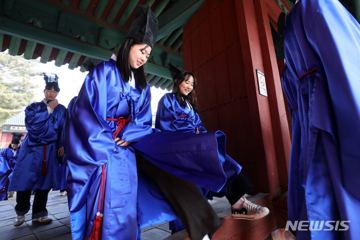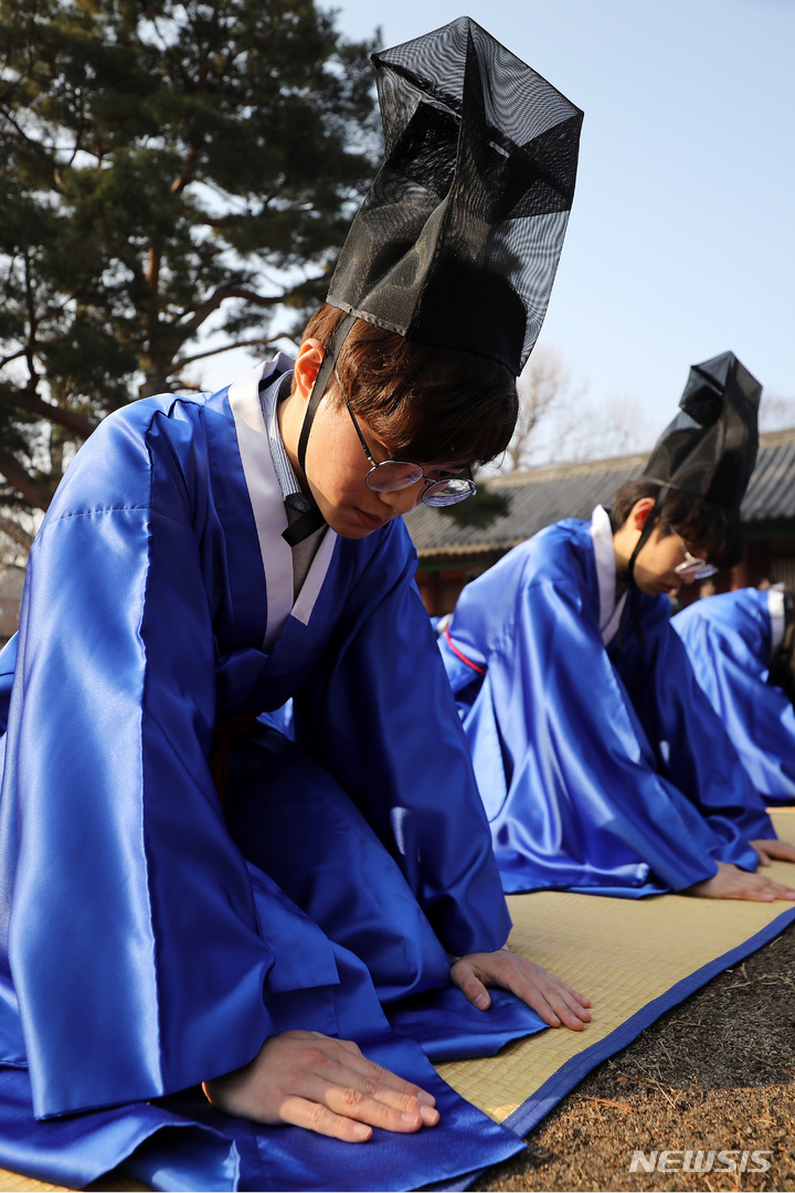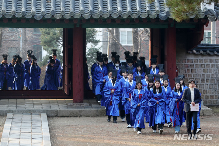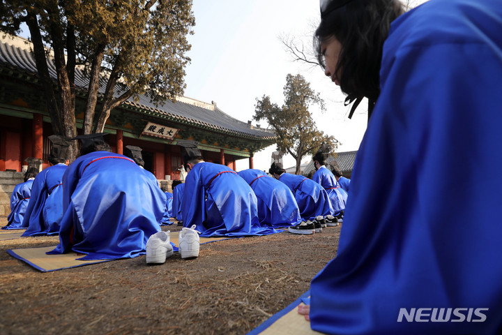 【NEWSIS】24日午前、ソウル市鍾路区の成均館大学大成殿で、入学式に先立ち伝統の儀式「告由礼」に臨む新入生たち。