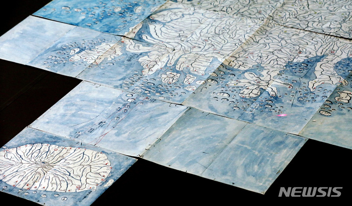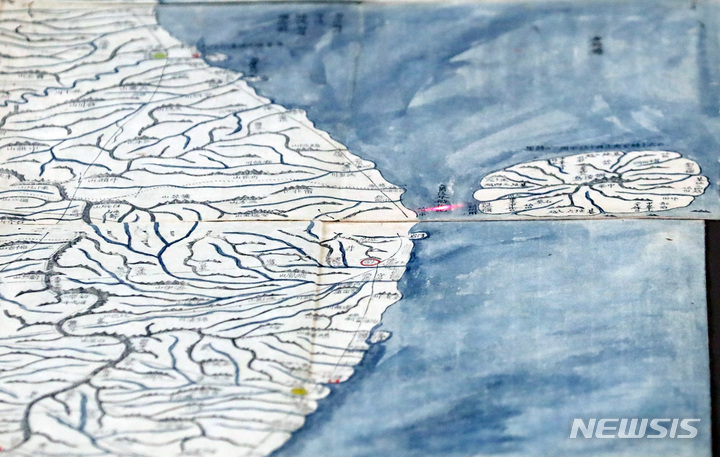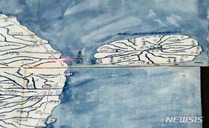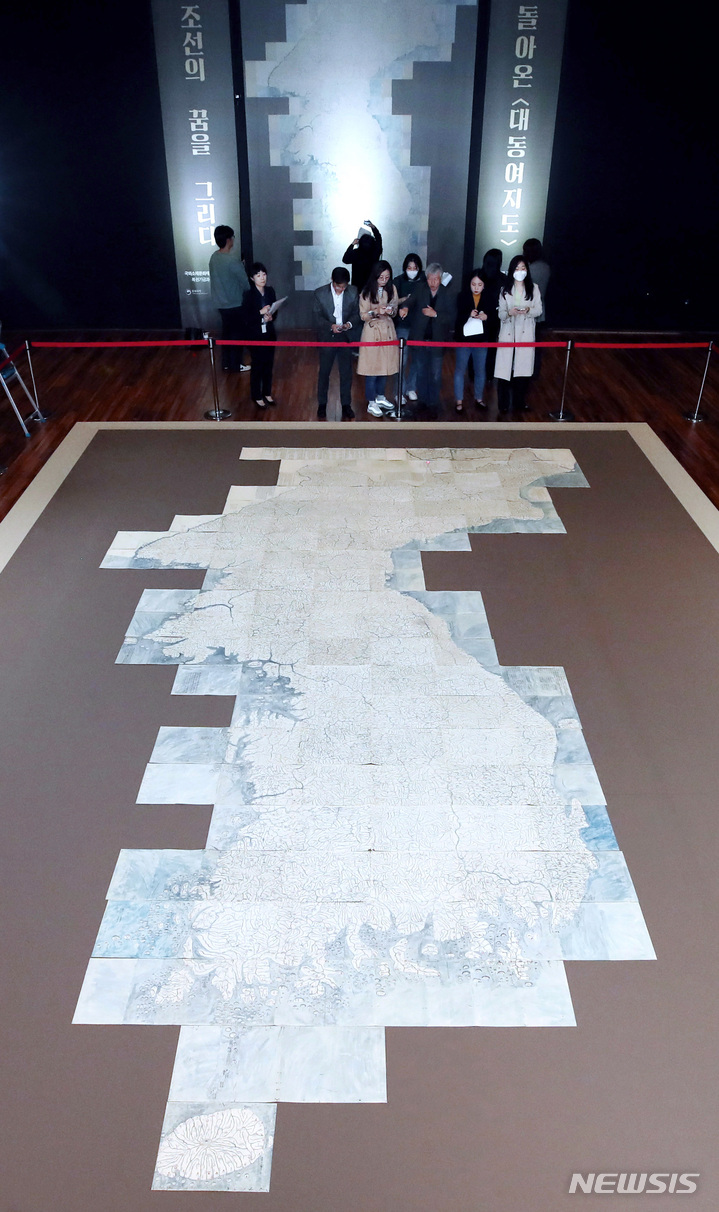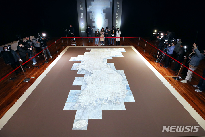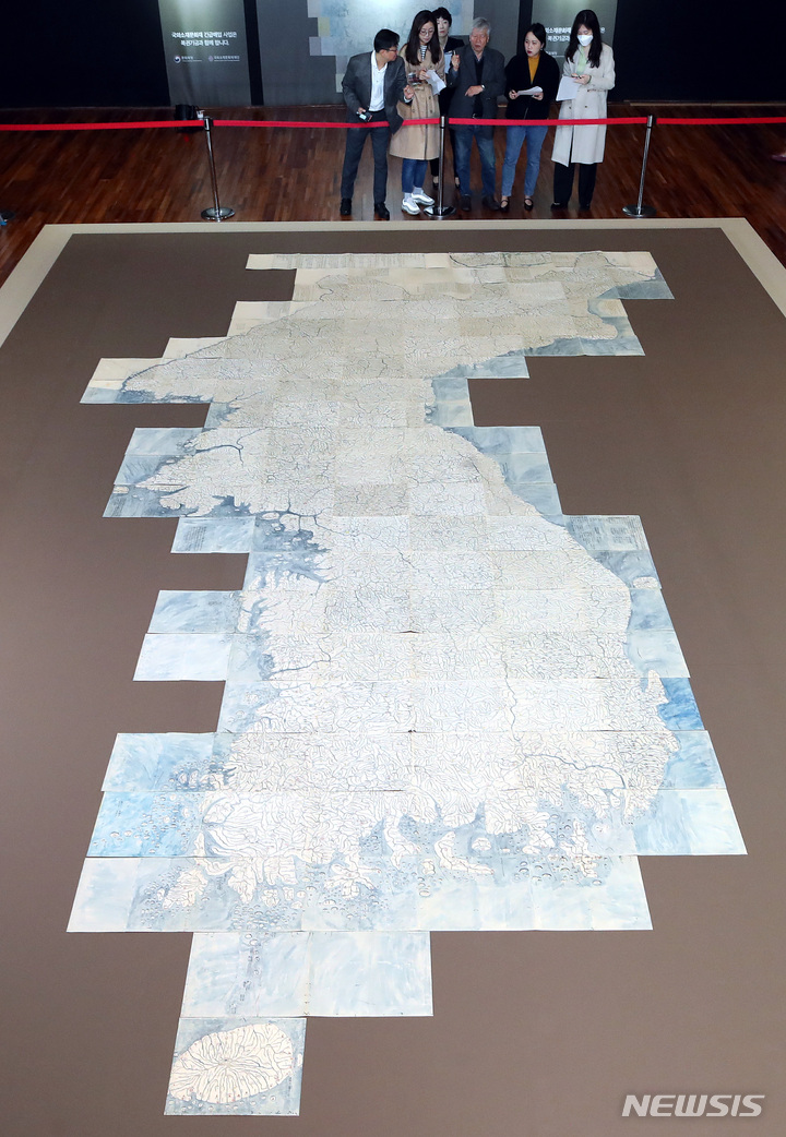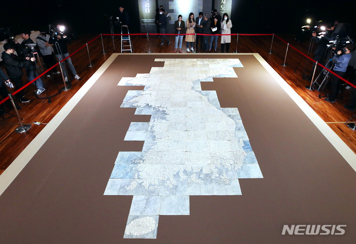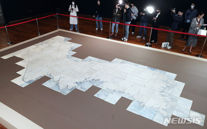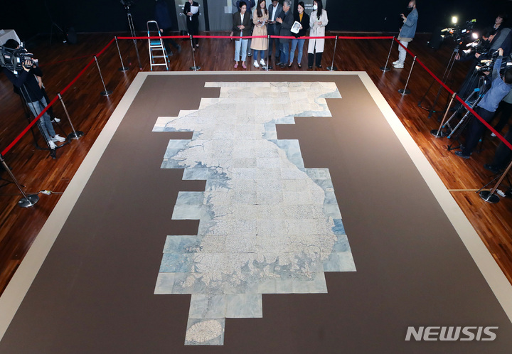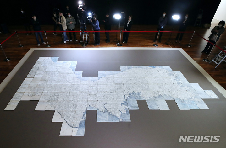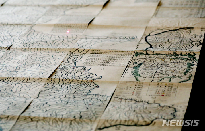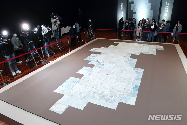 ソウル市鍾路区の国立古宮博物館で30日午前、日本から取り戻した「大東輿地図」が公開されている。このたび戻ってきた「大東輿地図」は、韓国で最初に確認された「東輿図」の注記内容が筆写された「大東輿地図」の版本だ。全23帖(目録1帖、地図22帖)からなる。
