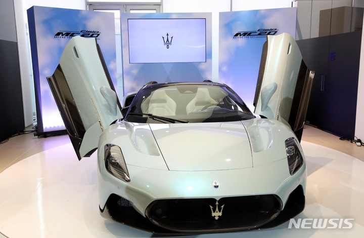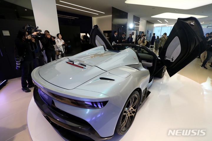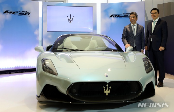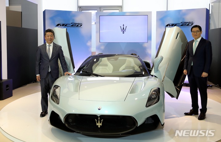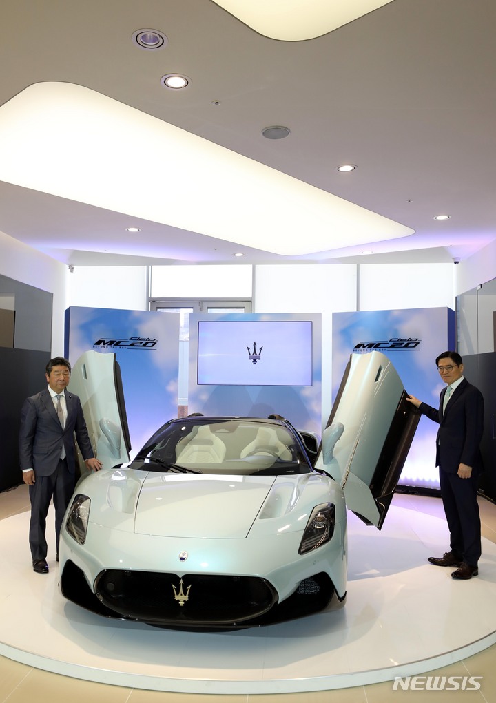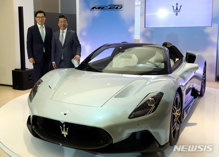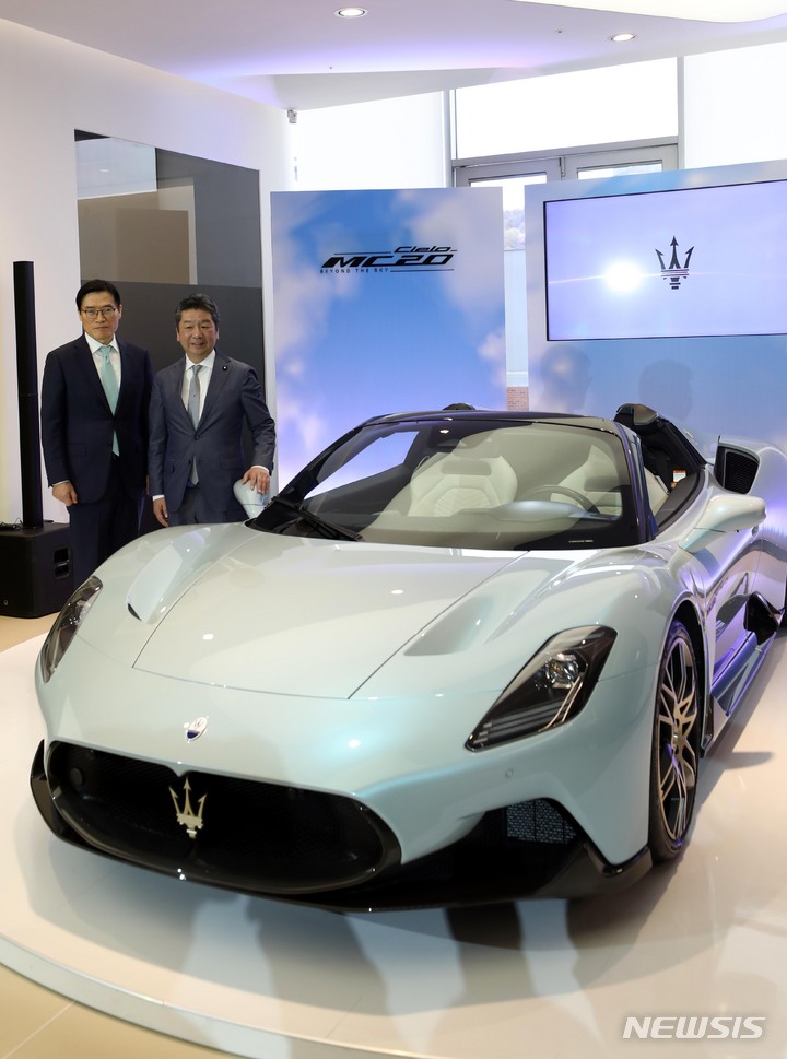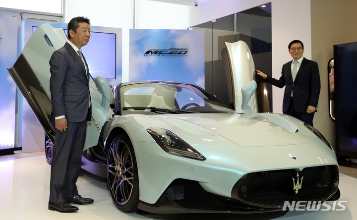ソウル市竜山区のマセラティ漢南展示場で4日午前、株式会社FMKのキム・グァンチョル代表理事(写真右)とマセラティのアジアパシフィックリージョンの統括を務める木村隆之氏が、限定モデル「MC20チェロ・プリマセリエ」を公開した。
