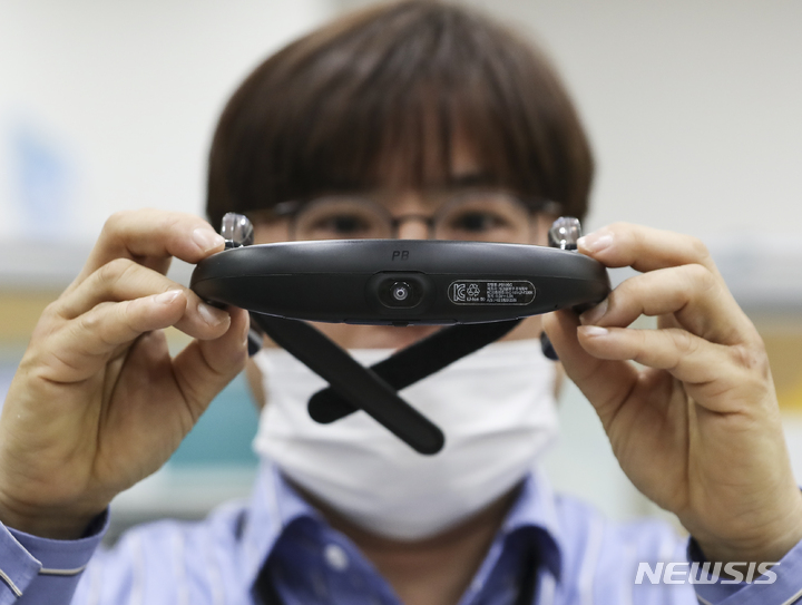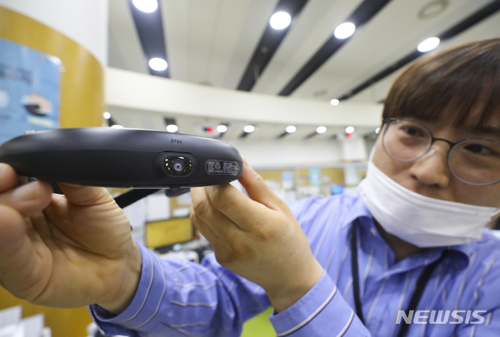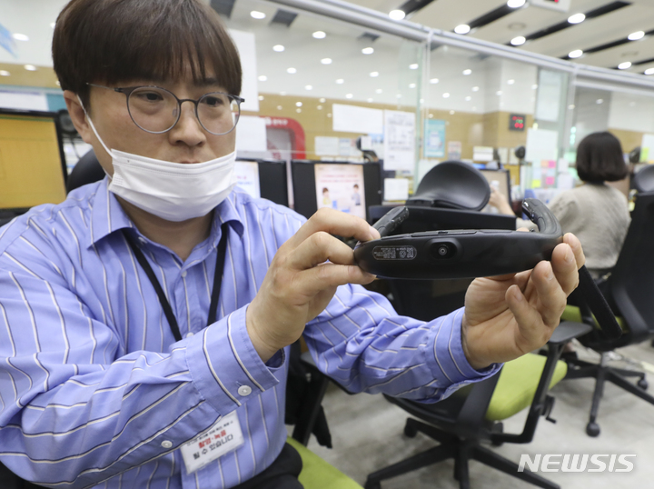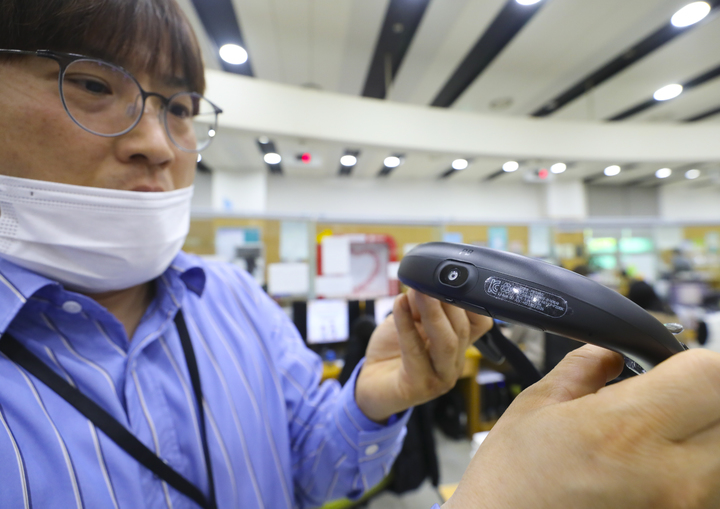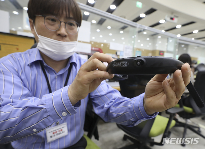 冠岳区庁の陳情担当職員が4日午前、ソウル市の冠岳区庁民願室で携帯用動画撮影装置「ウェアラブルカメラ」を披露しているところ。冠岳区庁は、悪質な陳情者から担当公務員を保護するため、携帯用動画撮影装置「ウェアラブルカメラ」を導入すると発表した。