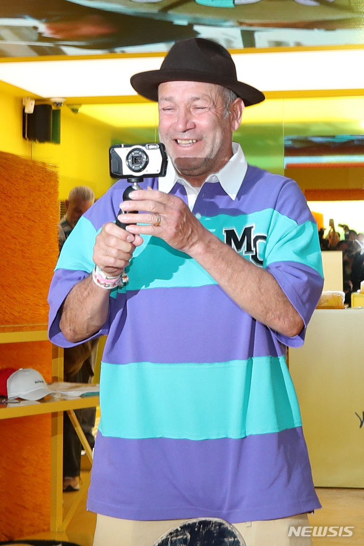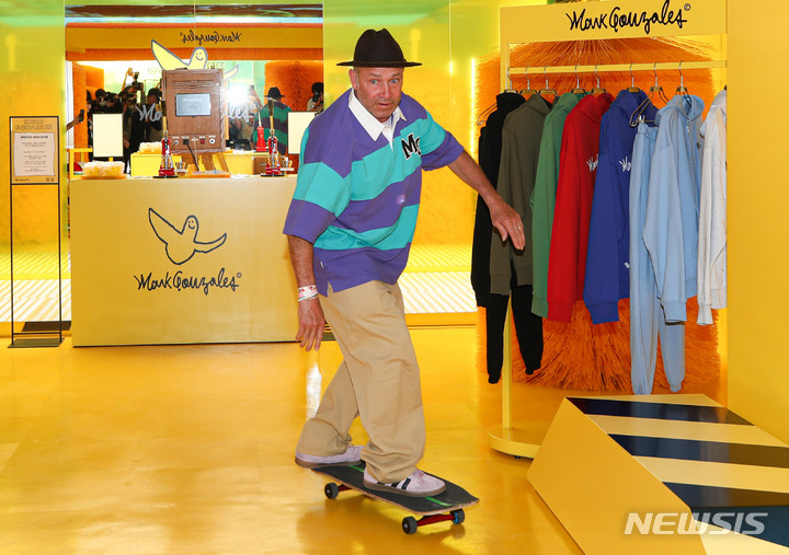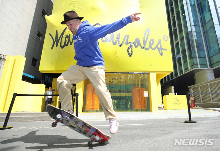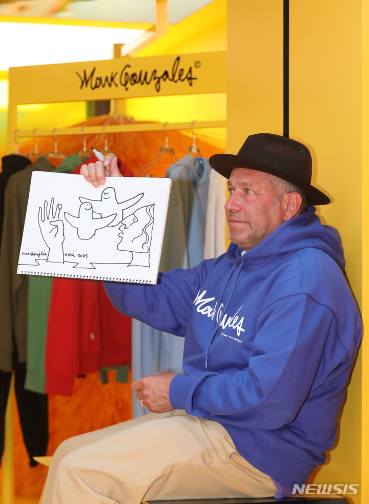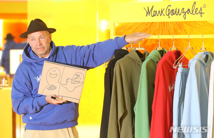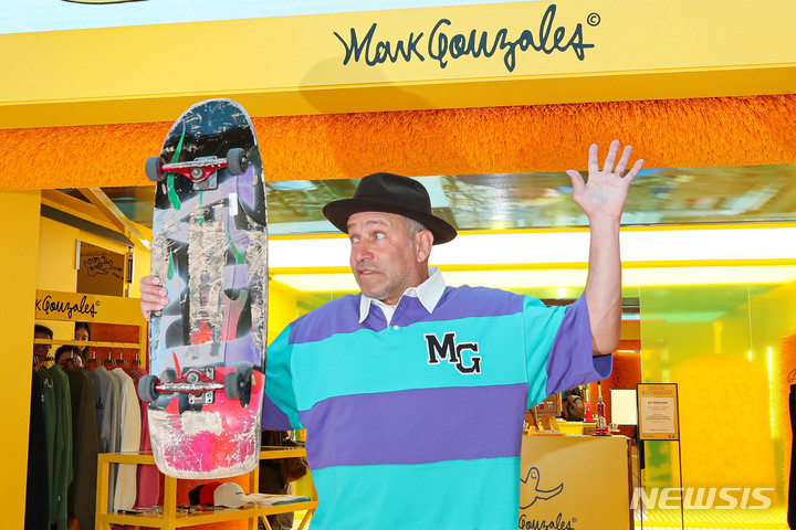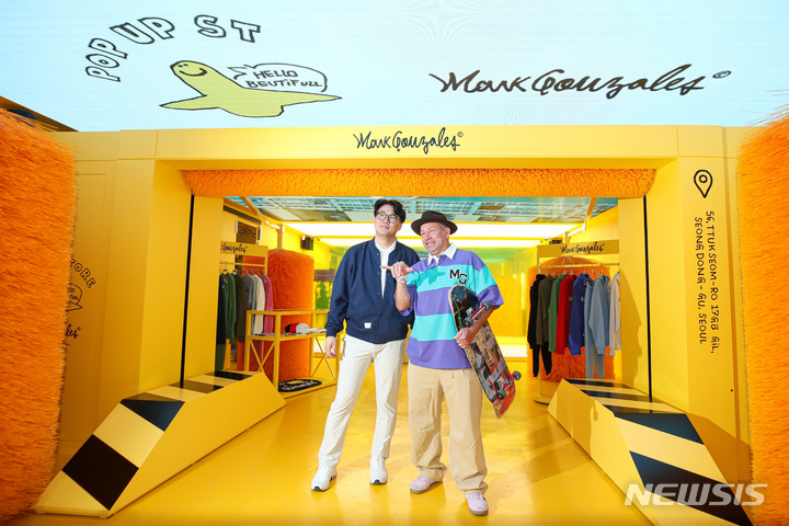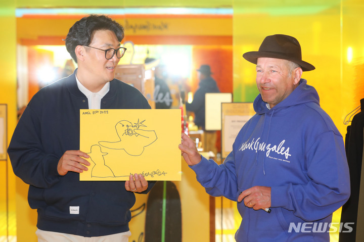 プロのスケートボーダーでアーティストのマーク・ゴンザレス(写真右)が21日午後、ソウル市城東区の「MARK GONZALES」聖水ポップアップストアで、ザ・ネイチャー・ホールディングスのパク・ボムジュン副社長と記念撮影をしている。