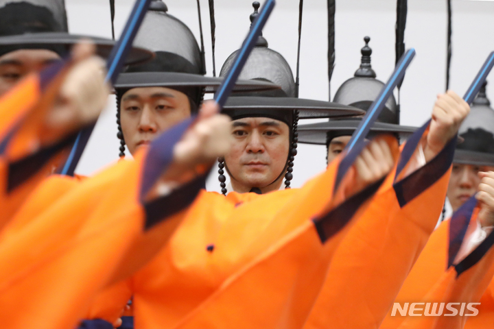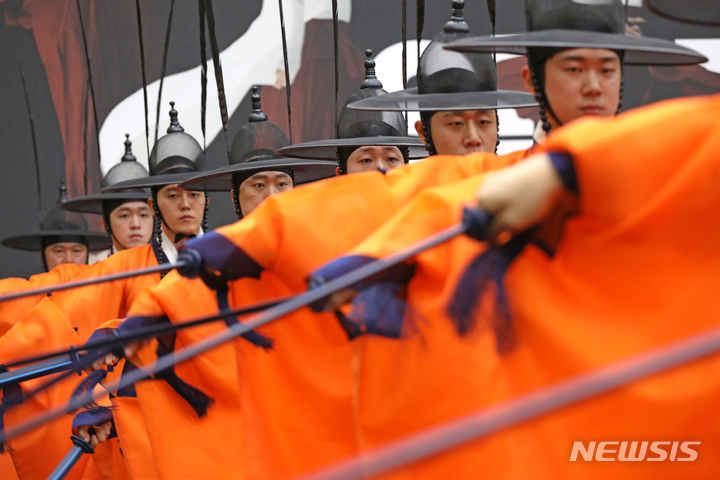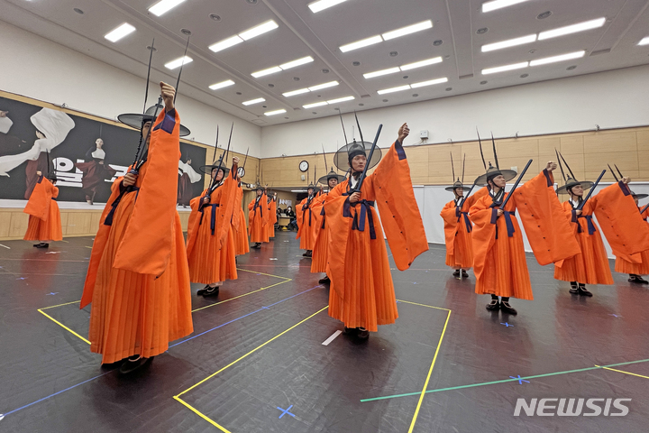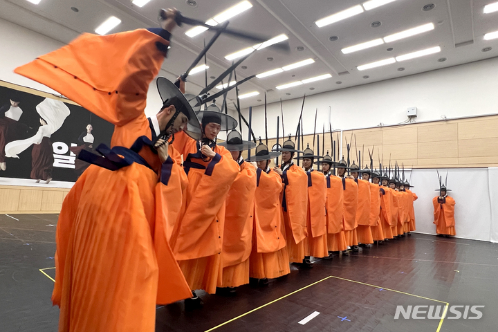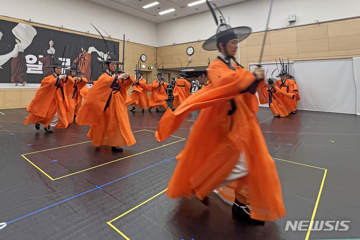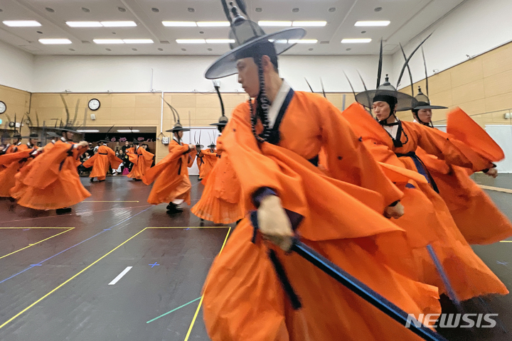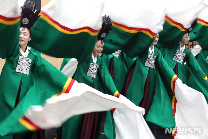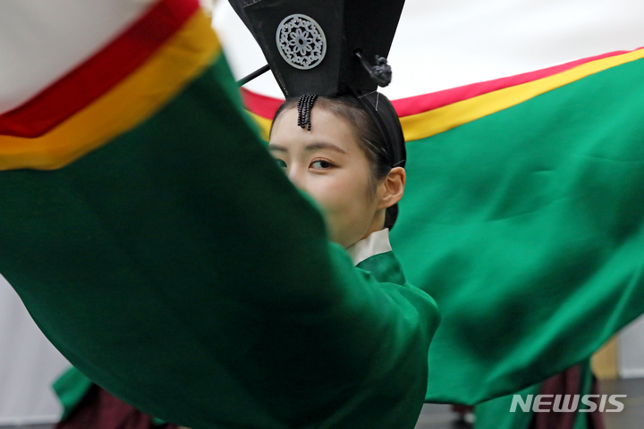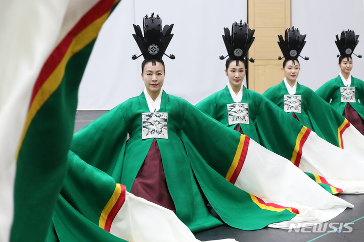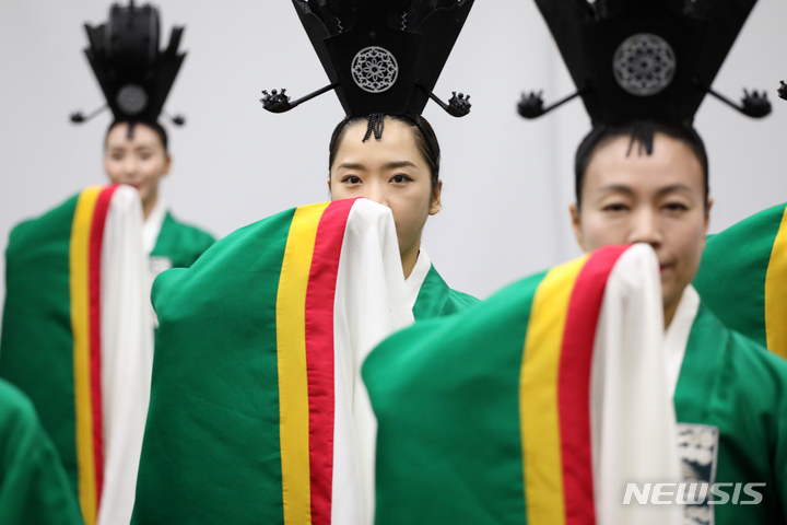 ソウル市舞踊団「イルム」の出演舞踊家らが25日、ソウル市鍾路区の世宗文化会館舞踊団練習室で、公演の練習を公開した。「イルム」は、国家無形文化財第1号でユネスコ(国連教育科学文化機関)の人類無形文化遺産にも登録された文化遺産「宗廟祭礼楽」から始まった。「宗廟祭礼楽」とは、朝鮮王朝時代に国王と王妃の神主(位牌)をまつる宗廟で執り行われた祭礼儀式に用いる器楽と、歌・舞いのことを指す。中でも祭礼舞のことを「イルム」と称し、一列に揃って舞いを舞うという意味だ。