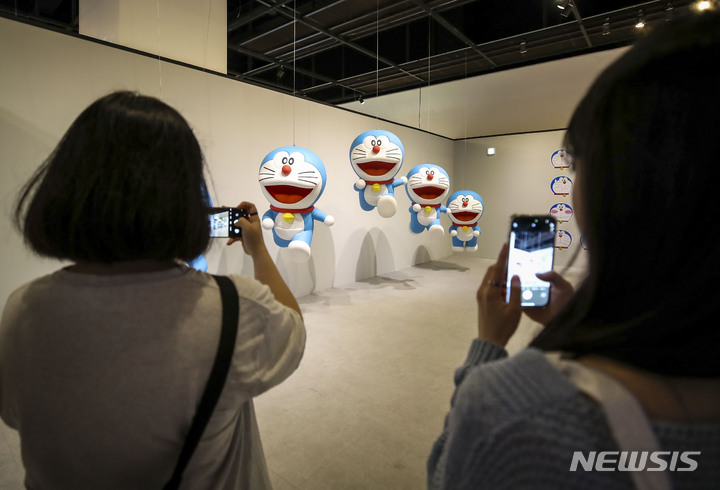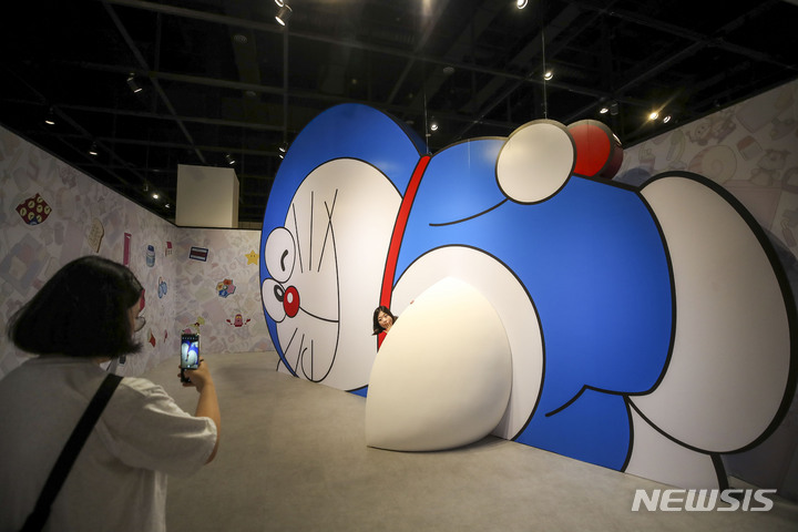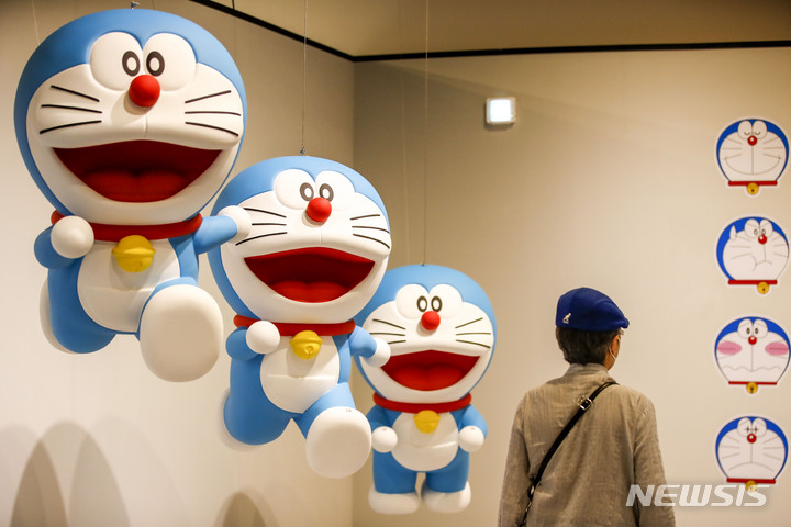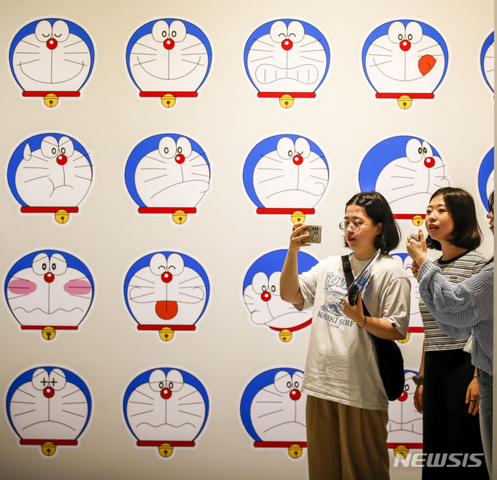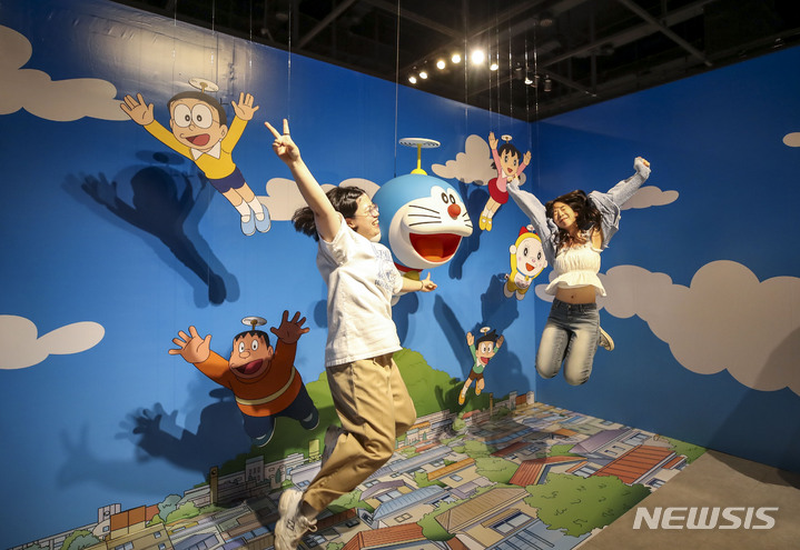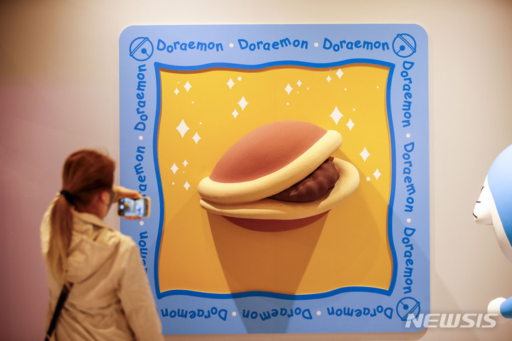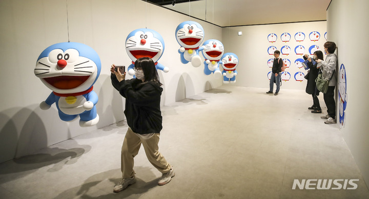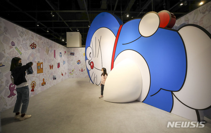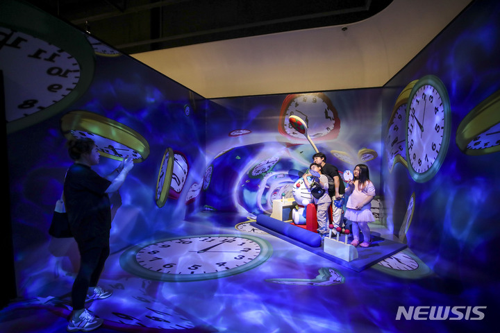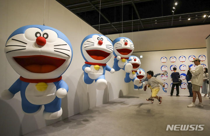 子どもの日に当たる5月5日午前、雨の中、ソウル市竜山区のアイパークモールポップコーンDスクエアで開催された「ドキドキドラえもん展」を訪れた市民たちが、展示物を見て回りながら楽しいひとときを過ごした。