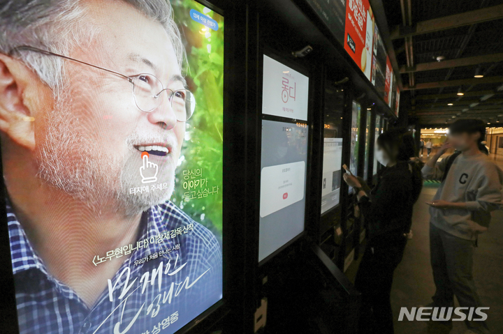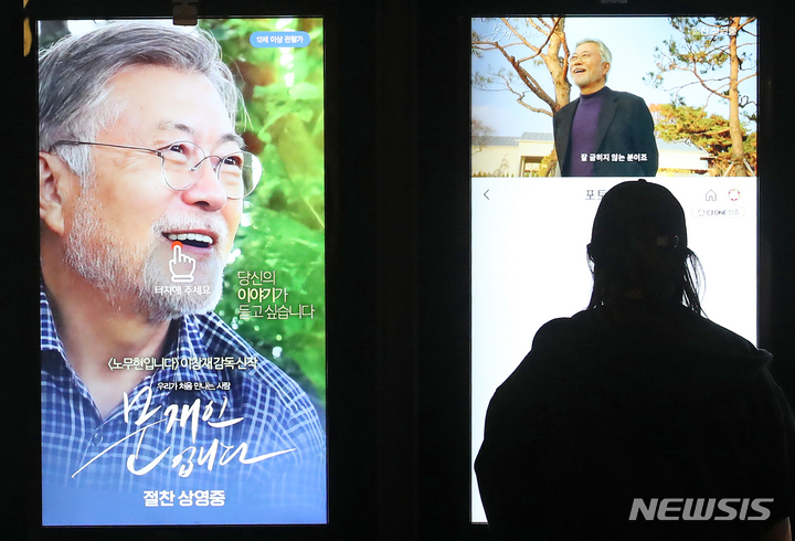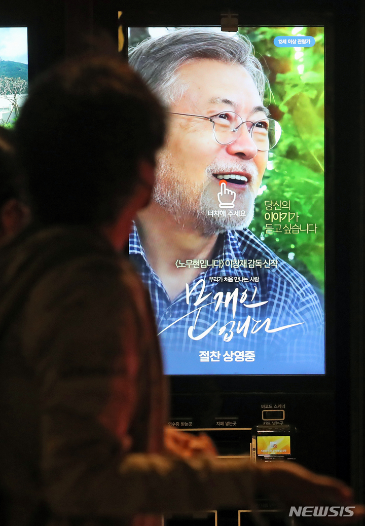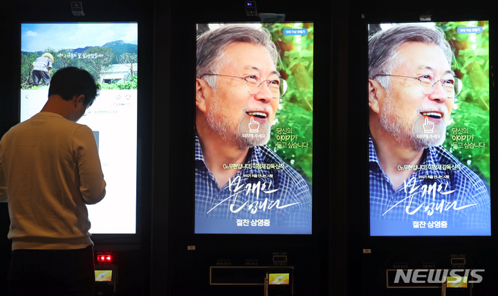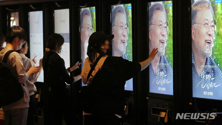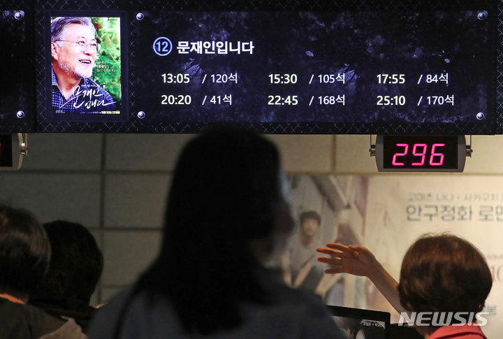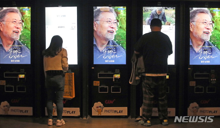 映画『文在寅です』の公開が始まった10日午後、ソウル市内の映画館を訪れた市民がチケットを購入している様子。