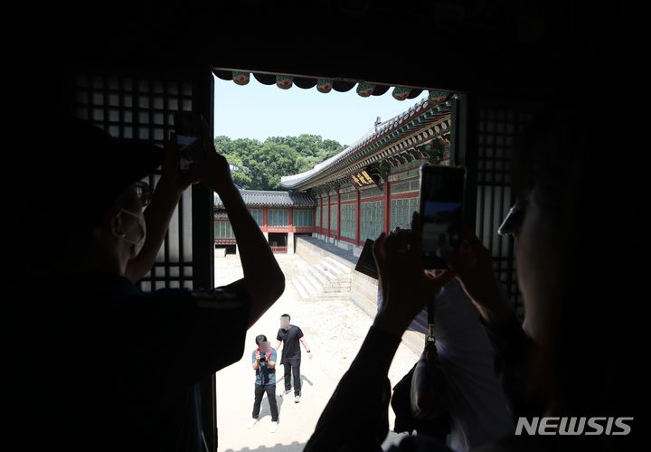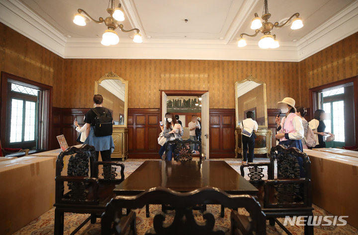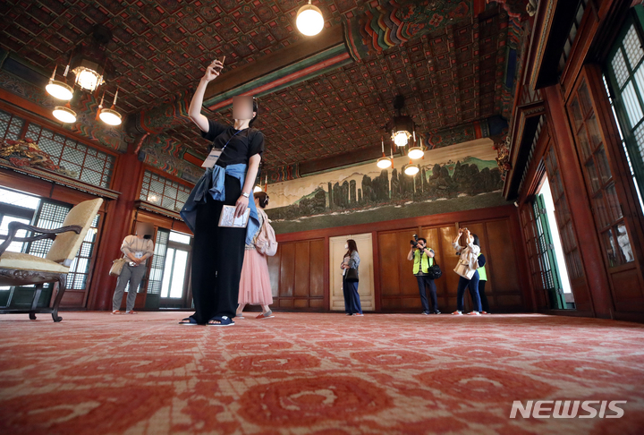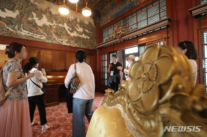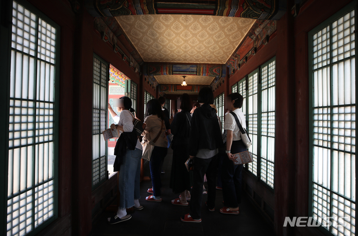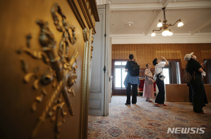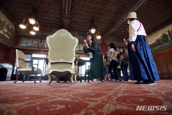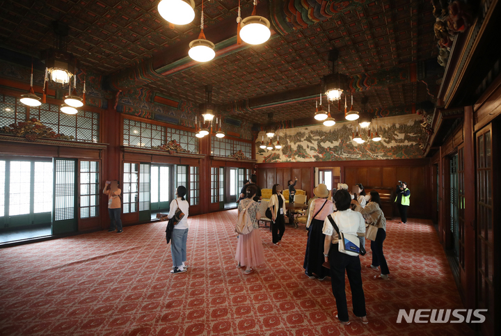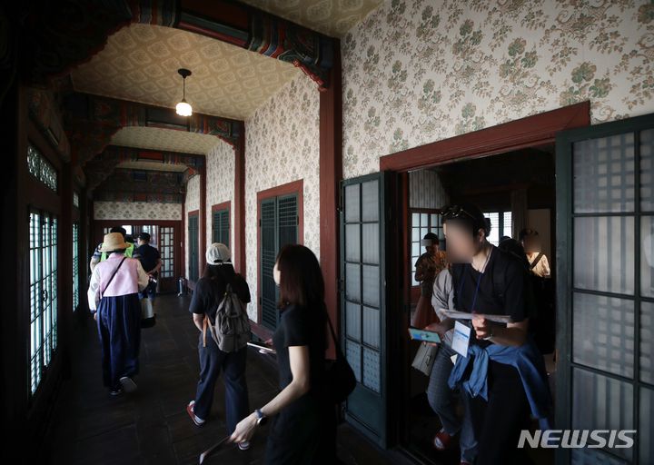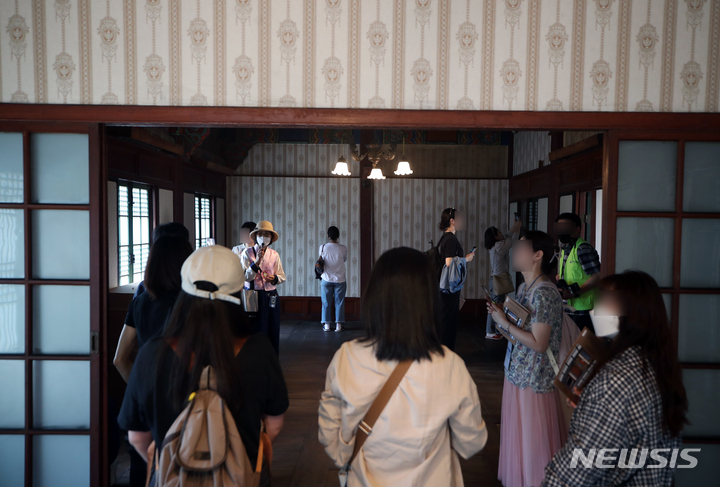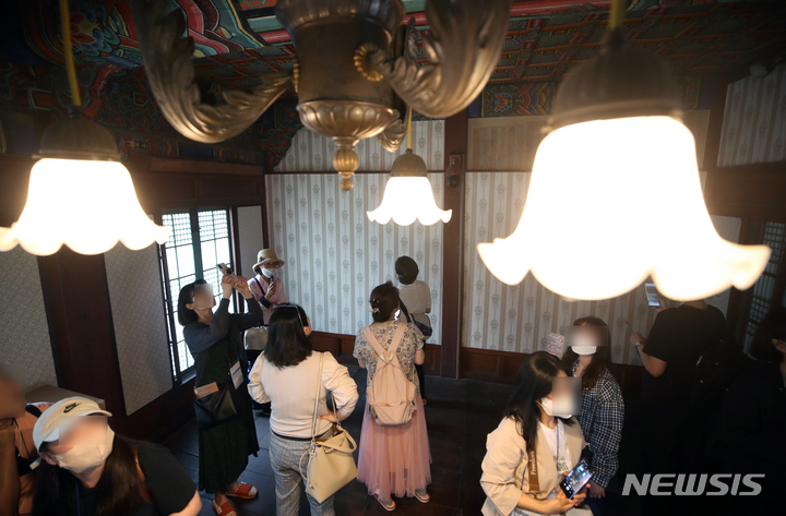 文化財庁宮陵遺跡本部が来月3日まで、ソウル市内の昌徳宮・熙政堂の内部を見ることができる「昌徳宮を深く見る、熙政堂」プログラムを運営する。写真は16日、昌徳宮・熙政堂で入場者たちが、伝統建築物ながら装飾や玄関などに西洋式要素が導入された内部を見て回っている様子。