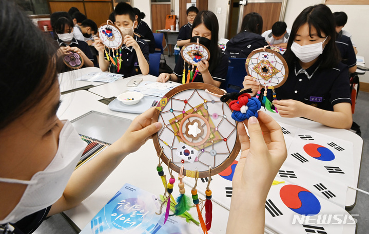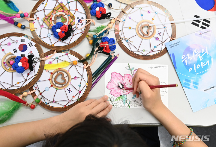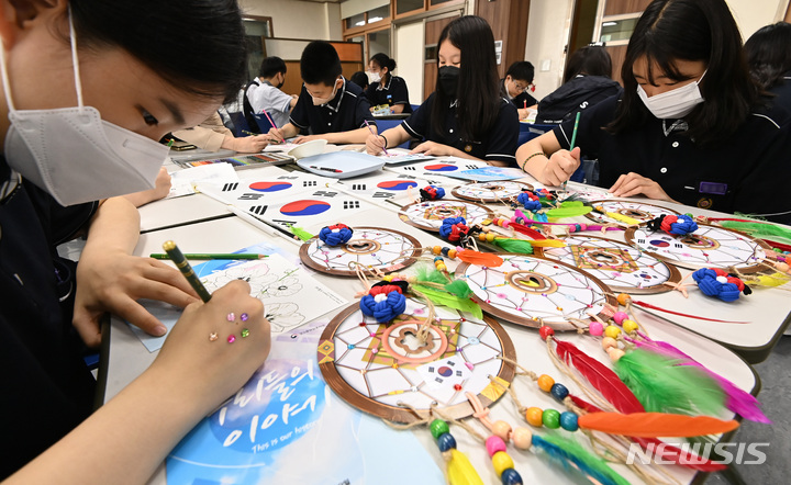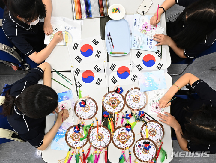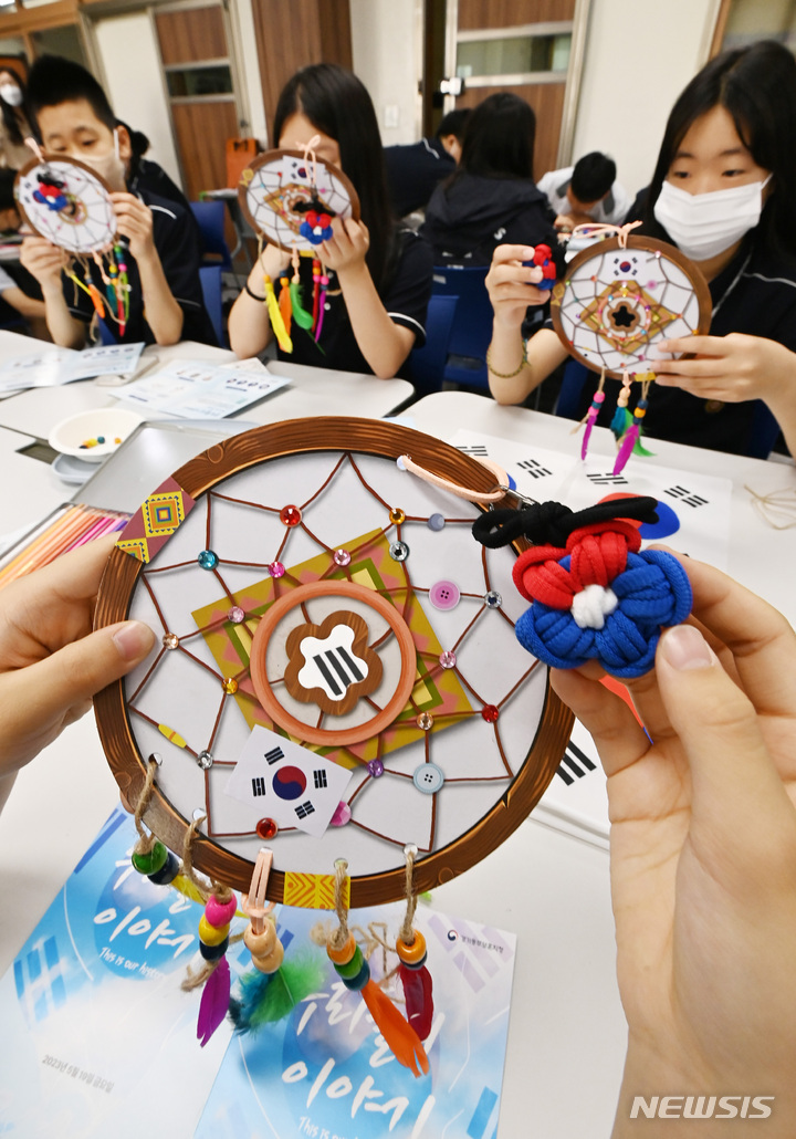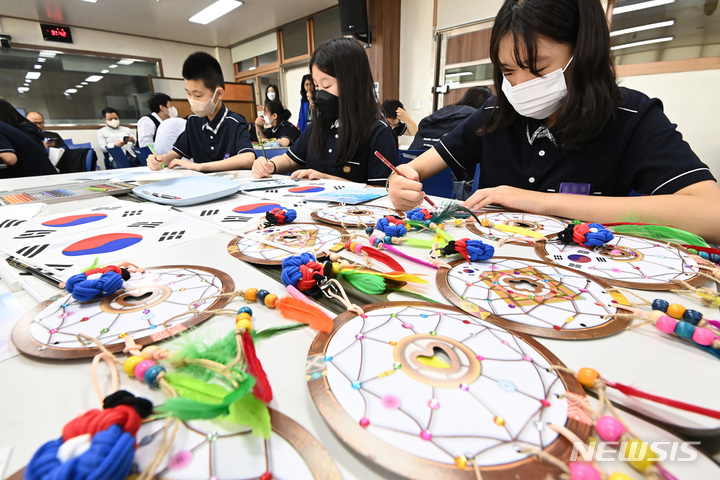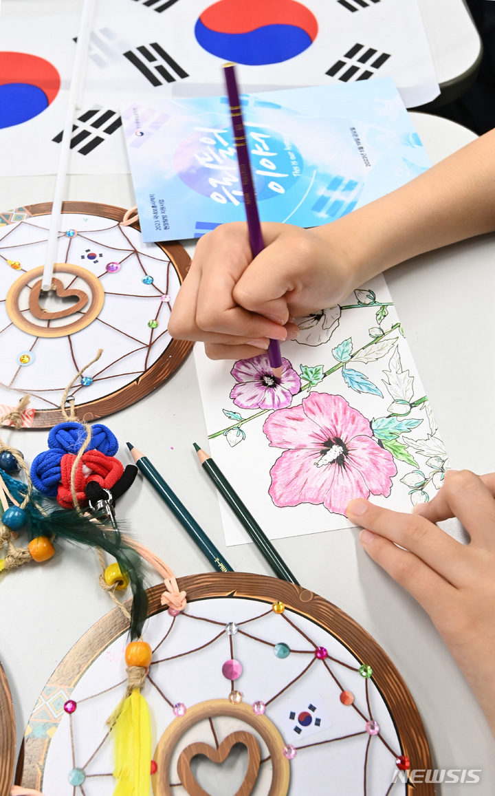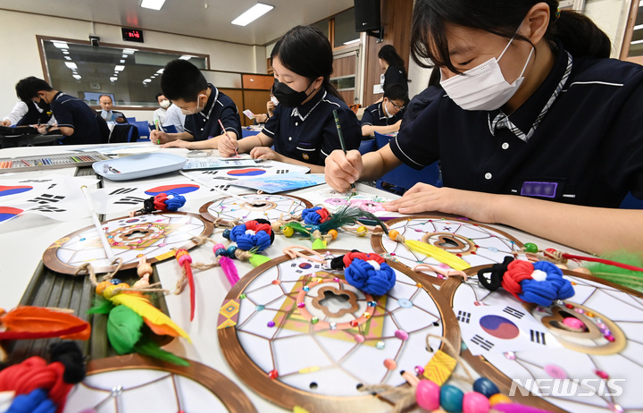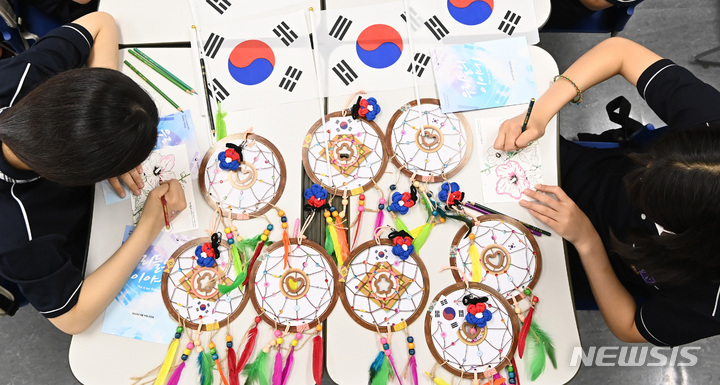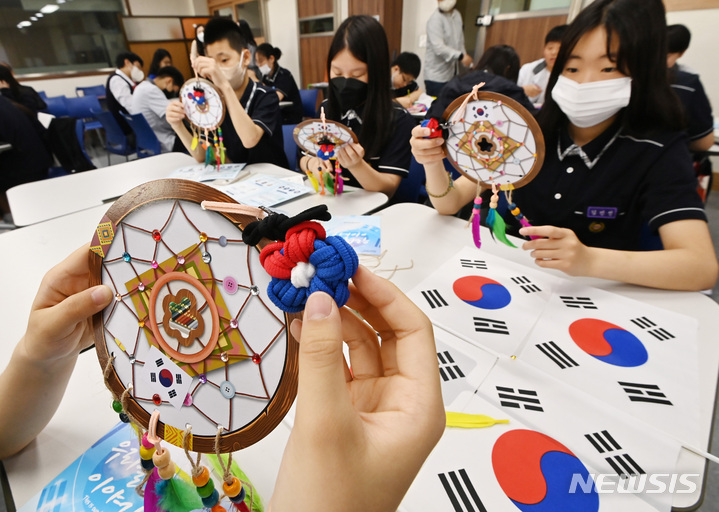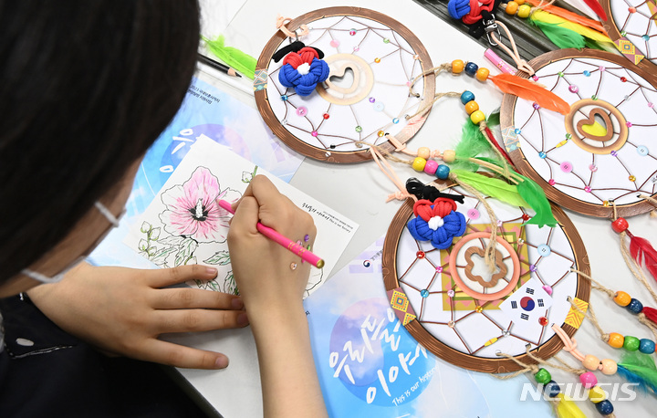 京畿道城南市盆唐区のソヒョン中学校で19日、京畿東部報勲支庁主催の護国報勲体験活動「私たちの物語」イベントが開かれ、生徒たちが国家有功者に感謝する気持ちを込めて太極ドリームキャッチャー作りやムクゲの花のカラーリング葉書作りをしている様子。