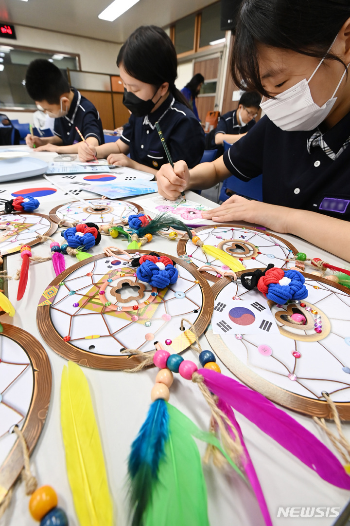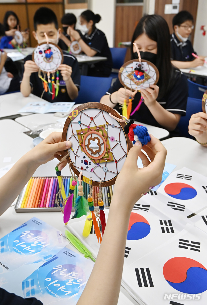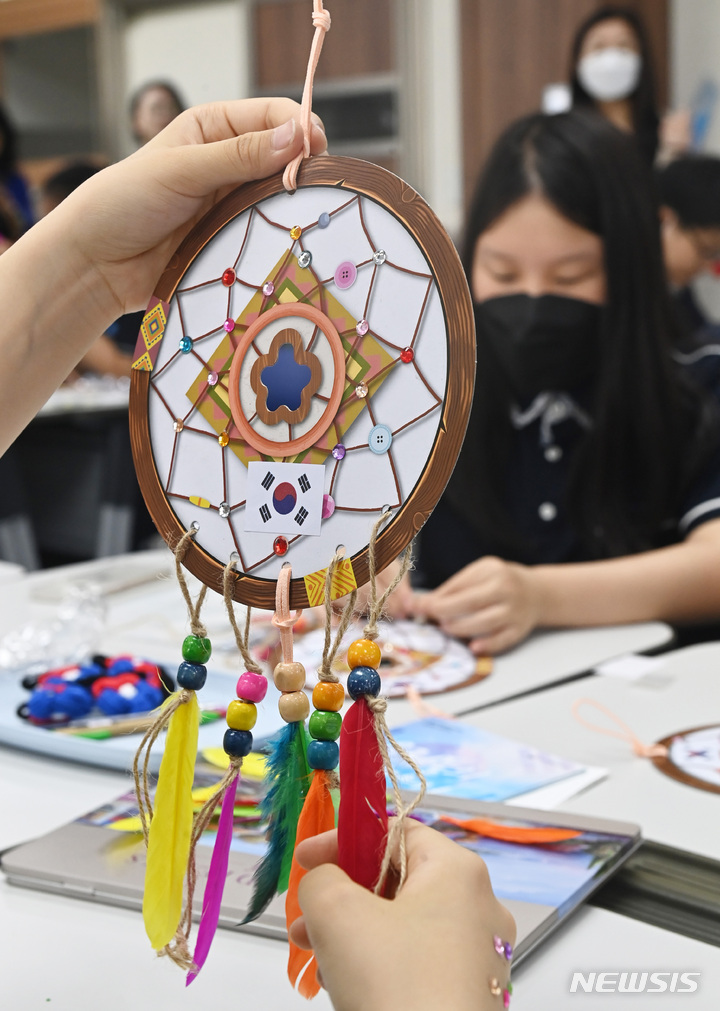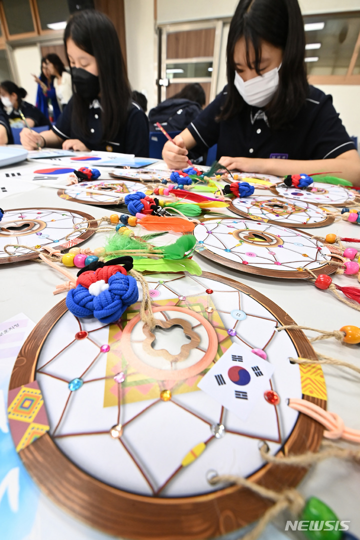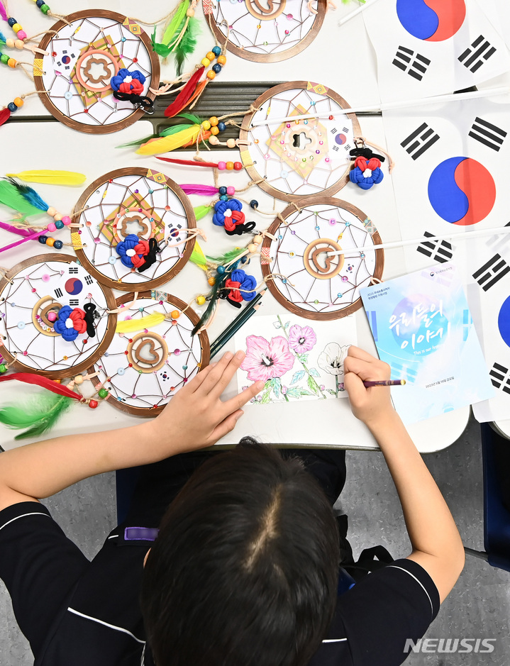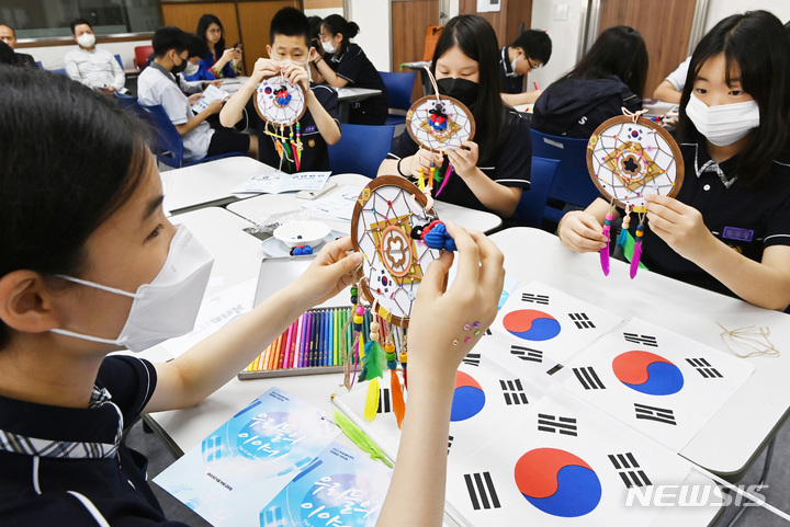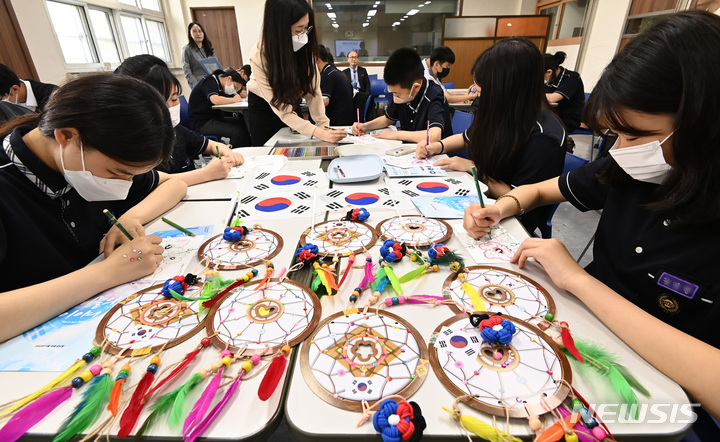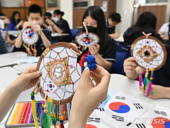 京畿道城南市盆唐区のソヒョン中学校で19日、京畿東部報勲支庁主催の護国報勲体験活動「私たちの物語」イベントが開かれ、生徒たちが国家有功者に感謝する気持ちを込めて太極ドリームキャッチャー作りやムクゲの花のカラーリング葉書作りをしている様子。
