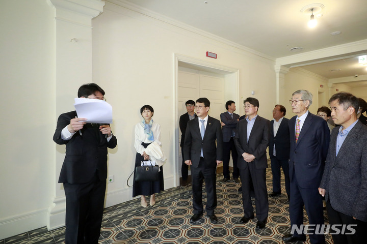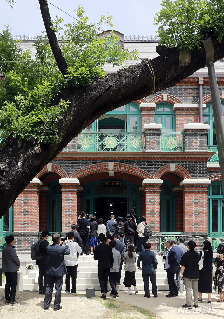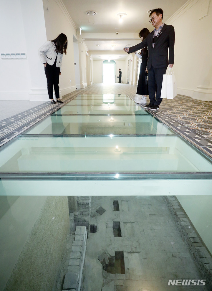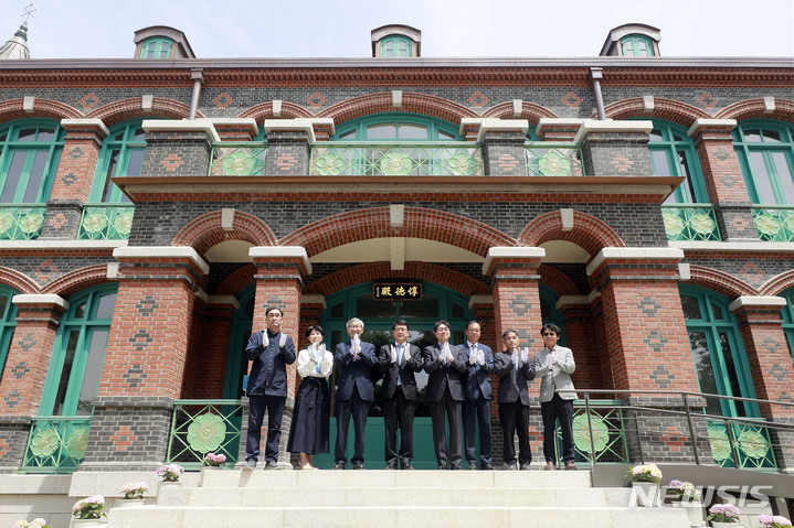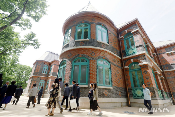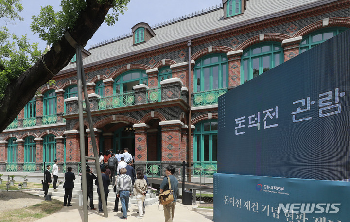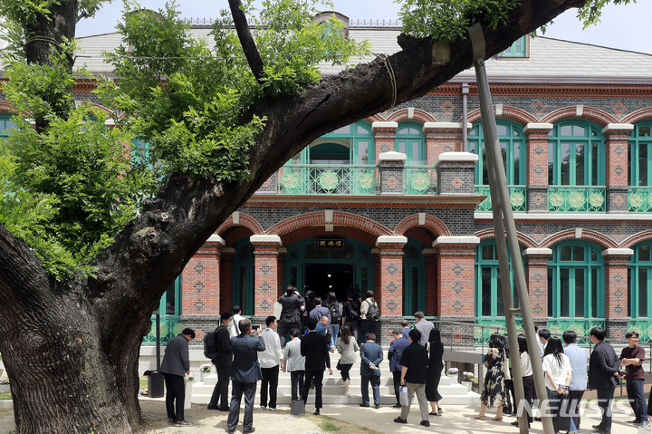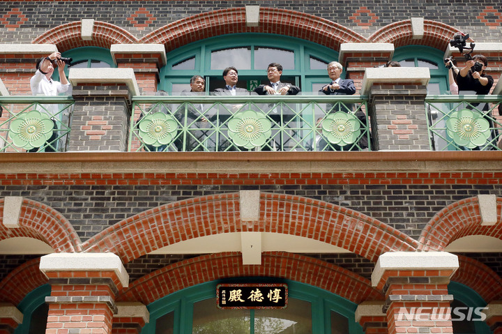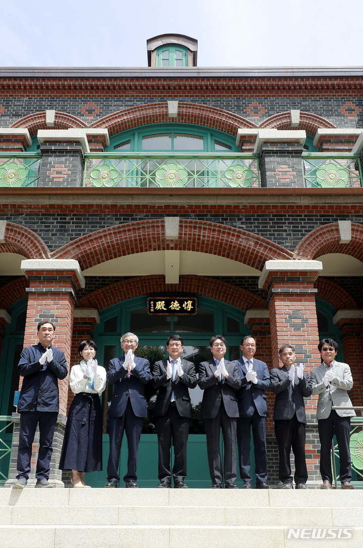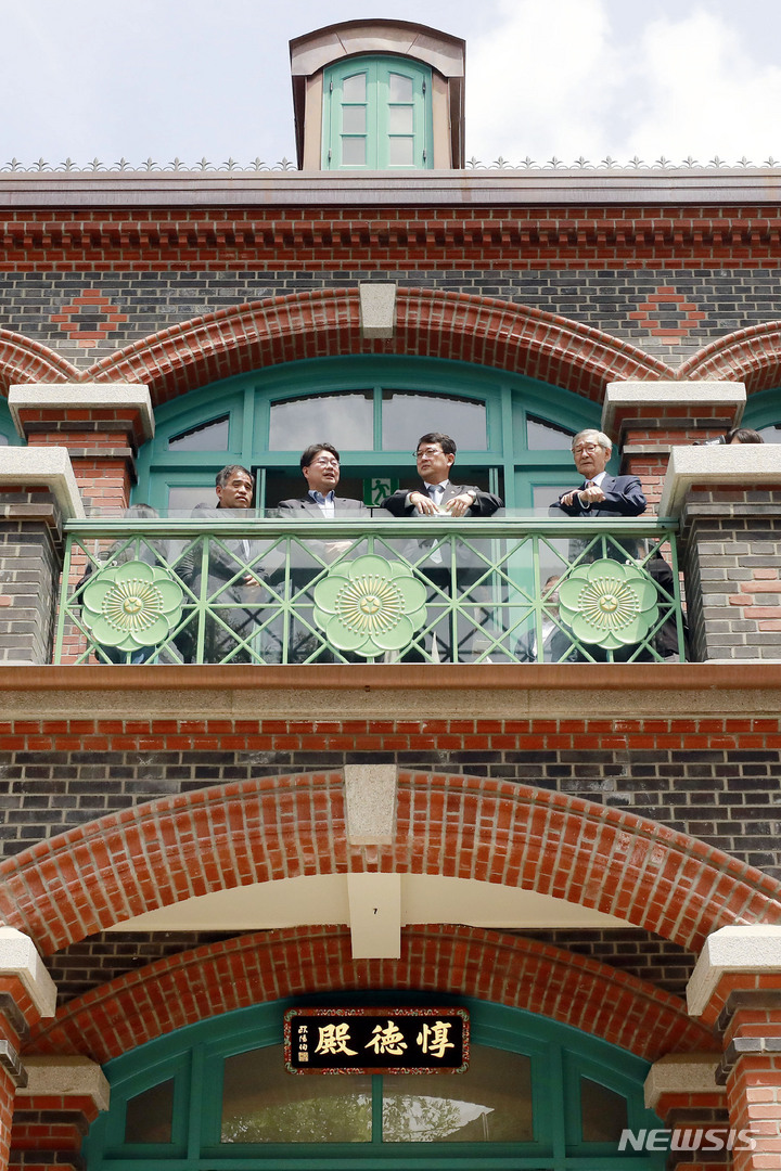 ソウル市中区の徳寿宮で22日、惇徳殿再建記念懸板除幕式が開かれ、崔応天(チェ・ウンチョン)文化財庁長をはじめとする来賓が惇徳殿のテラスから外を眺めている。日帝強占期に取り壊された惇徳殿は、高宗即位40周年記念行事の会場として建てられ、大韓帝国期には外交のための迎賓館や謁見館などとして使われた。