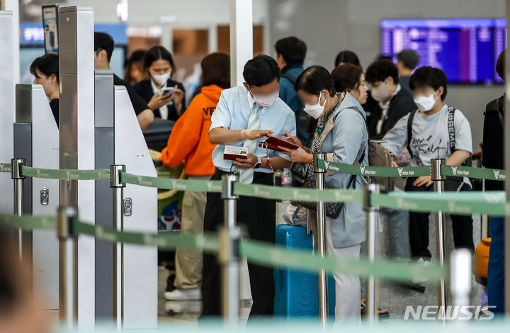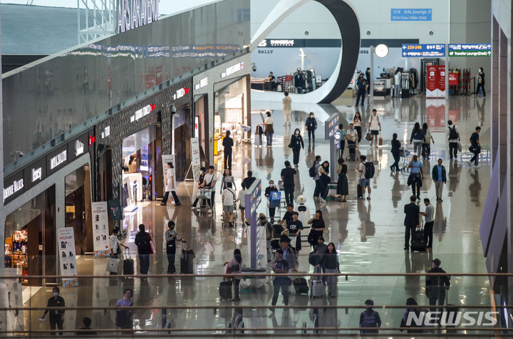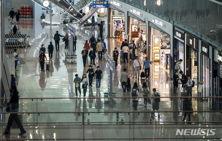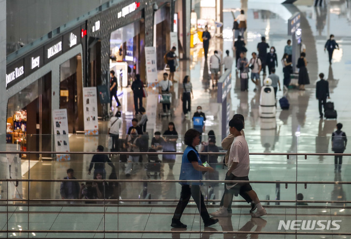 医院レベルの医療機関および薬局でも、6月からはマスクを着けなくても過料を科されない。しかし、入院患者が密集する病院レベル以上の医療機関や、療養院など入所型の感染脆弱施設では、当分は着用義務が維持される。写真は29日、仁川国際空港第2ターミナルの免税店区域を行き来する旅行客の様子。