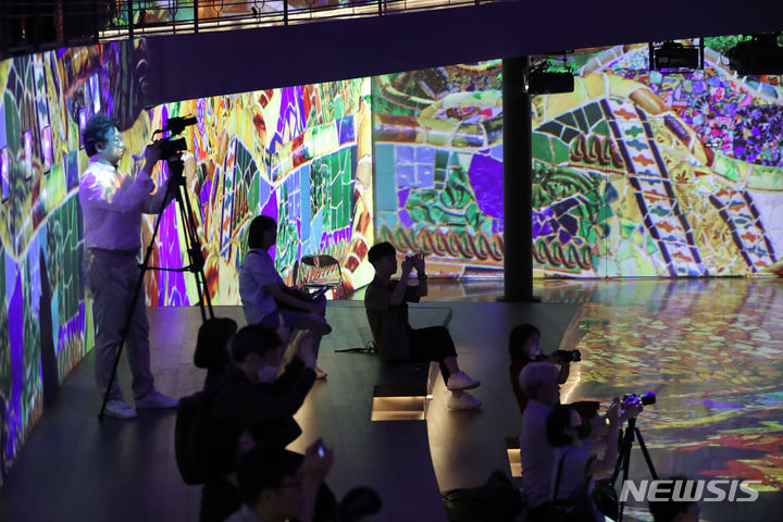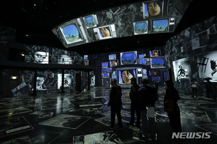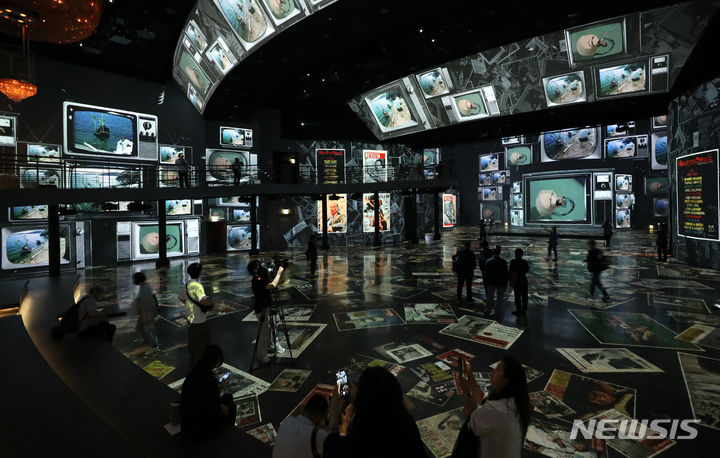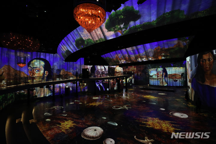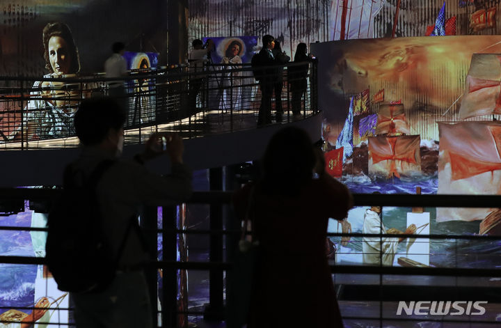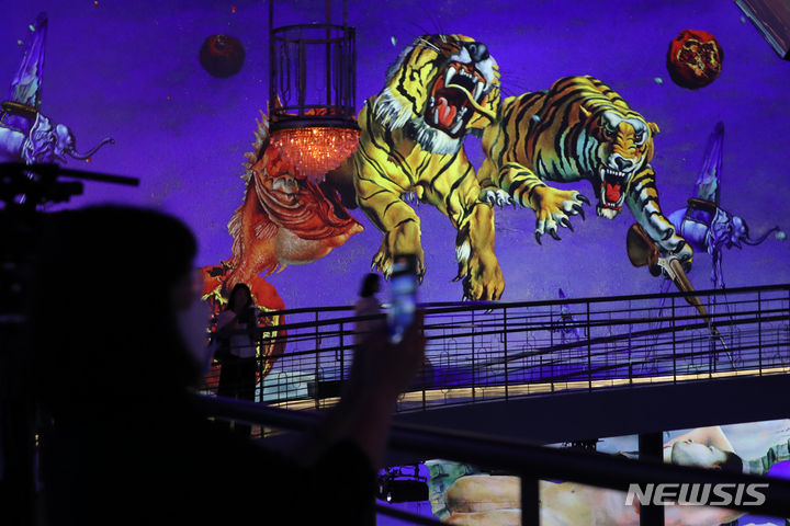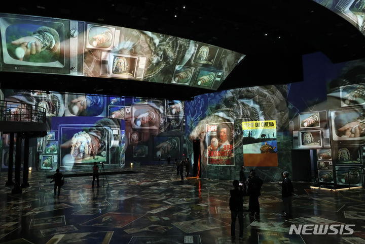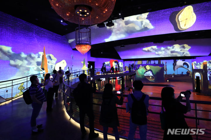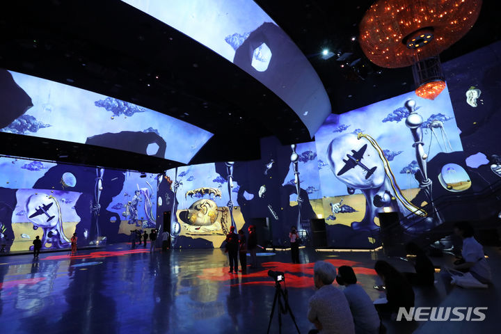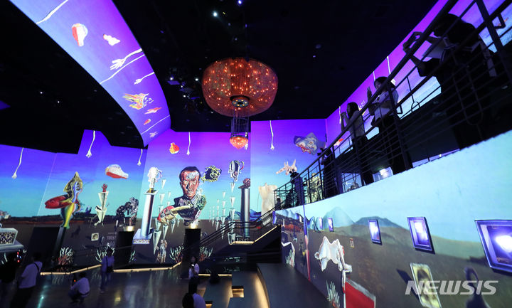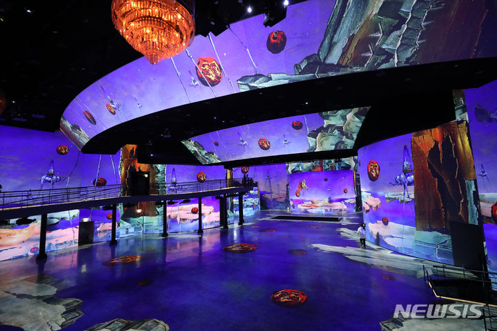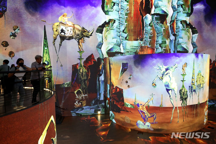 ソウル市広津区のグランドウォーカーヒル・ソウルで14日午前、「ダリ、終わりのない謎」プレビューが行われている様子。来年3月3日まで開催される今回の展示は、メディアファサード展示空間の「光のシアター」にシュールレアリスム(超現実主義)の画家サルバトール・ダリの作品世界を構築した。