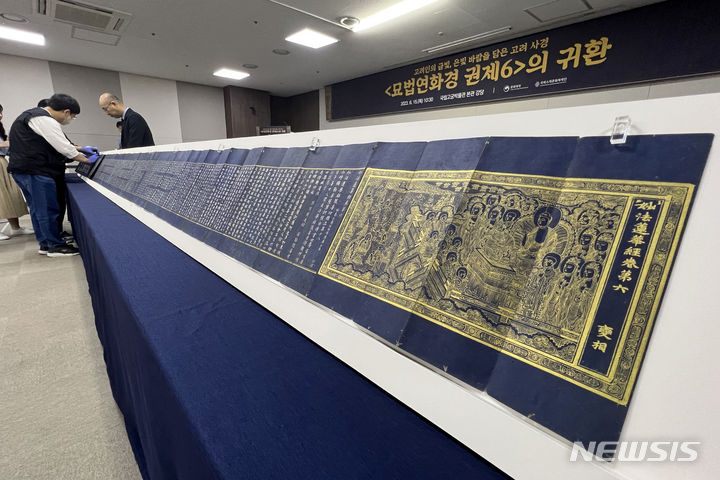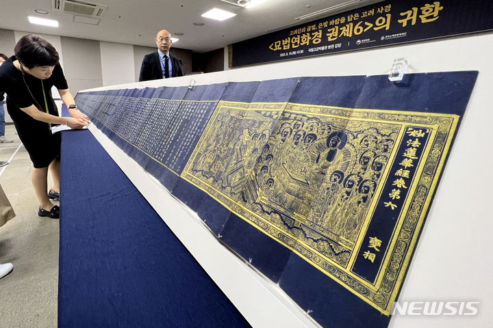 写経とは、仏教において経典を書写すること、または書写された経典を指す。本来仏教の教理を伝えるために製作されたが、次第に発願を通じて功徳を積む手段とされ、広く製作されてきた。「妙法蓮華経第6巻」は紺色の紙に経典の内容を金泥・銀泥で書き写し、折り本にする高麗写経で、大きさは、折ったときに縦27.6センチ×横9.5センチ、広げると横1070センチ、厚さ1.65センチだ。
