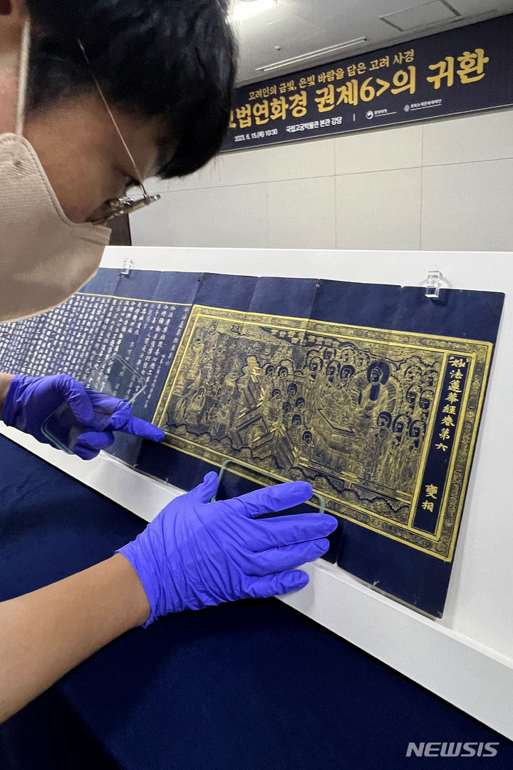 文化財庁の職員たちが15日、ソウル市鍾路区の国立古宮博物館で、国外所在文化財財団を通じて日本から還収した高麗写経「妙法蓮華経第6巻」メディア公開イベントの準備をしている。