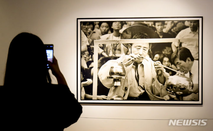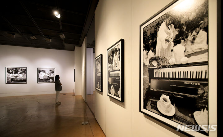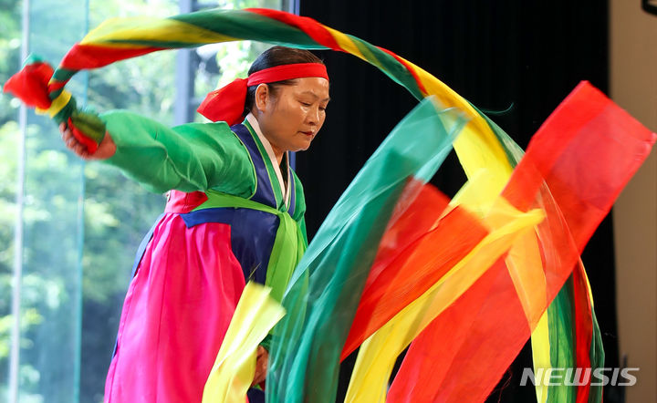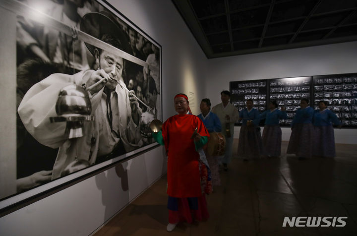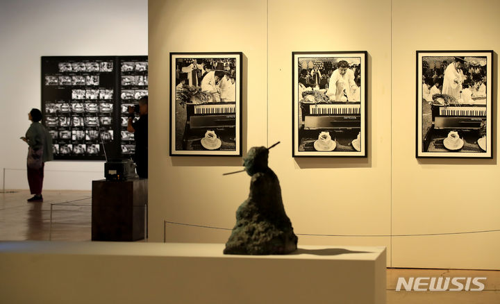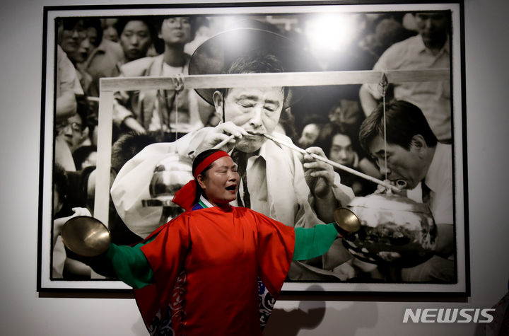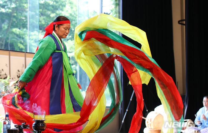 済州石文化公園の五百将軍ギャラリー内公演場で15日午後、済州大クッ保存会のシムバン(巫女)ソ・スンシルさんが、世界的なビデオアーティストのナム・ジュン・パイク(白南準〈ペク・ナムジュン〉)の霊を追悼する「クッ(シャーマニズムの祈祷)」を執り行っている。