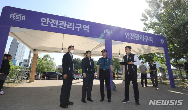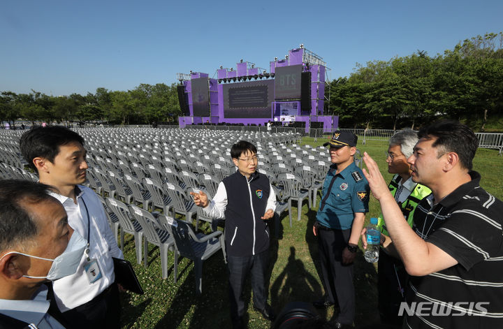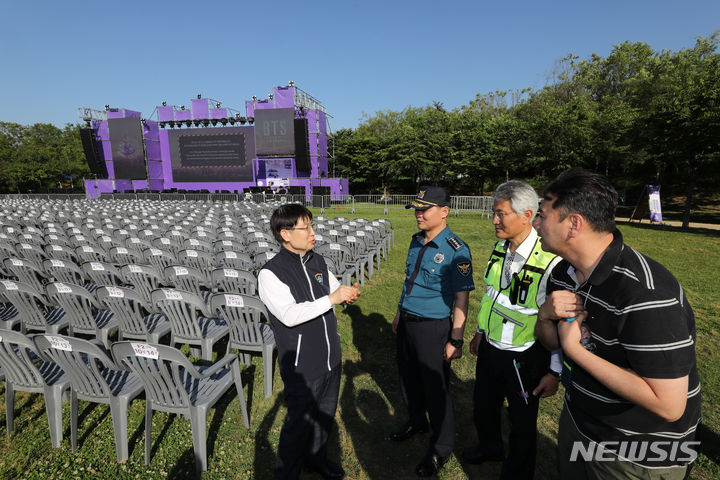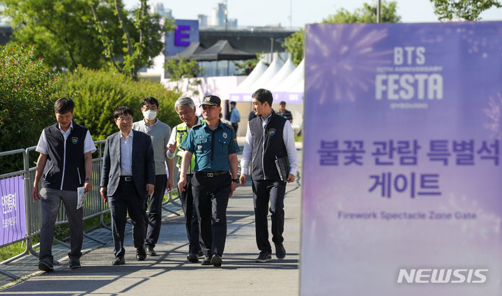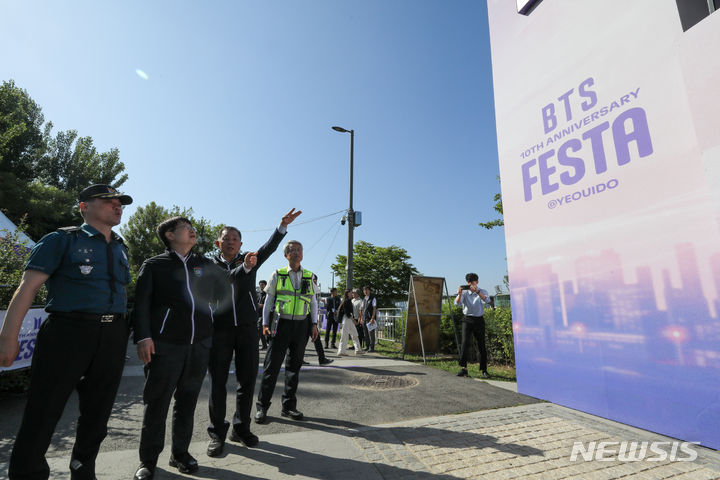 防弾少年団(BTS)のデビュー10周年を記念する「BTS FESTA」のメインイベントを翌日に控えた16日午後、ソウル・汝矣島の漢江公園で、ソウル市自治警察委員会や警察の関係者たちがイベント会場の点検を実施した。17日に予定されている防弾少年団デビュー10周年記念イベントは、昼12時から夜10時まで漢江公園で行われ、午後5時からはリーダーのRM(本名キム・ナムジュン)が登場するコーナー「午後5時、キム・ナムジュンです」が、午後8時30分からはデビュー10周年を祝う花火が予定されている。