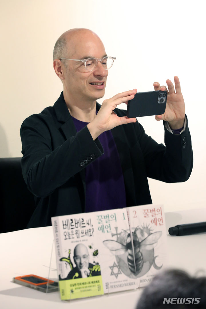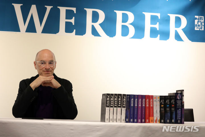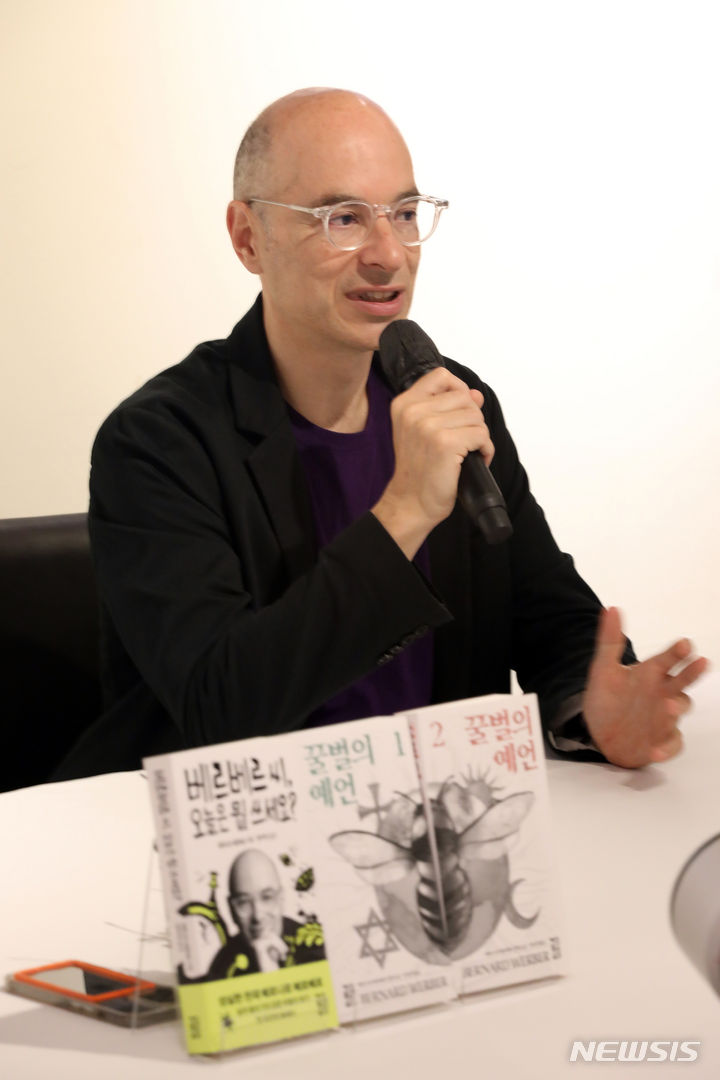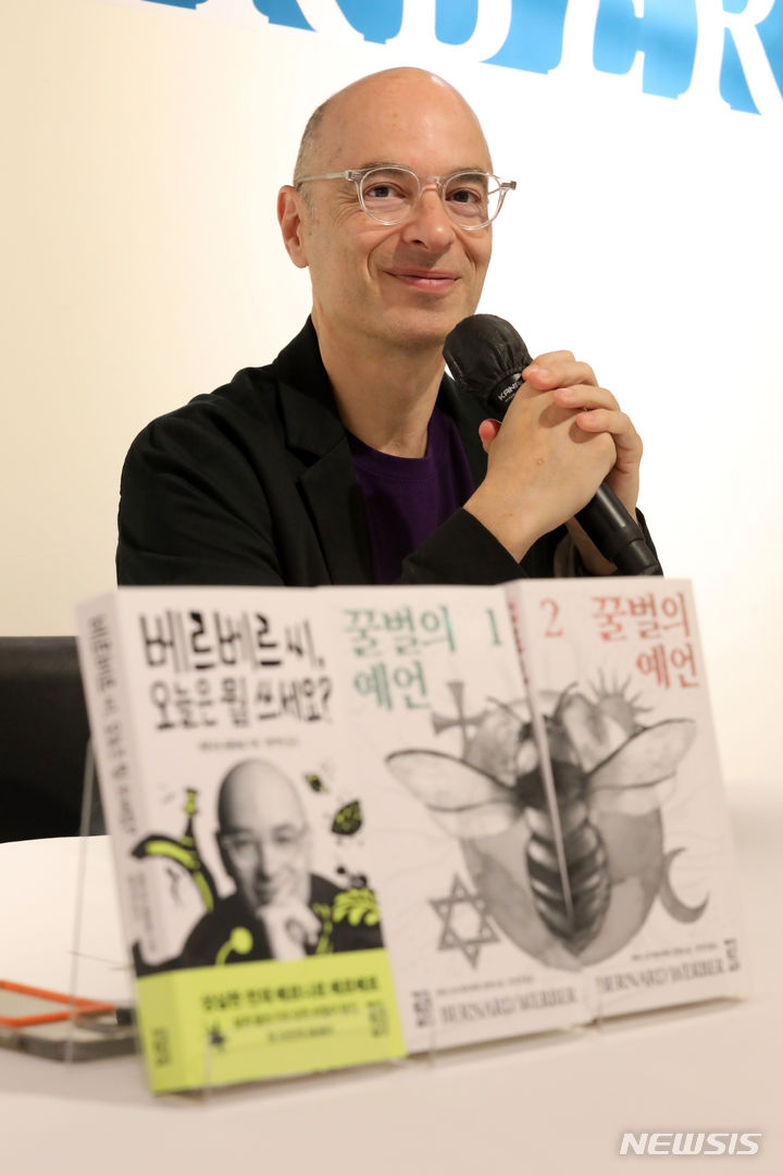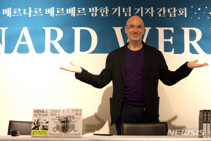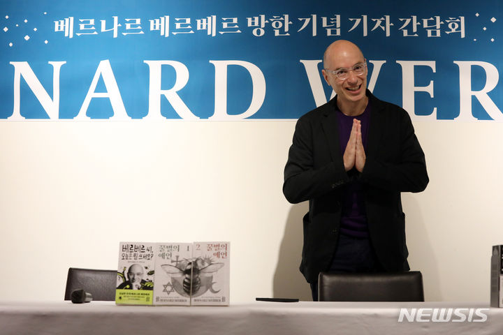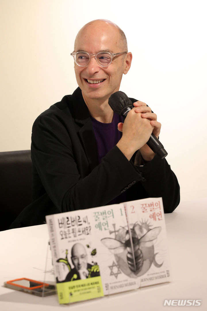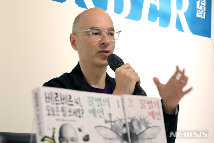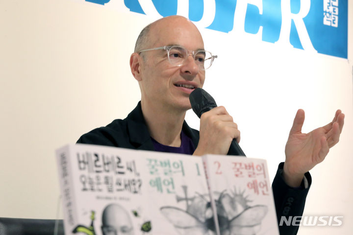 フランスの作家ベルナール・ウェルベルが28日、ソウル市中区の「タルゲビ(ツユクサ)」で訪韓記者懇談会を開いた。今回の韓国訪問は、ウェルベルの作家デビュー30周年と新作長編小説『ミツバチの予言』(La prophetie des abeilles)の出版に合わせる形で実現した。