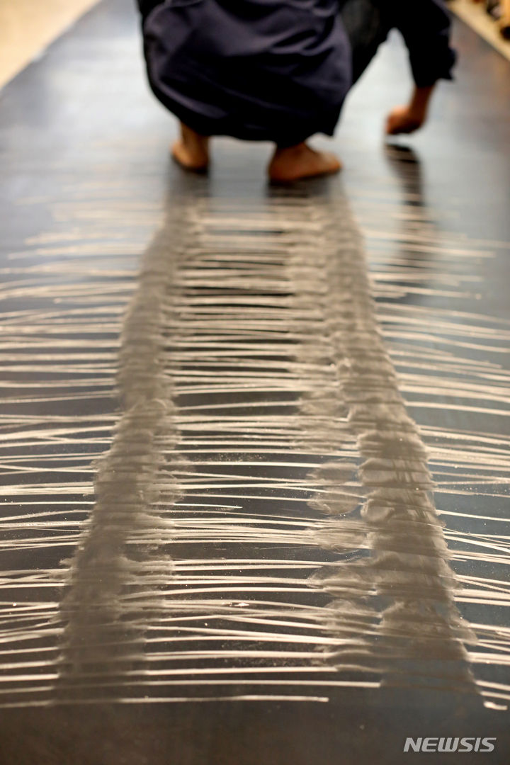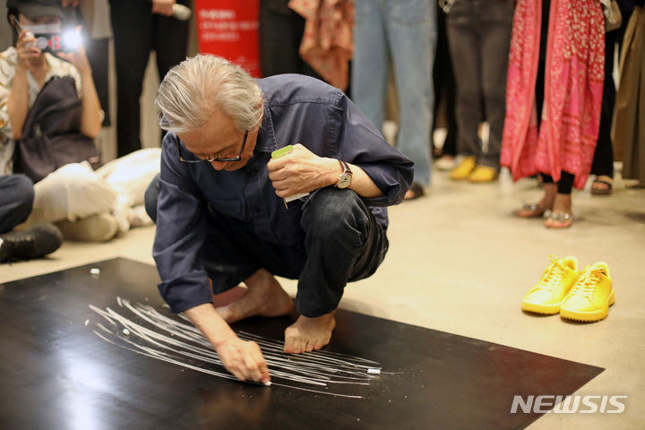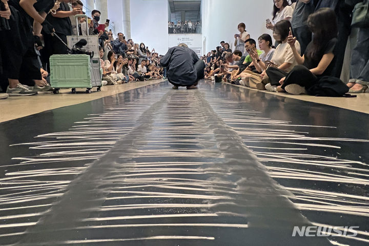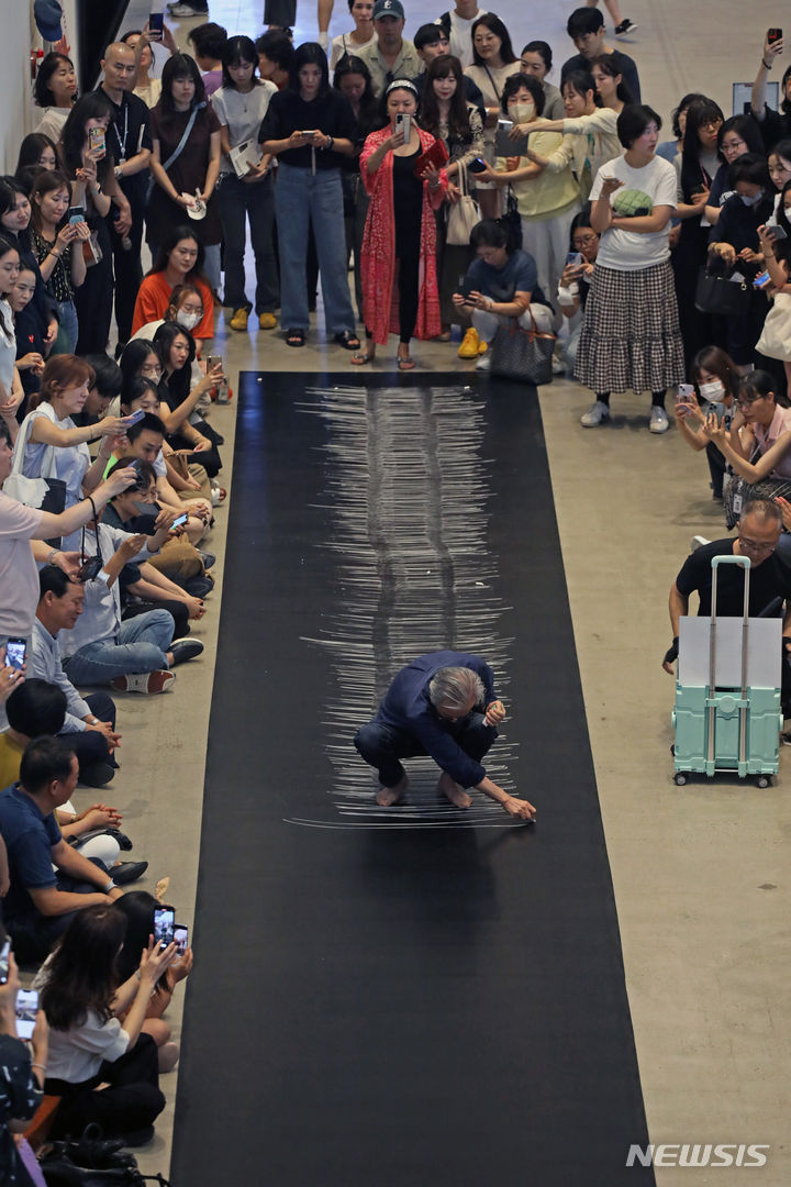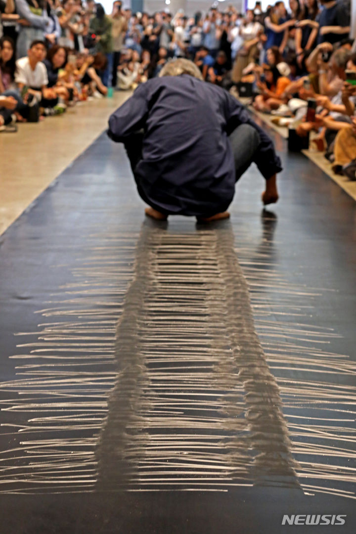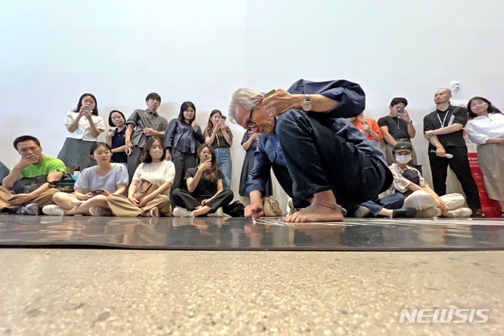 韓国の前衛美術第1世代で韓国実験美術の歴史といえるアーティスト、イ・ゴンヨンが21日、ソウル市鍾路区の国立現代美術館で、「韓国の実験美術 1960-70年代」展示の一環として「カタツムリ歩き」のパフォーマンスを行っている様子。描く行為と消す行為が同時に現れる「カタツムリ歩き」は、描いて消すことを繰り返す中で完成していく絵画の本質を語る。