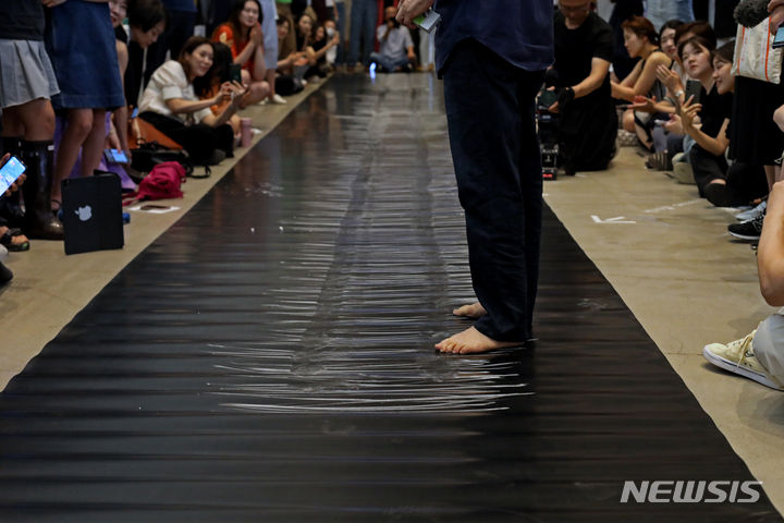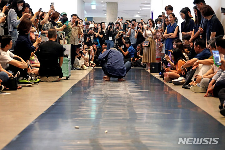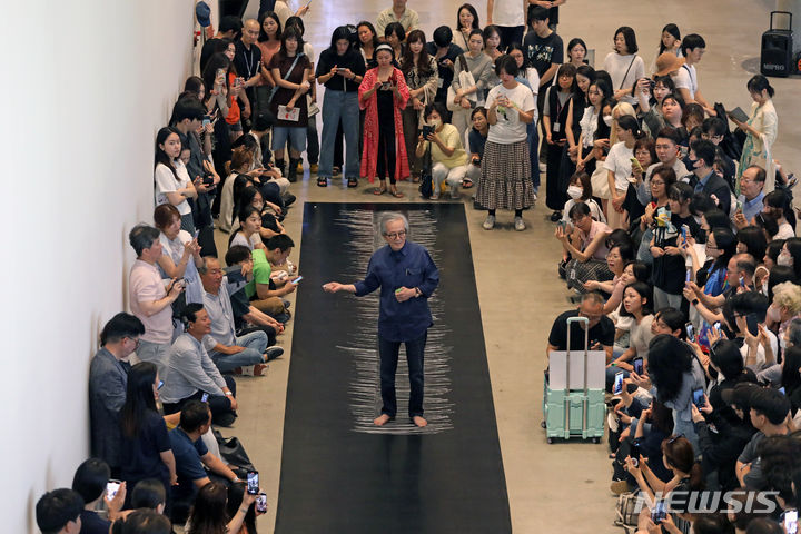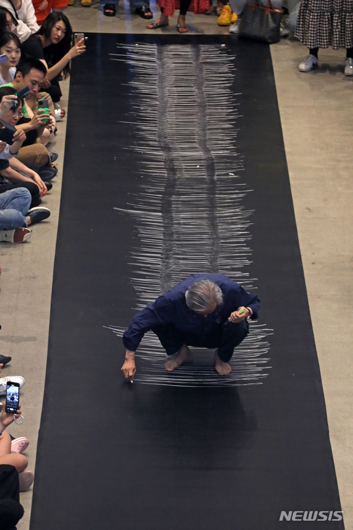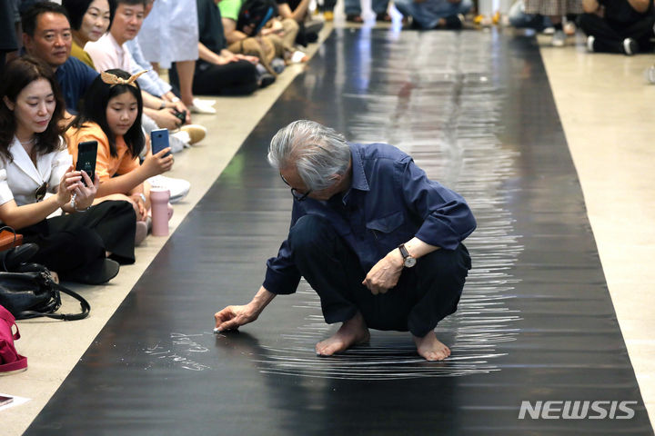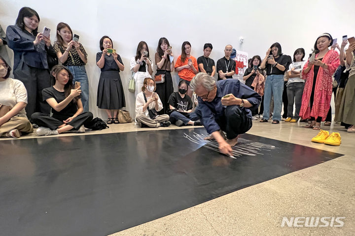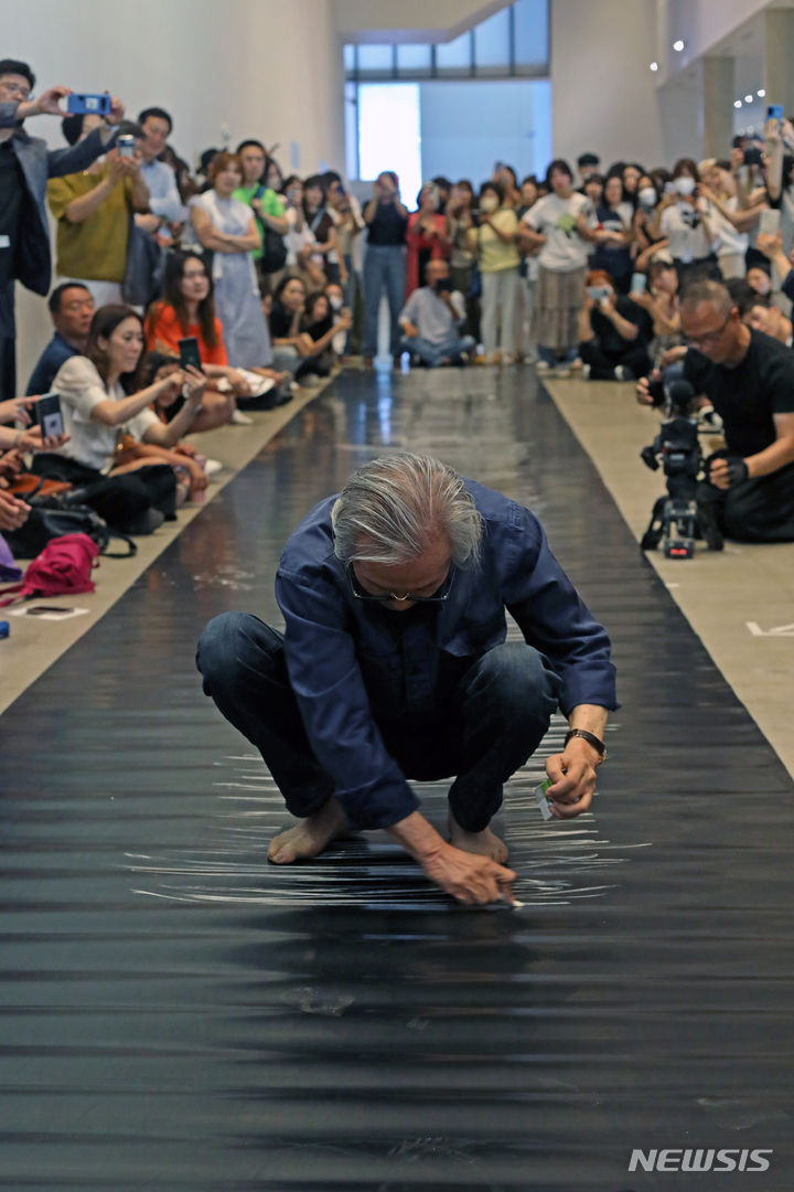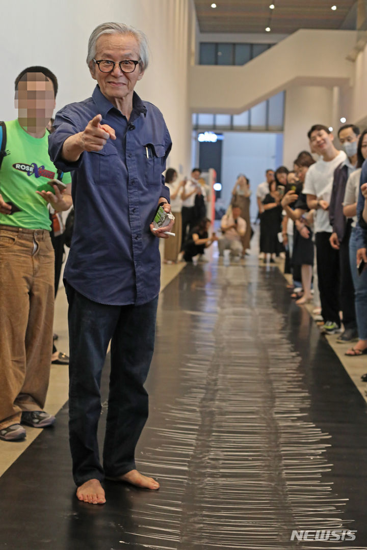 韓国の前衛美術第1世代で韓国実験美術の歴史といえるアーティスト、イ・ゴンヨンが21日、ソウル市鍾路区の国立現代美術館で、「韓国の実験美術 1960-70年代」展示の一環として「カタツムリ歩き」のパフォーマンスを行っている様子。描く行為と消す行為が同時に現れる「カタツムリ歩き」は、描いて消すことを繰り返す中で完成していく絵画の本質を語る。