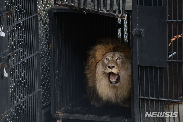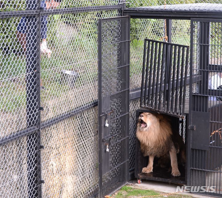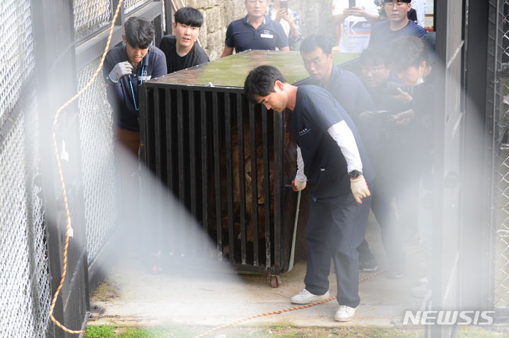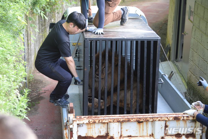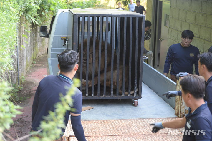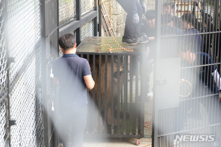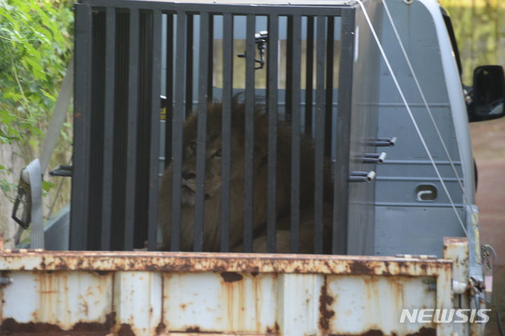 肋骨(ろっこつ)が浮き出るほどやせているプギョン動物園(慶尚南道金海市)の年老いたオスライオンが5日午後、忠清北道清州市内の清州動物園に到着し、関係者らによって野生動物保護施設に運ばれた。