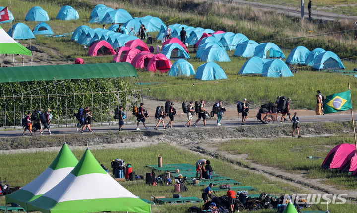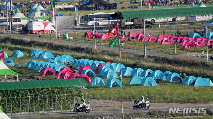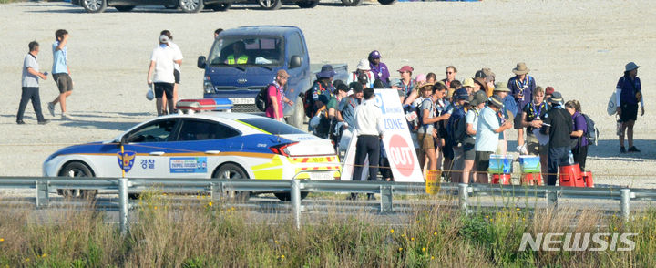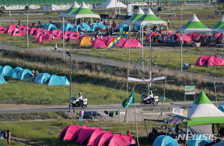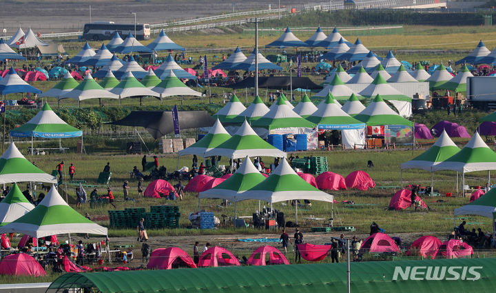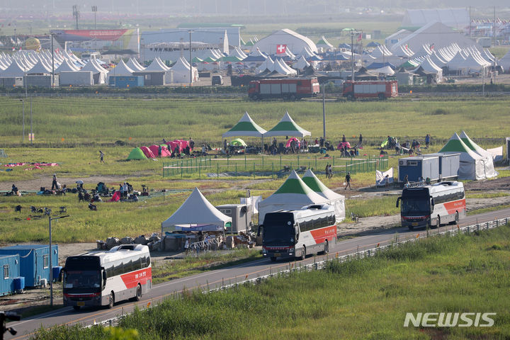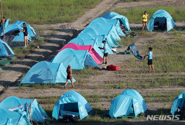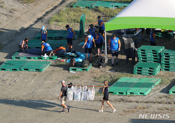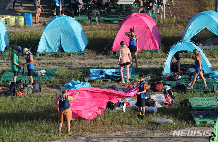 【NEWSIS】8日午前、全羅北道扶安郡セマングムの「第25回世界スカウトジャンボリー」キャンプ地で、早期撤収の準備をする隊員たち。世界スカウト連盟は前日の7日、台風6号が韓半島(朝鮮半島)に向かって北上しているのを受け、韓国政府と協議してジャンボリー開催地のセマングム・キャンプ地から早期撤収することを決めた。