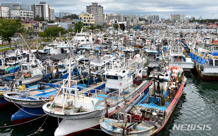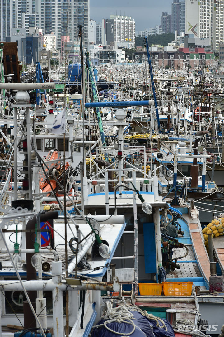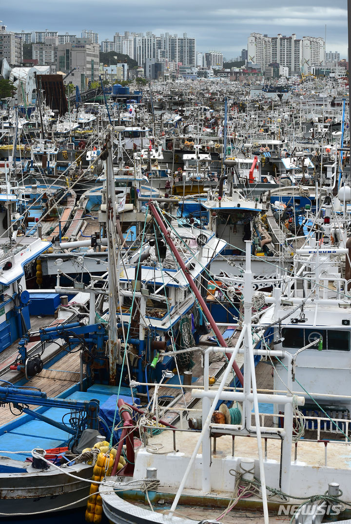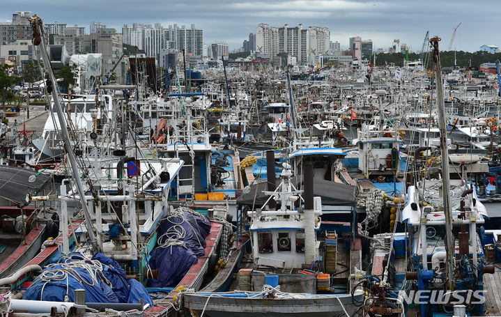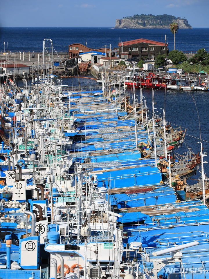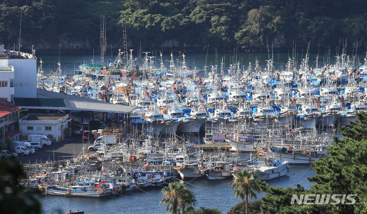 【NEWSIS】台風6号が方向を変え、韓国に向かって北上している8日午前、済州特別自治道西帰浦市の西帰浦港では、避難した漁船が停泊していた。気象庁によると、台風6号は10日未明、済州島の東方海上に最接近するものと予想される。