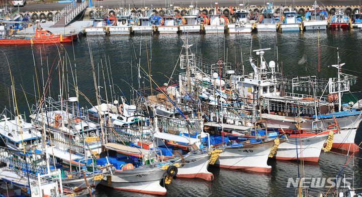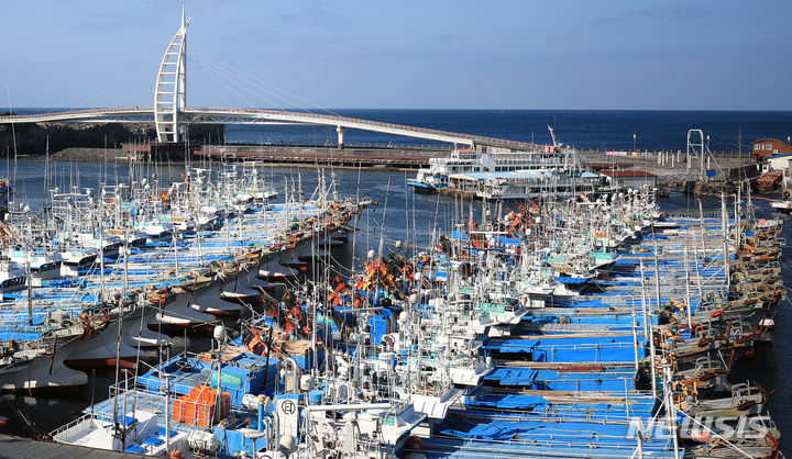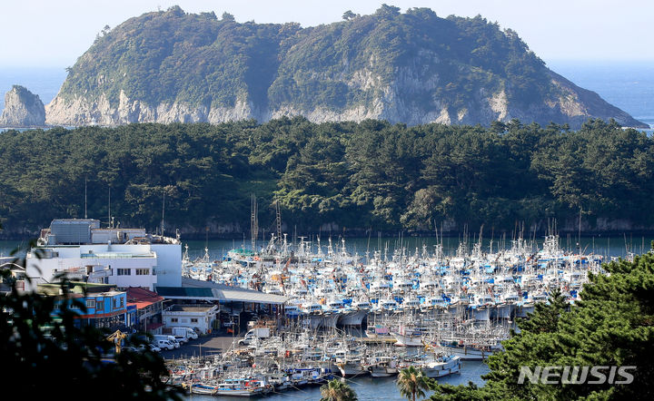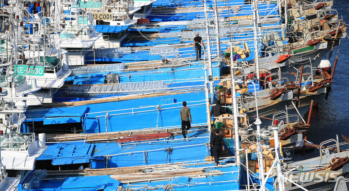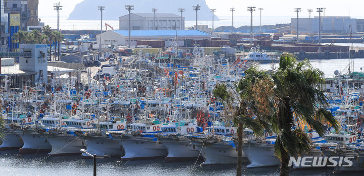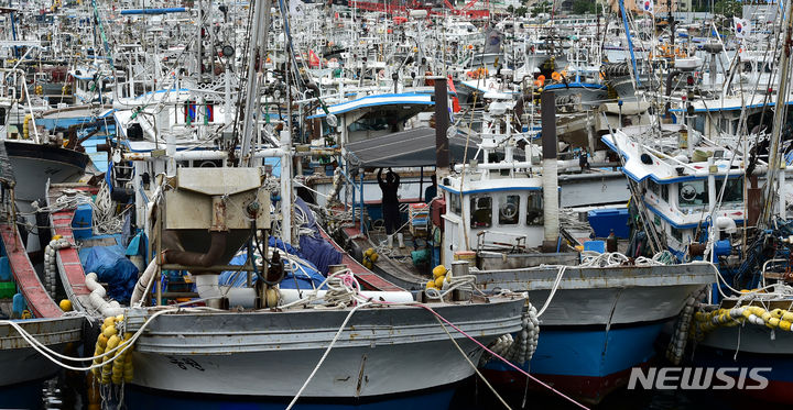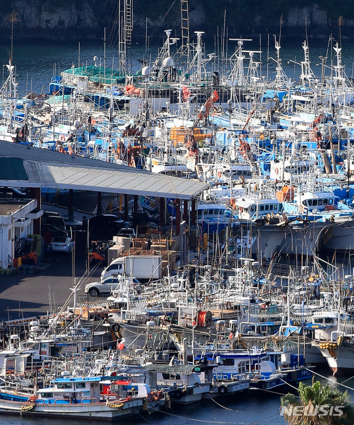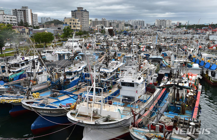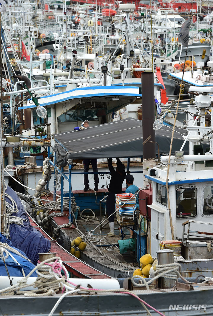 【NEWSIS】台風6号が方向を変え、韓国に向かって北上している8日午前、済州特別自治道西帰浦市の西帰浦港では、避難した漁船が停泊していた。気象庁によると、台風6号は10日未明、済州島の東方海上に最接近するものと予想される。