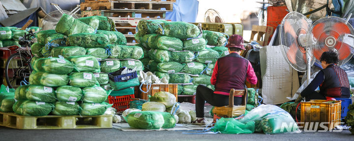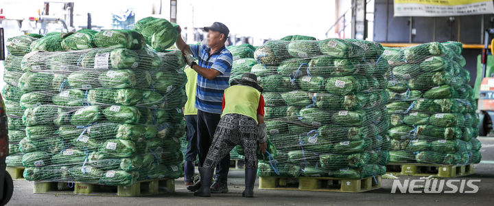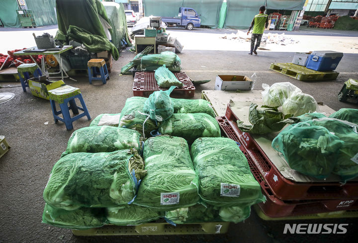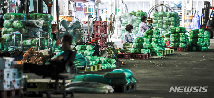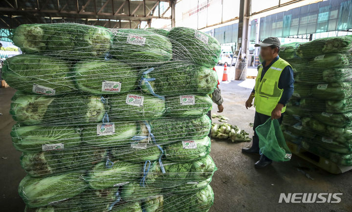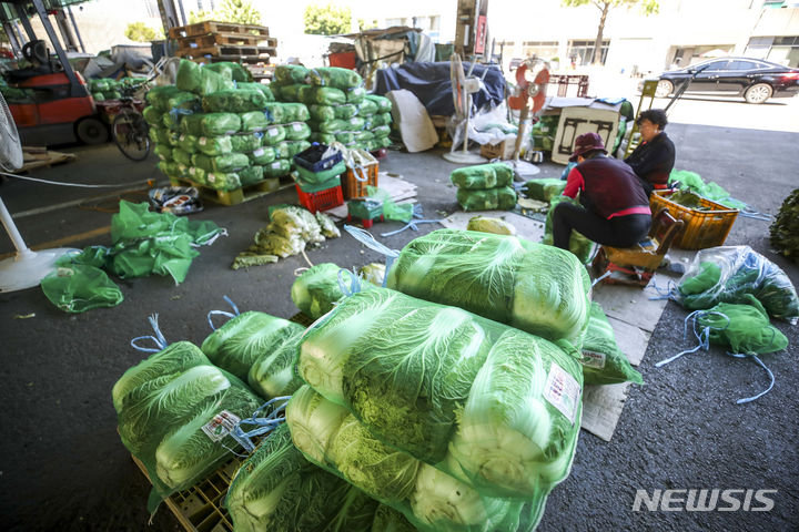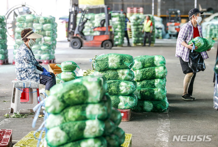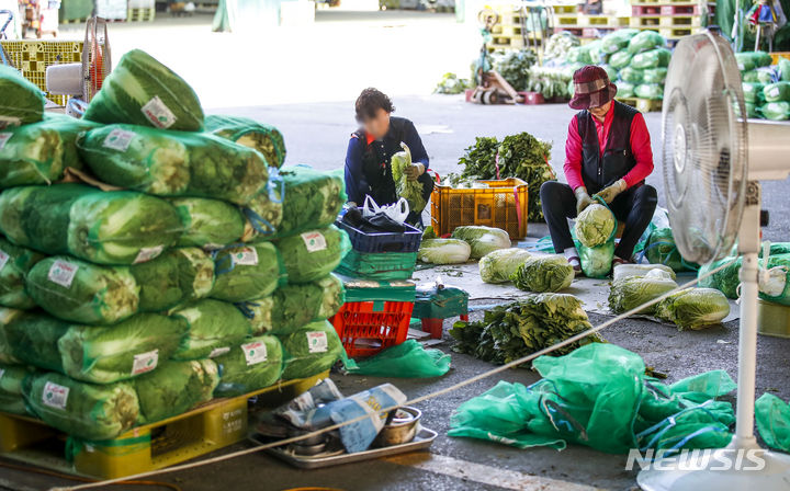 集中豪雨に続き猛暑に見舞われ、ハクサイの価格がわずか1週間で70%以上も上がったことが判明した。農産物流通情報によると、ハクサイの卸売価格は今月4日現在で10キロ2万240ウォン(現在のレートで約2207円。以下同じ)を付け、1週間前(1万1572ウォン=約1262円)より74.9%も値段が上がった。これは、1カ月前より118.4%、1年前と比べると2.8%高い。写真は8日、ソウル市松坡区の可楽市場でハクサイを整理している商人らの様子。