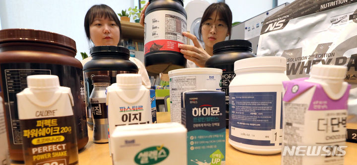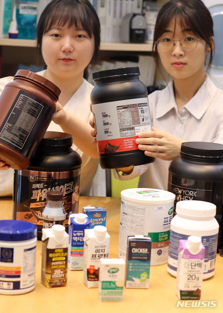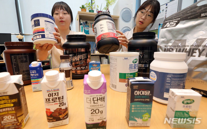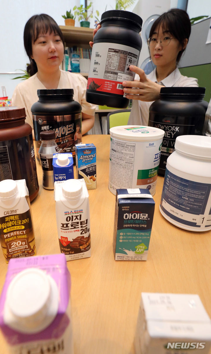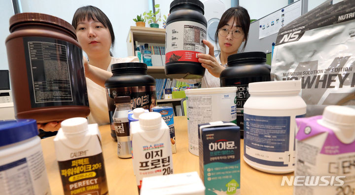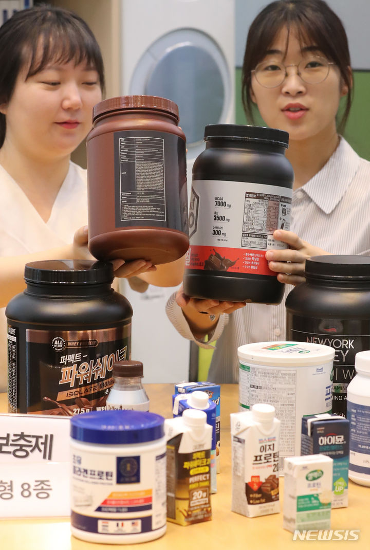 韓国消費者院の関係者が8日、世宗市の政府世宗庁舎で、消費者選好度が高いタンパク質サプリメント16種類を対象にタンパク質の含有量などを試験評価した結果を発表した。それによると、製品ごとに栄養成分の含有量に差があり、個人に合った摂取量を調整する必要があるという。