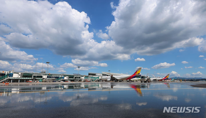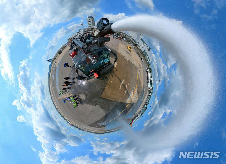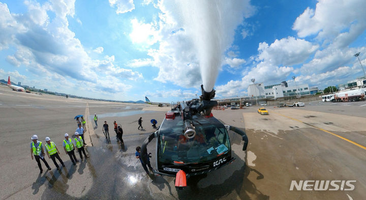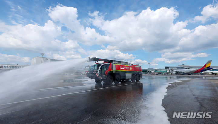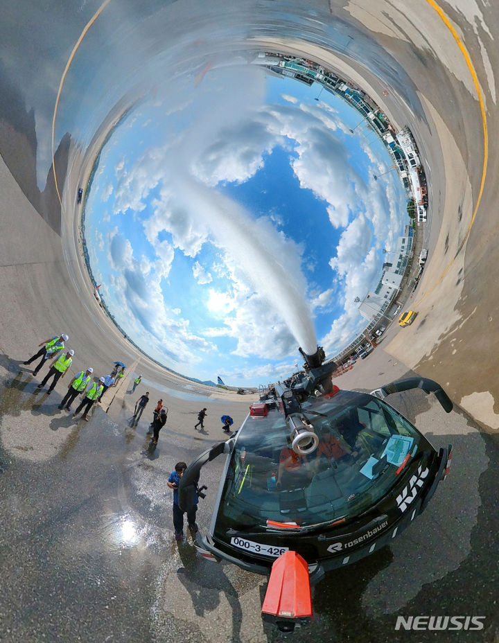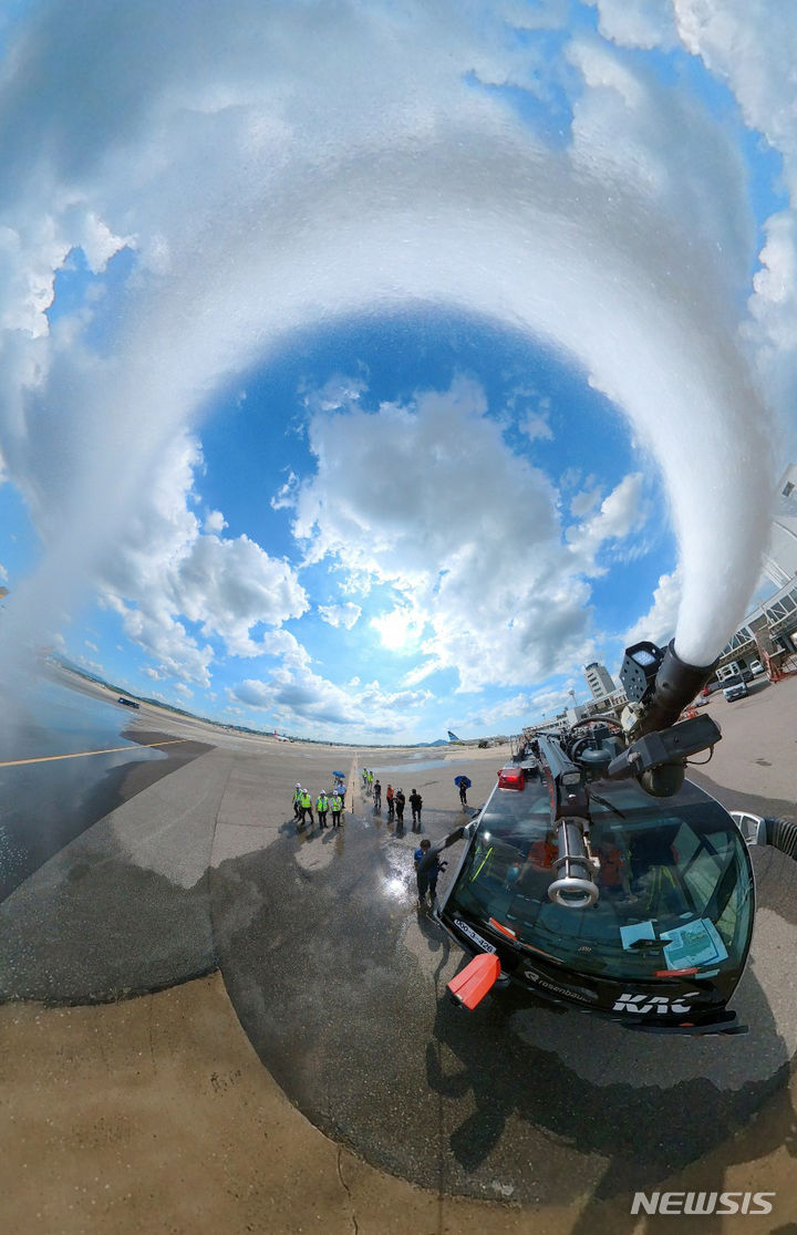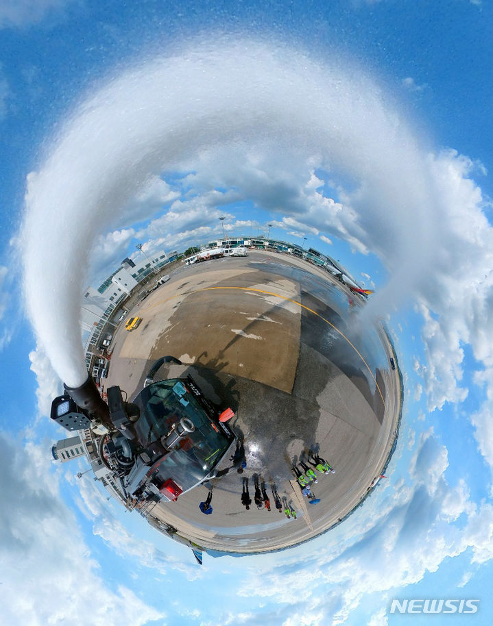 ソウルの金浦空港の駐機場で8日午後、特殊散水車両や消防車を動員した航空機移動地域散水作業が行われている様子。