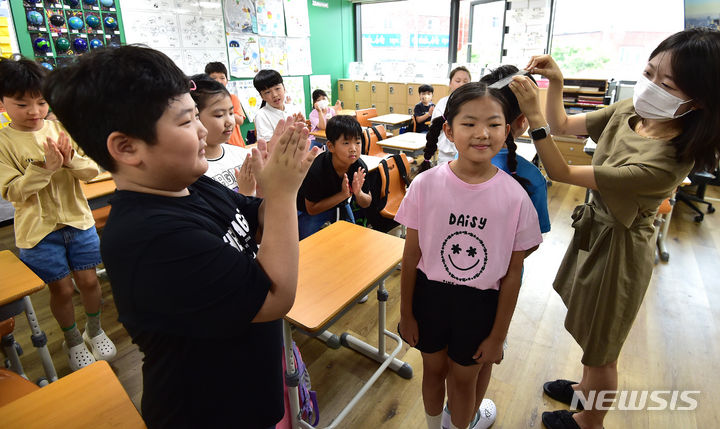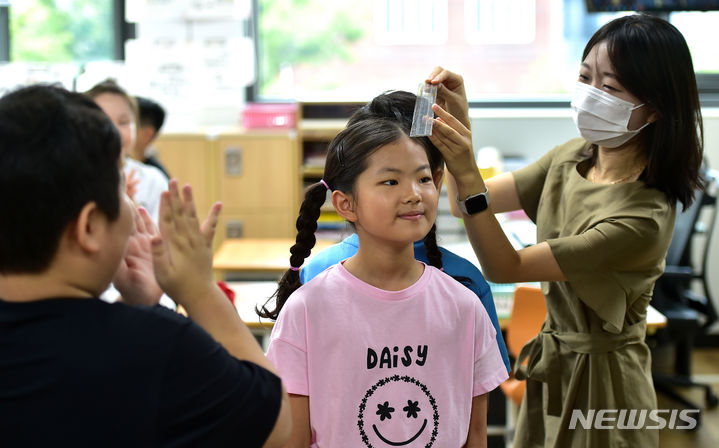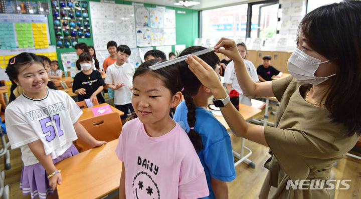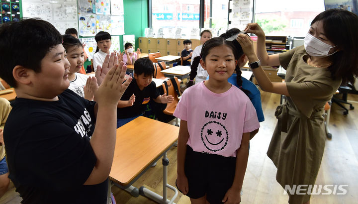新学期を迎えた28日午前、大邱市中区の大邱小学校では、3年2組の子どもたちが友人たちと背比べをしていた。