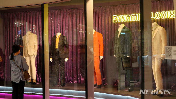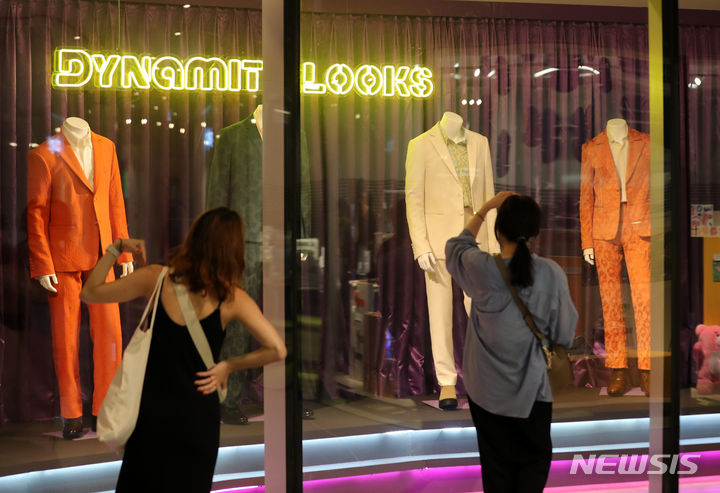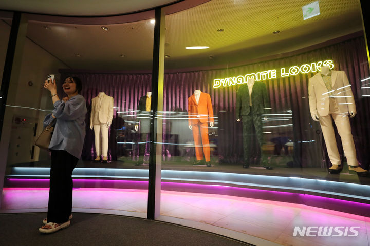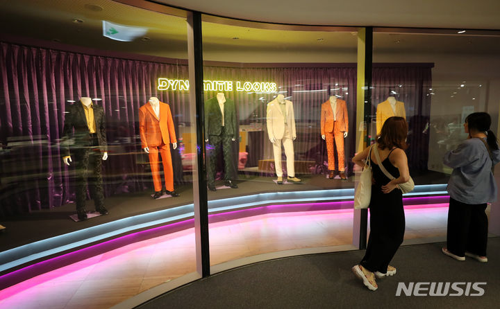 【NEWSIS】8月31日、ソウル東大門デザイン・プラザ(DDP)で「2023 DDP AUTUMN FESTIVAL(オータム・フェスティバル)」が始まった。写真は同フェスティバルの「Dynamite Looks(ダイナマイト・ルックス):BTSグラミー賞ステージ衣装展示withイーランド・ミュージアム」の展示を見る入場者たち。