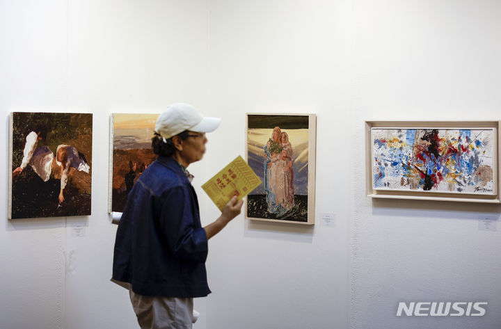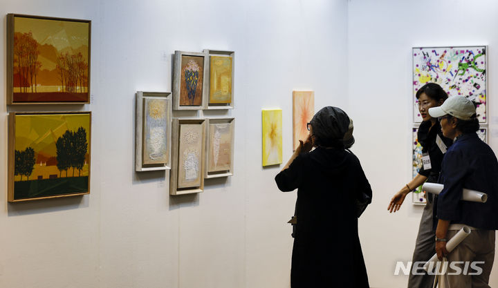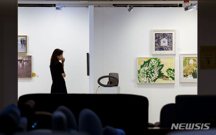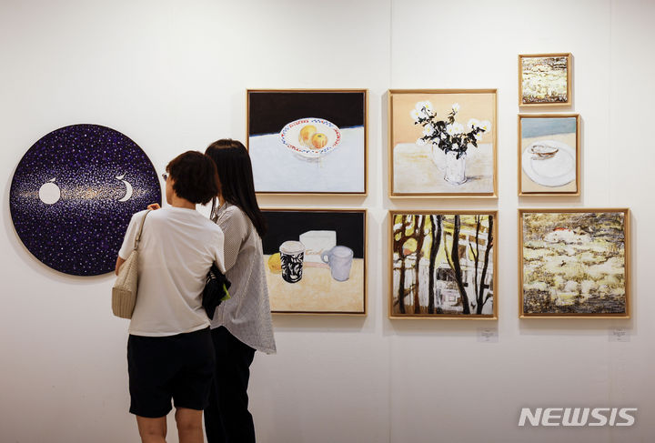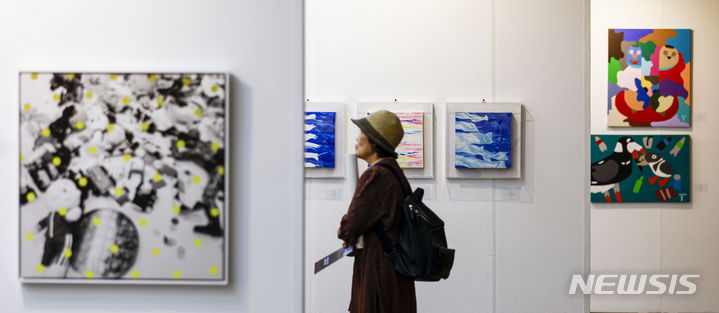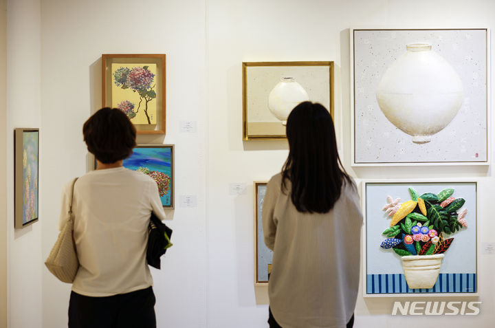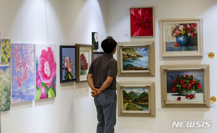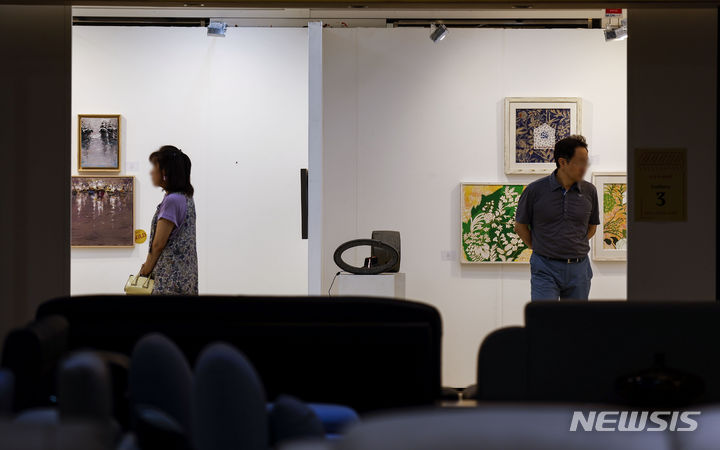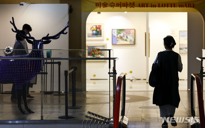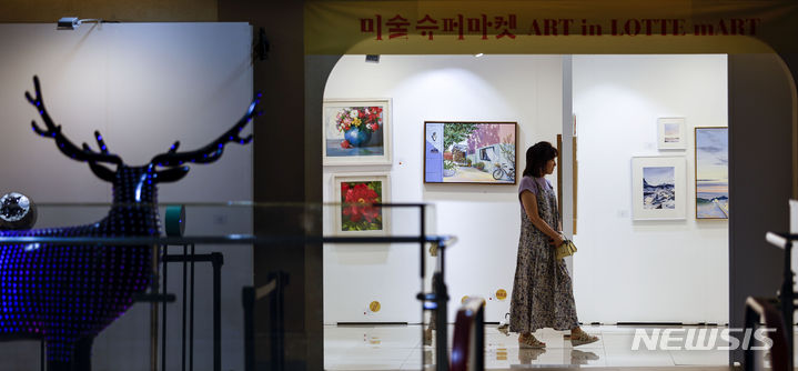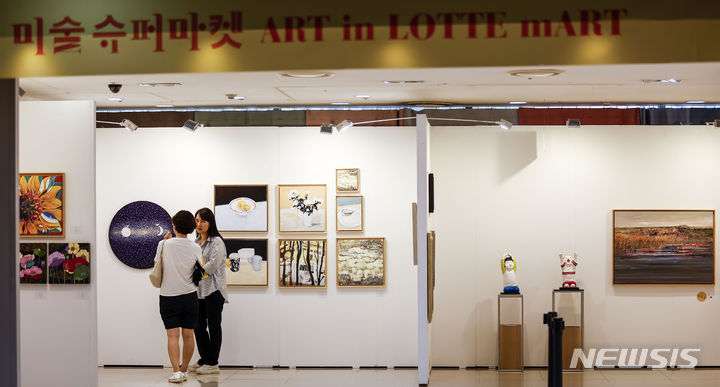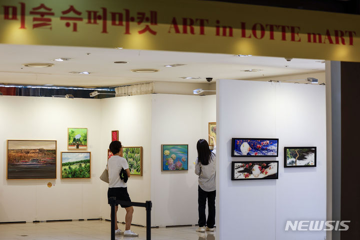 4日、ソウル市松坡区の大手スーパー「ロッテマート松坡店」特別展示場で開かれた「アート・イン・ロッテマート:美術スーパーマーケット」を訪れた人々が、美術作品を見て回っている様子。