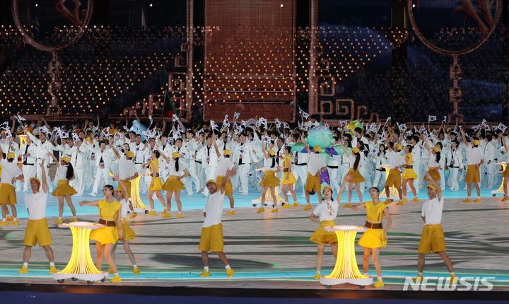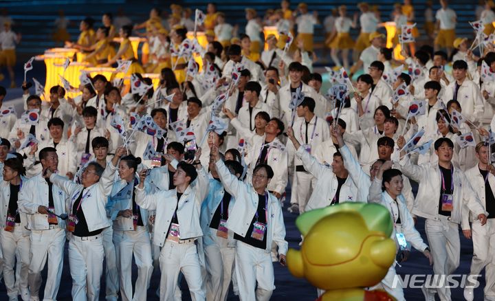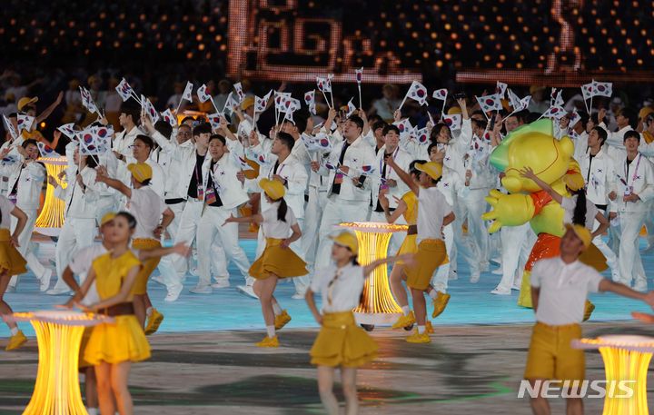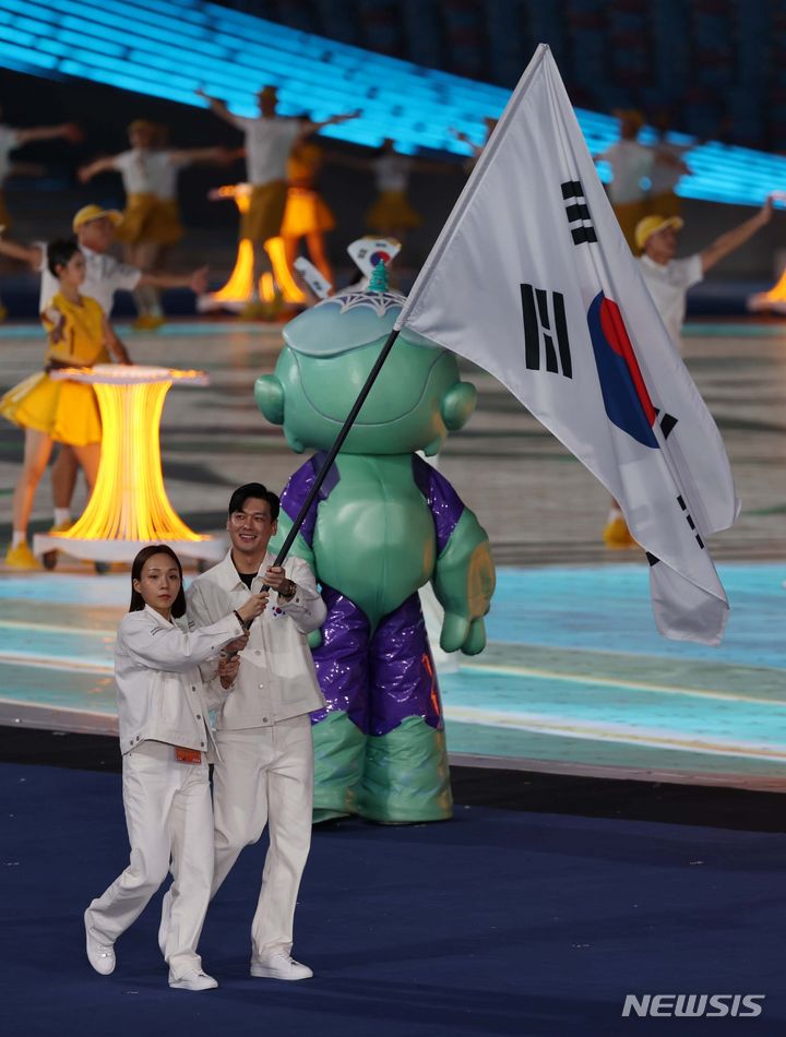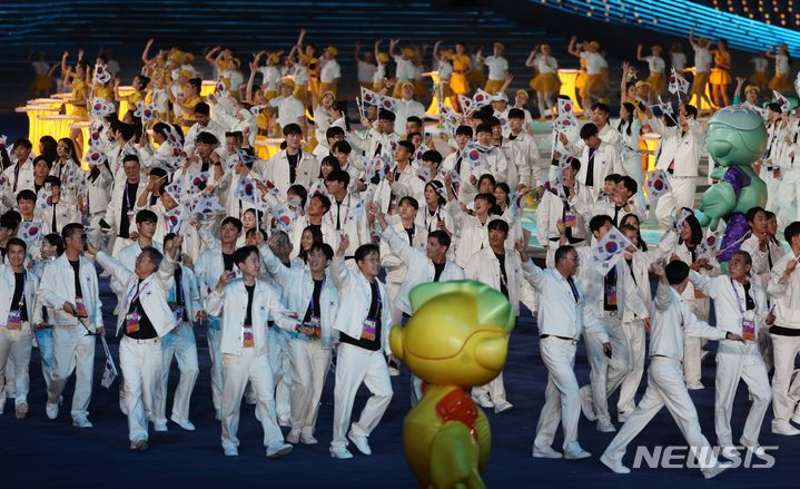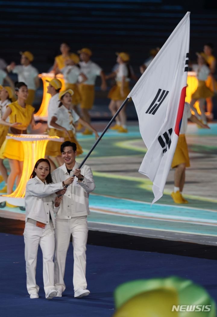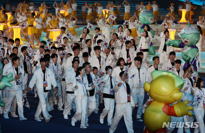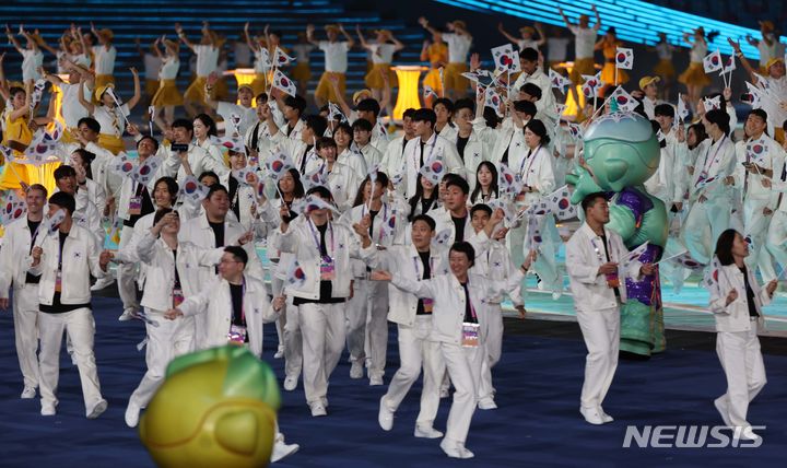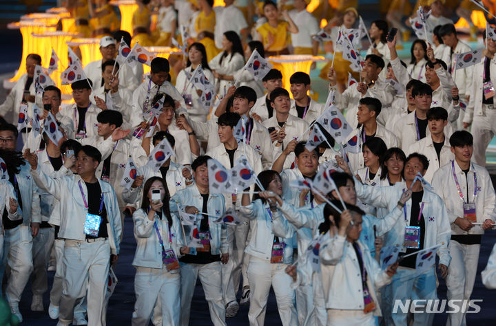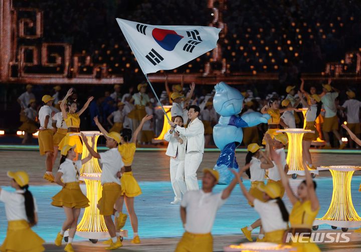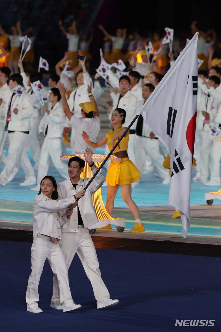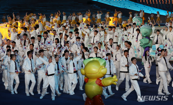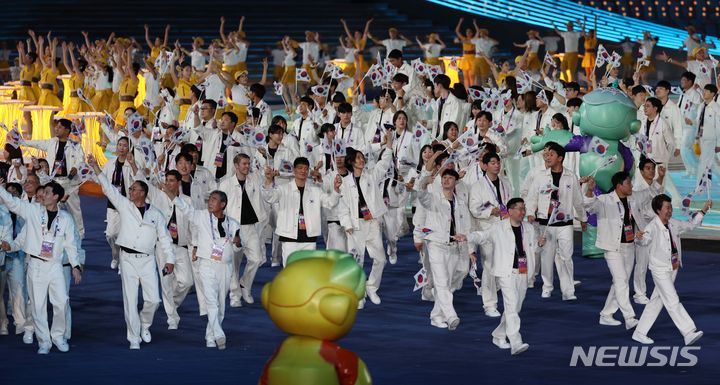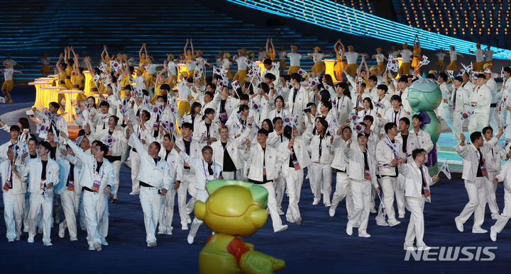 中国・杭州オリンピックスポーツセンターのスタジアムで23日、第19回アジア競技大会(2022/杭州。2023年開催)の開幕式が開かれ、韓国選手団が入場しているところ。