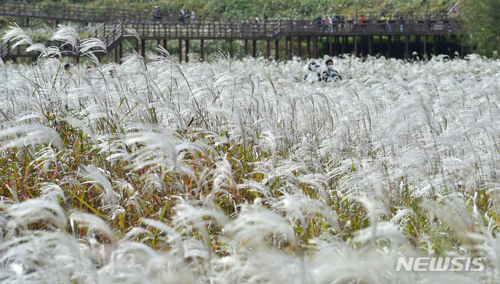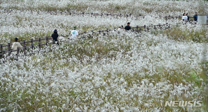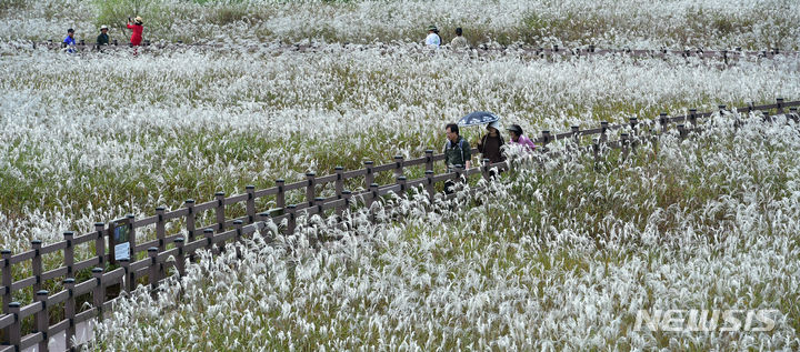 はっきりと秋の天気になった9日、大邱市達西区の大明遊水池では、訪れた市民がススキの散策路を歩きながら深まりゆく秋を満喫していた。