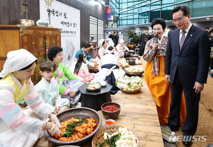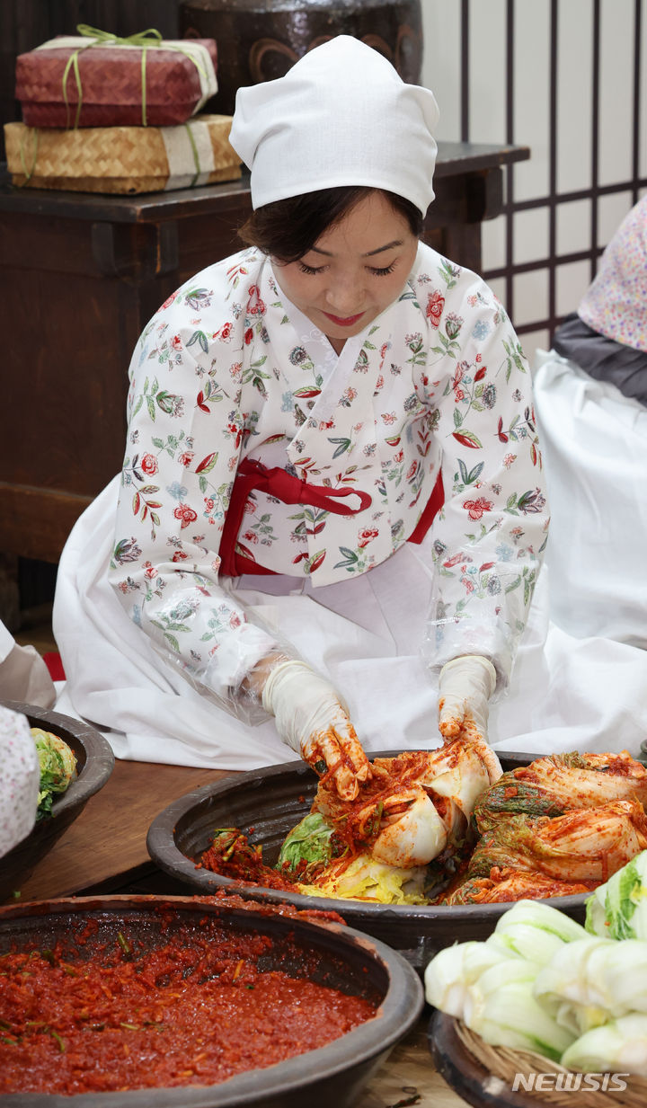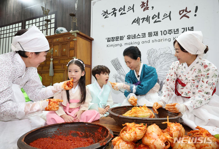 ソウル市瑞草区のaTセンターで22日午前、2023第4回「キムチの日」記念式典が開かれ、子どもたちがキムジャン(冬場に向けたキムチの漬け込み)文化を体験している様子。