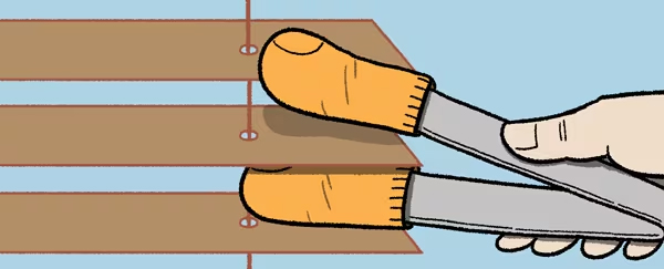 トングの両端に古い靴下をかぶせ、ブラインドのスラット(羽根)の間に入れて左右に動かすようにふくと、ぞうきんで1枚ずつふくよりも楽で簡単にきれいにできる。