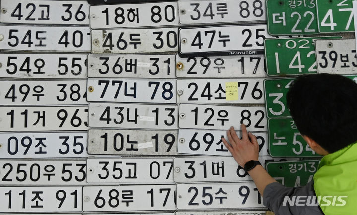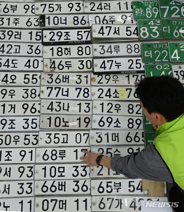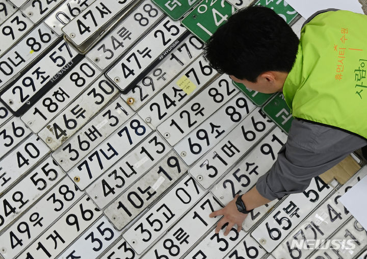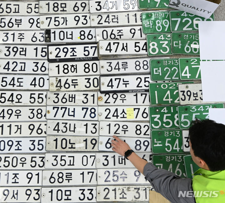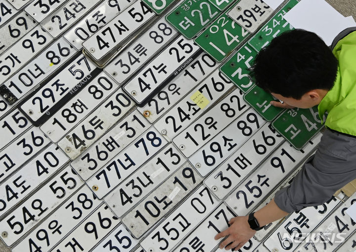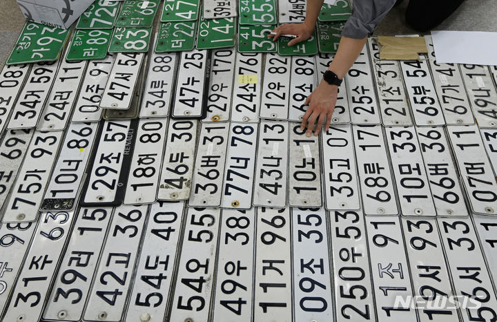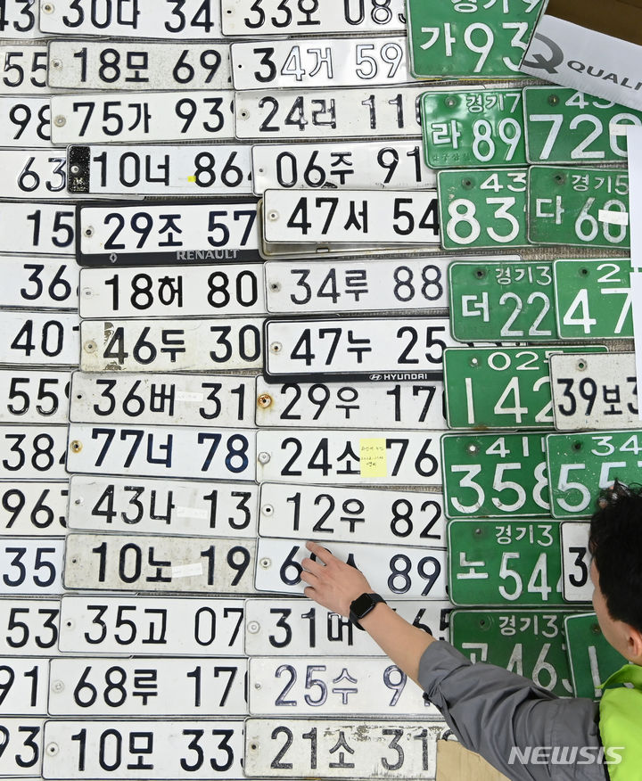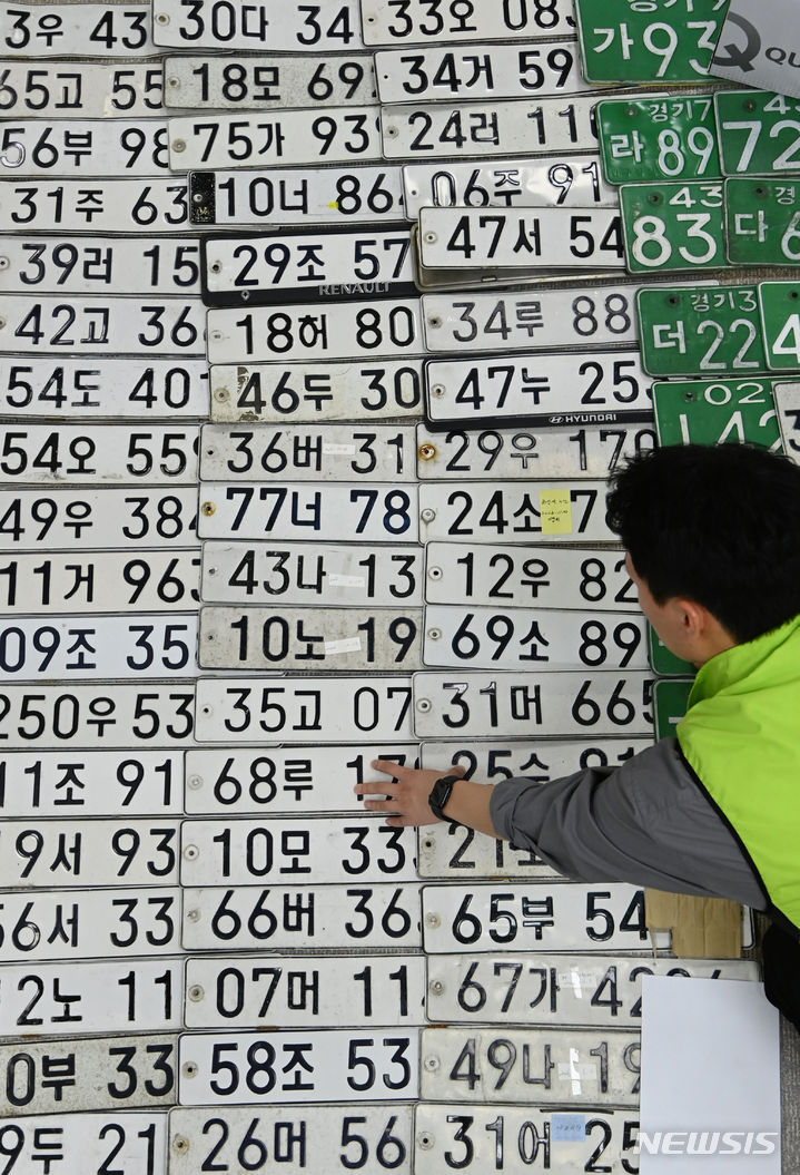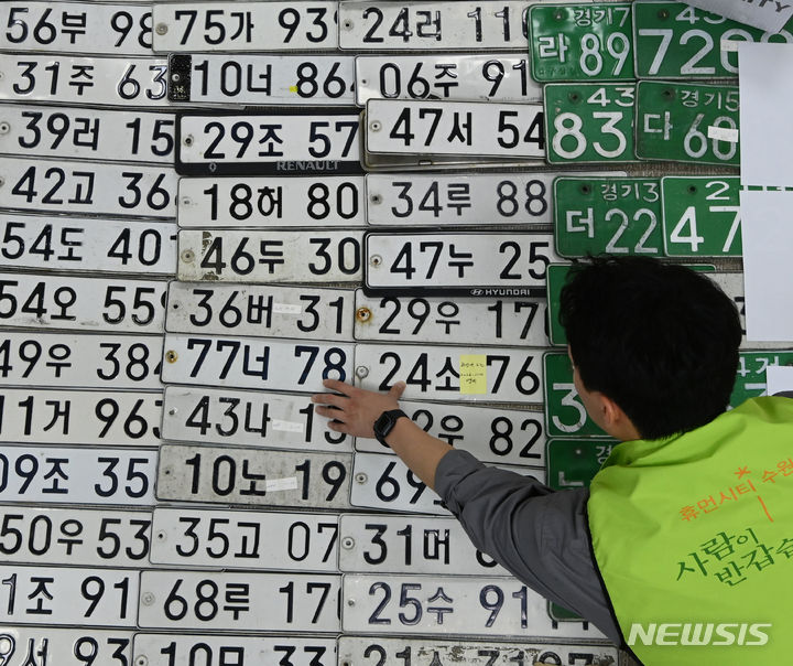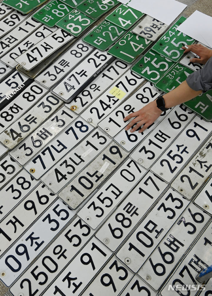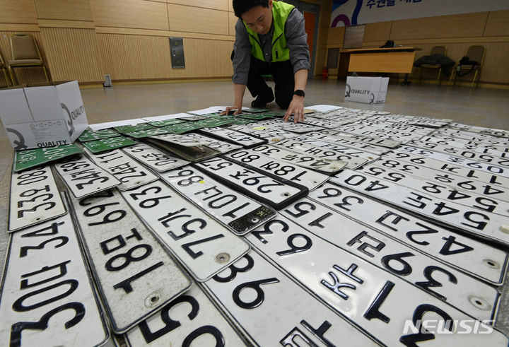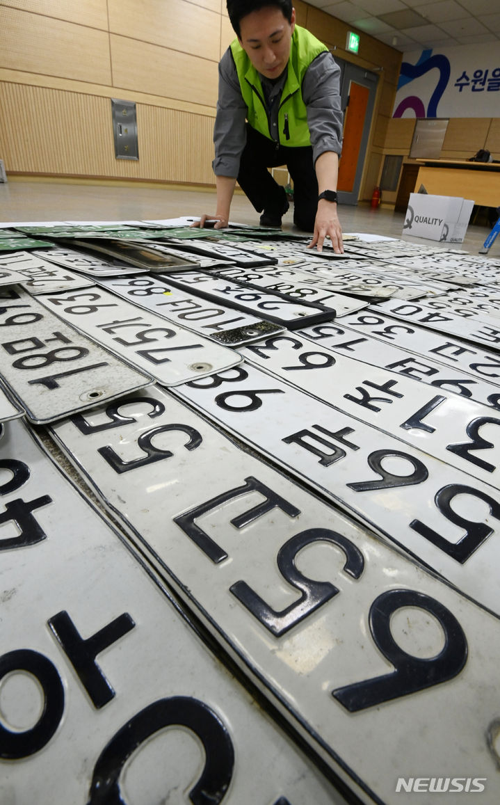 下半期京畿道滞納車両一斉取り締まりが行われた29日、京畿道水原市の八達区庁で、税務課徴収チームの職員が滞納車両から領置したナンバープレートを確認しているところ。取り締まりの対象は自動車税を3回以上、もしくは自動車関連の過料30万ウォン(約3万4200円)以上を滞納した車で、住宅街・多衆密集地域・公用駐車場など車両密集地域を中心にナンバープレートを領置した。
