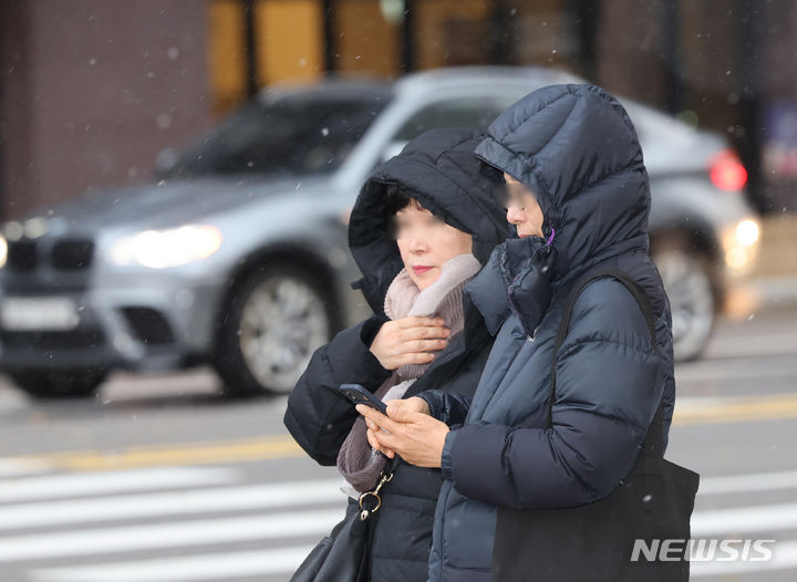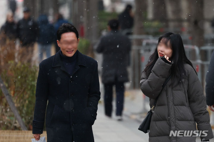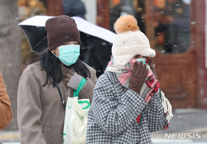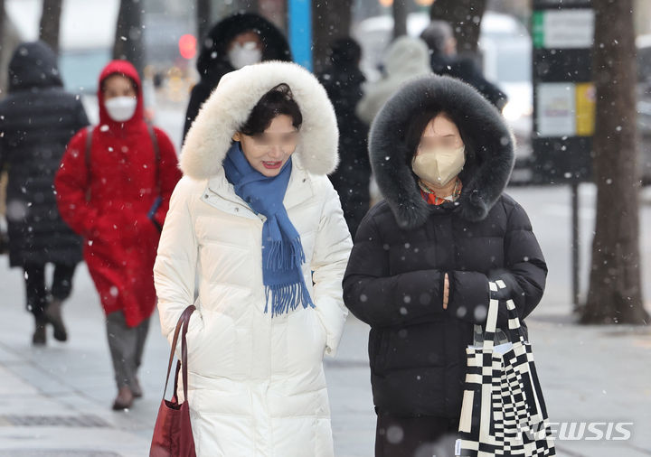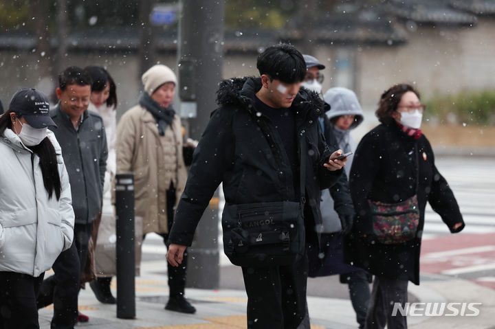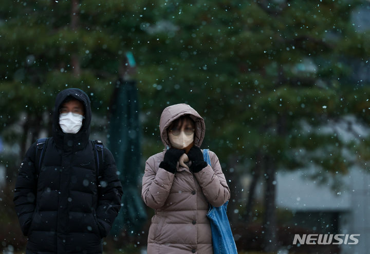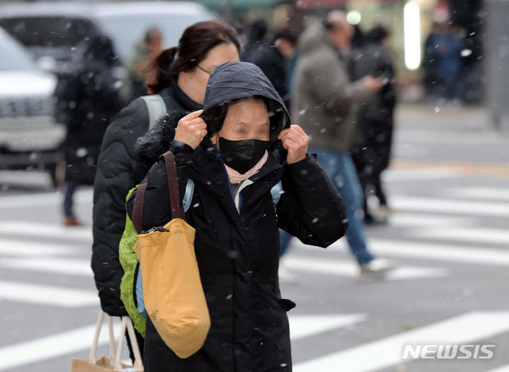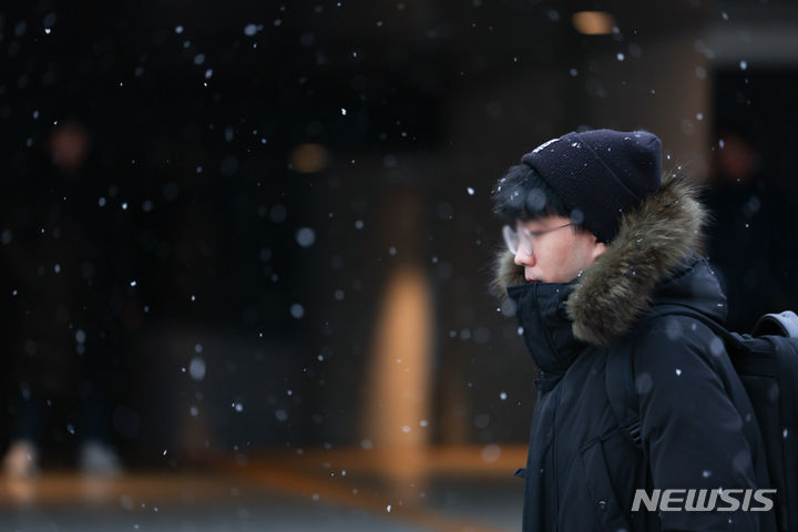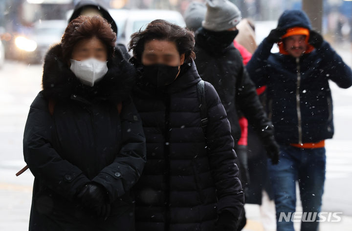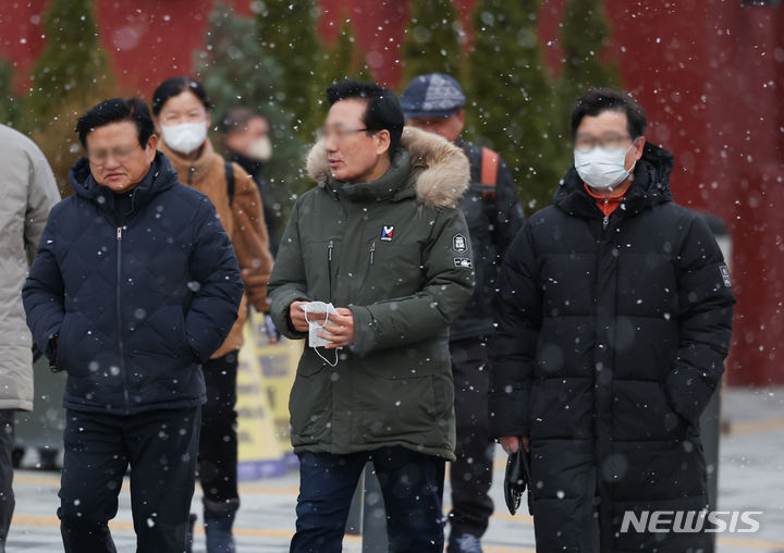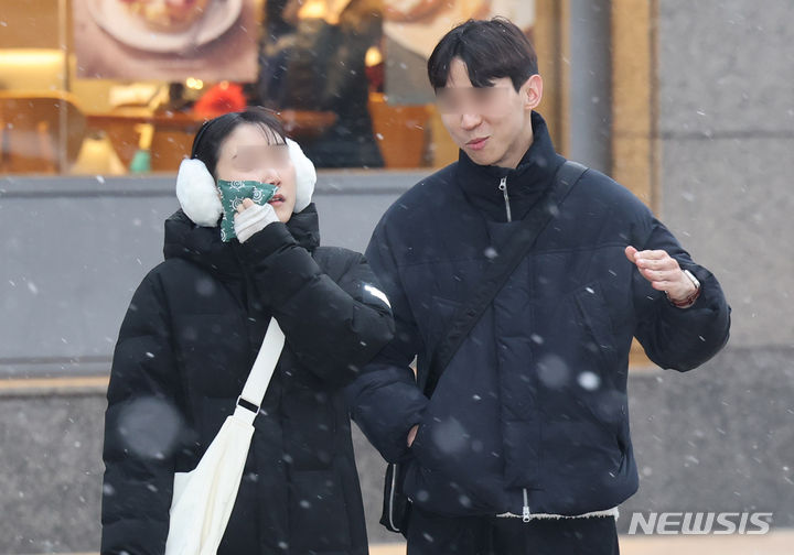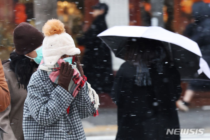 29日午後、ソウル市中区の世宗大路一帯で、雪が降る中を行き交う市民の様子。