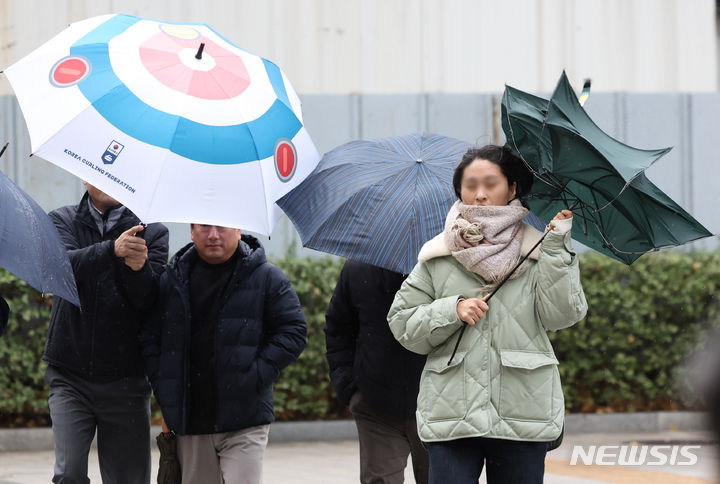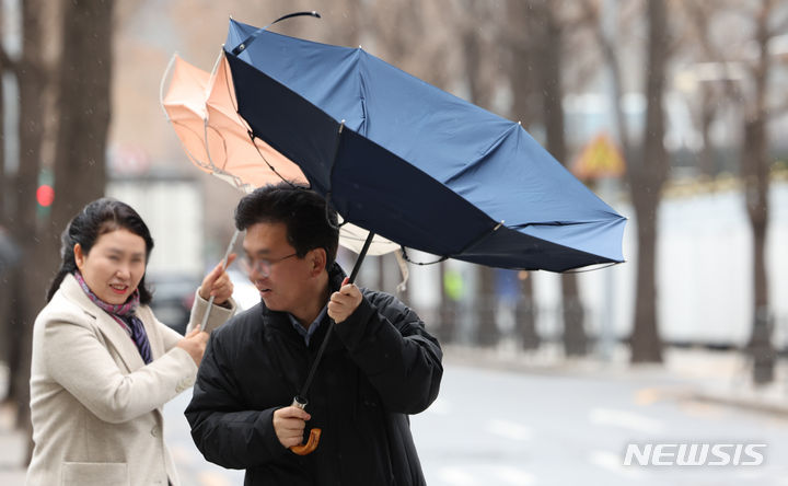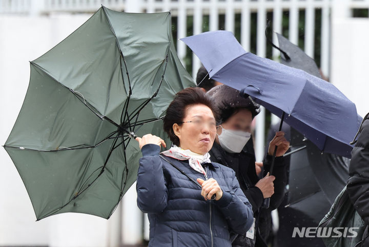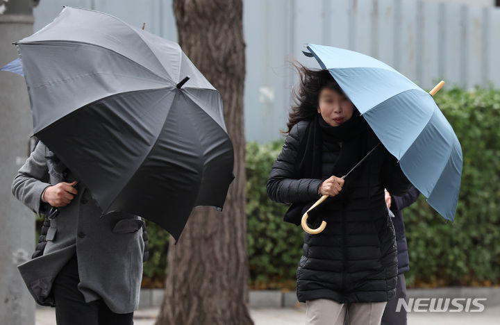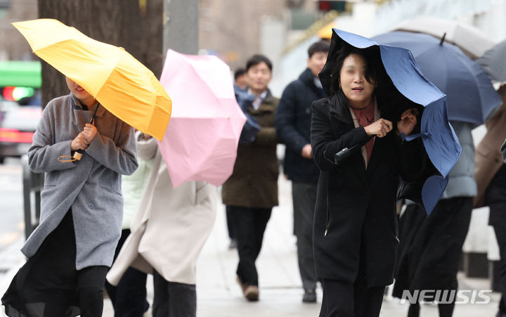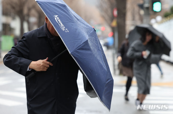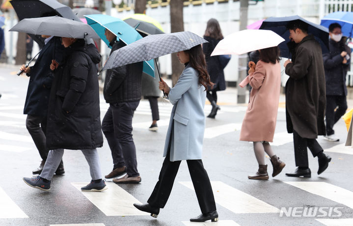 11日午前、ソウル市鍾路区の街角で、雨傘を差して歩みを急ぐ市民の様子。