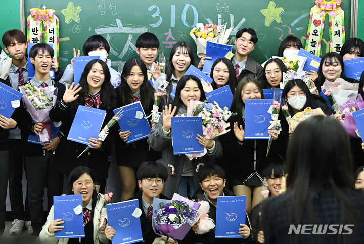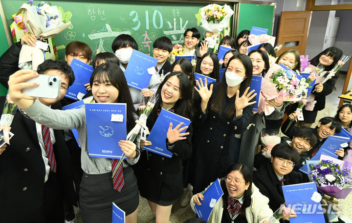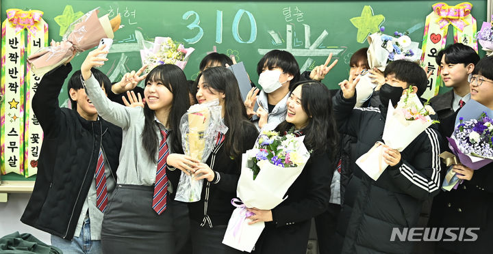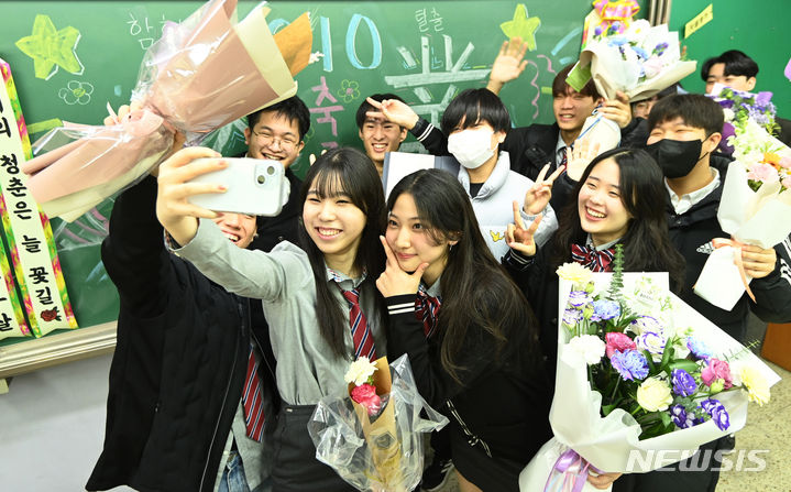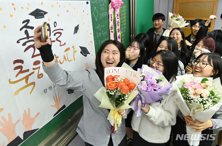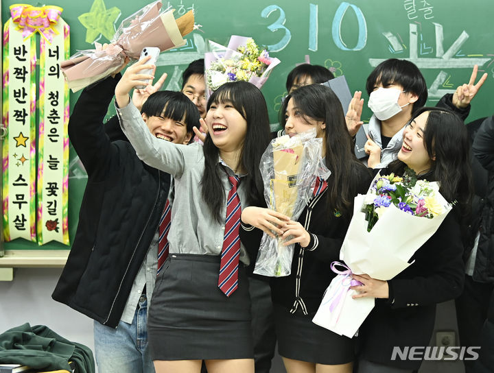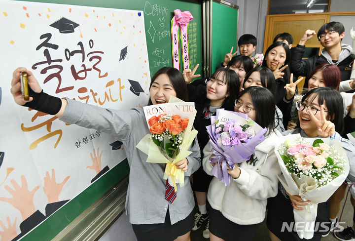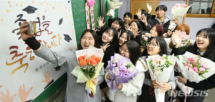 12日、京畿道始興市の咸絃高校で開かれた卒業式で、記念撮影して思い出を残している生徒たちの様子。