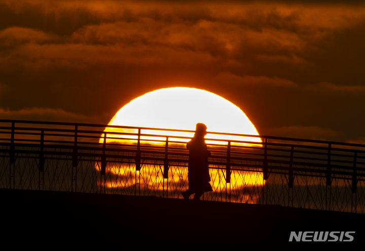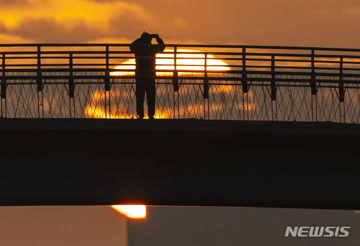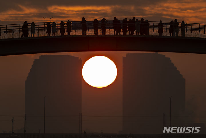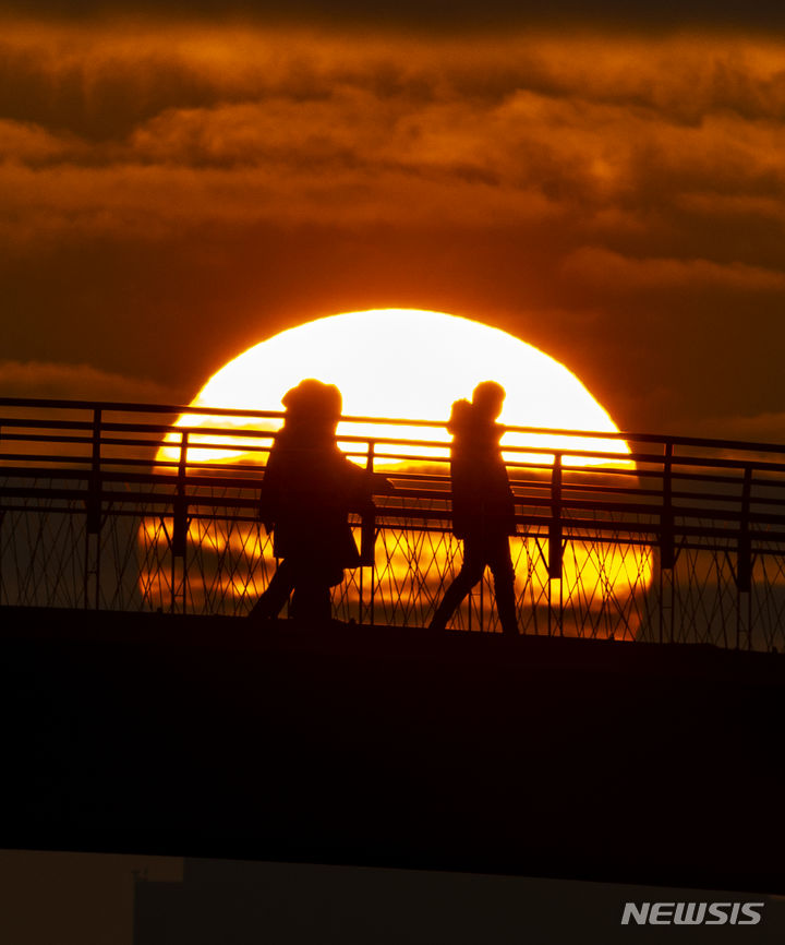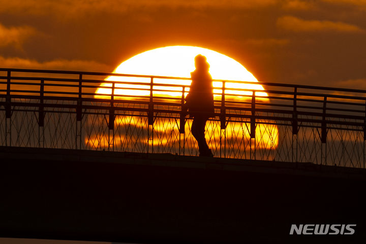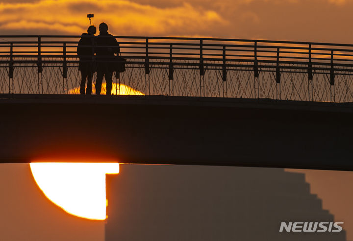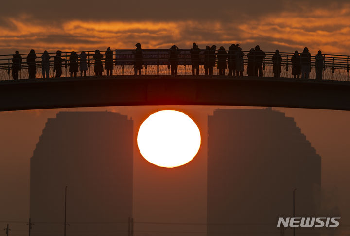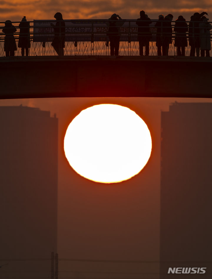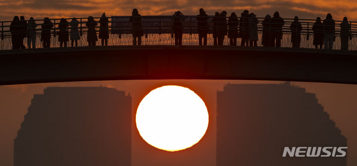 2024年初日となる1月1日朝、ソウル市永登浦区の楊花漢江公園から眺めた仙遊橋の向こうに日が昇っている。