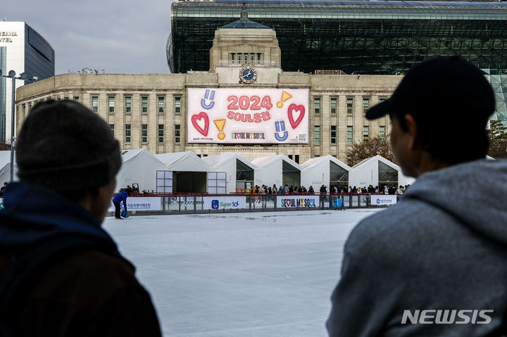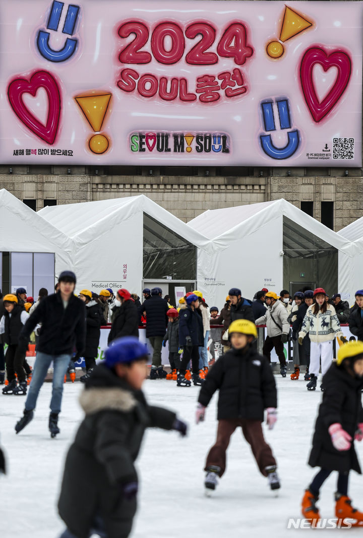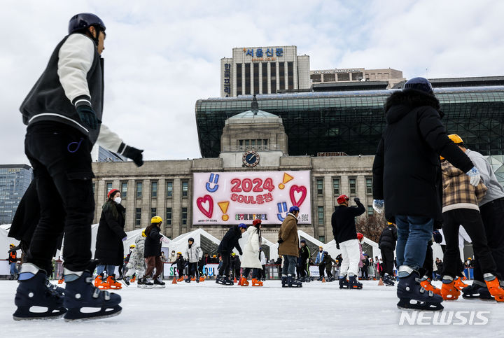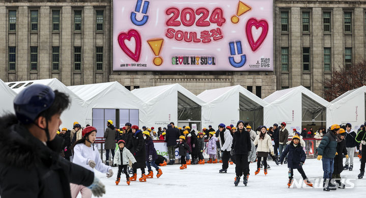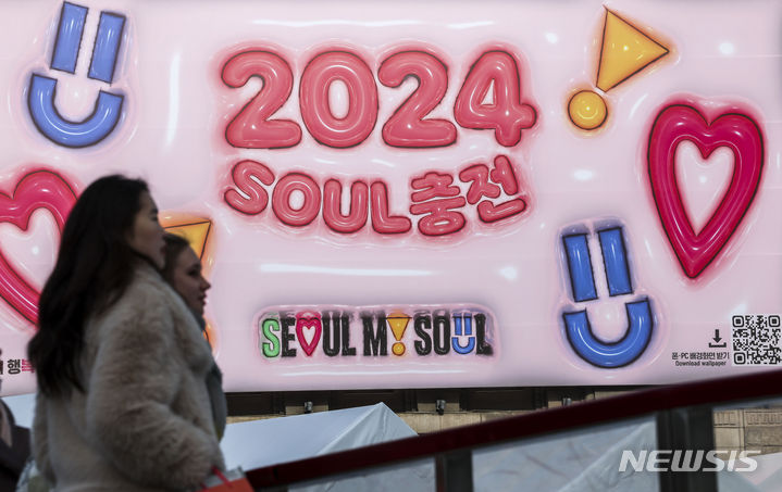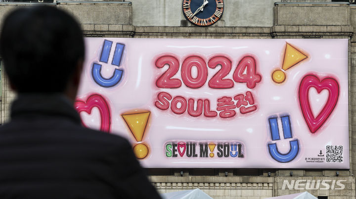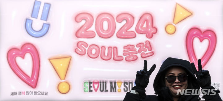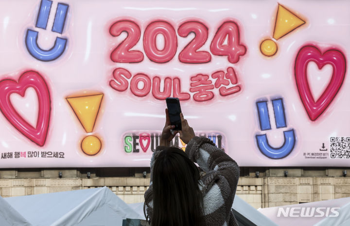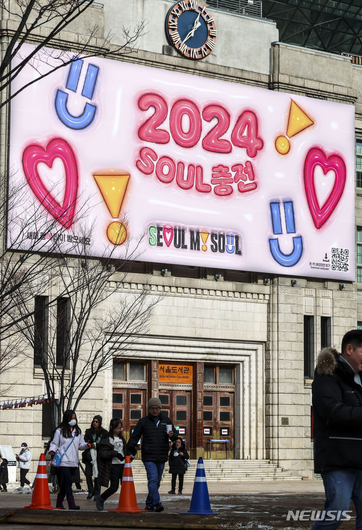 【NEWSIS】新年1月1日、ソウル市中区のソウル図書館外壁「夢刻み板」に「2024 年SOUL(ソウル)充電」と書かれた横断幕が掲げられた。