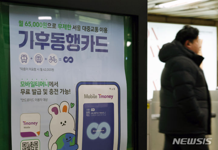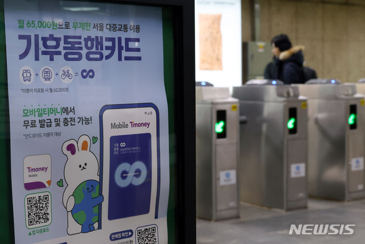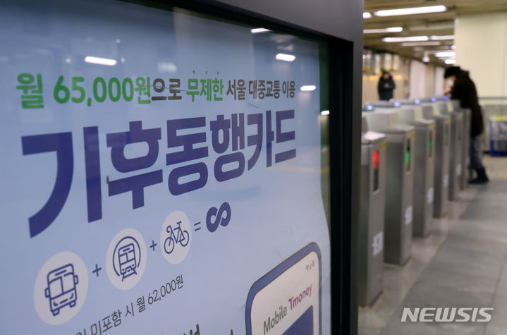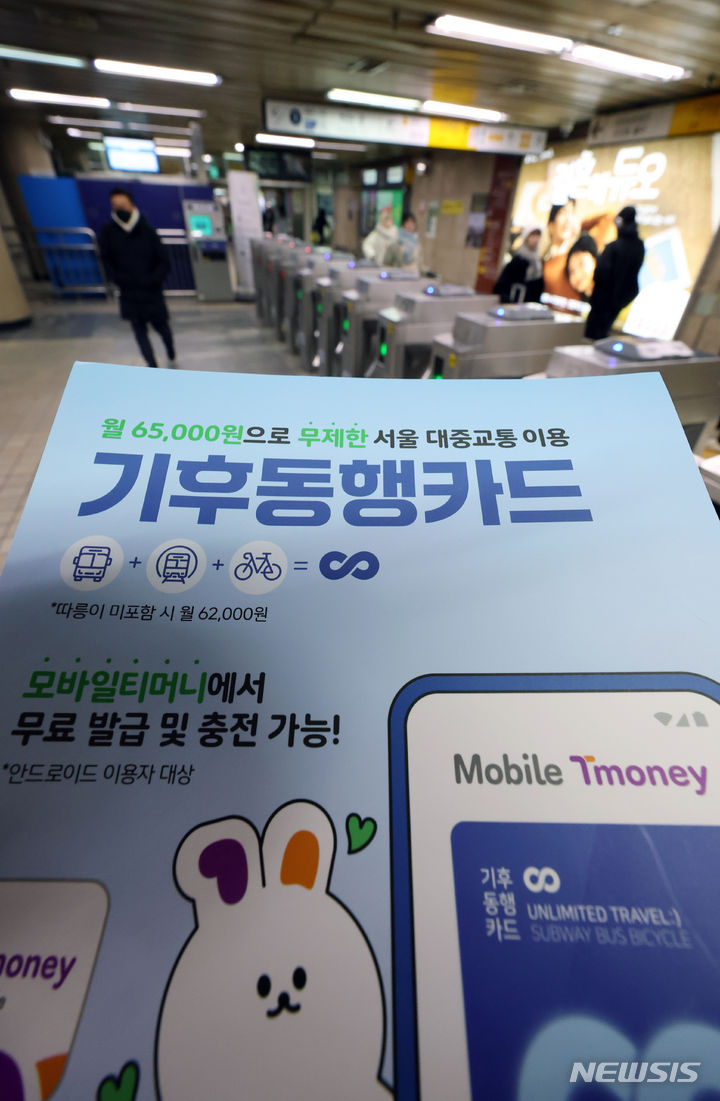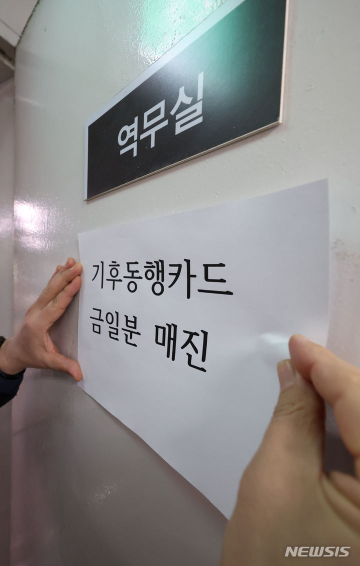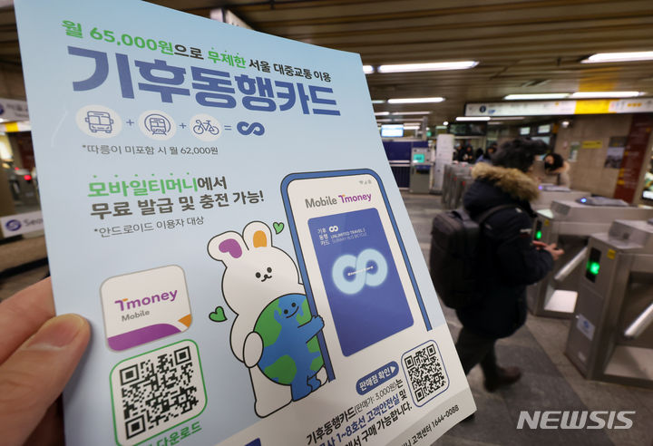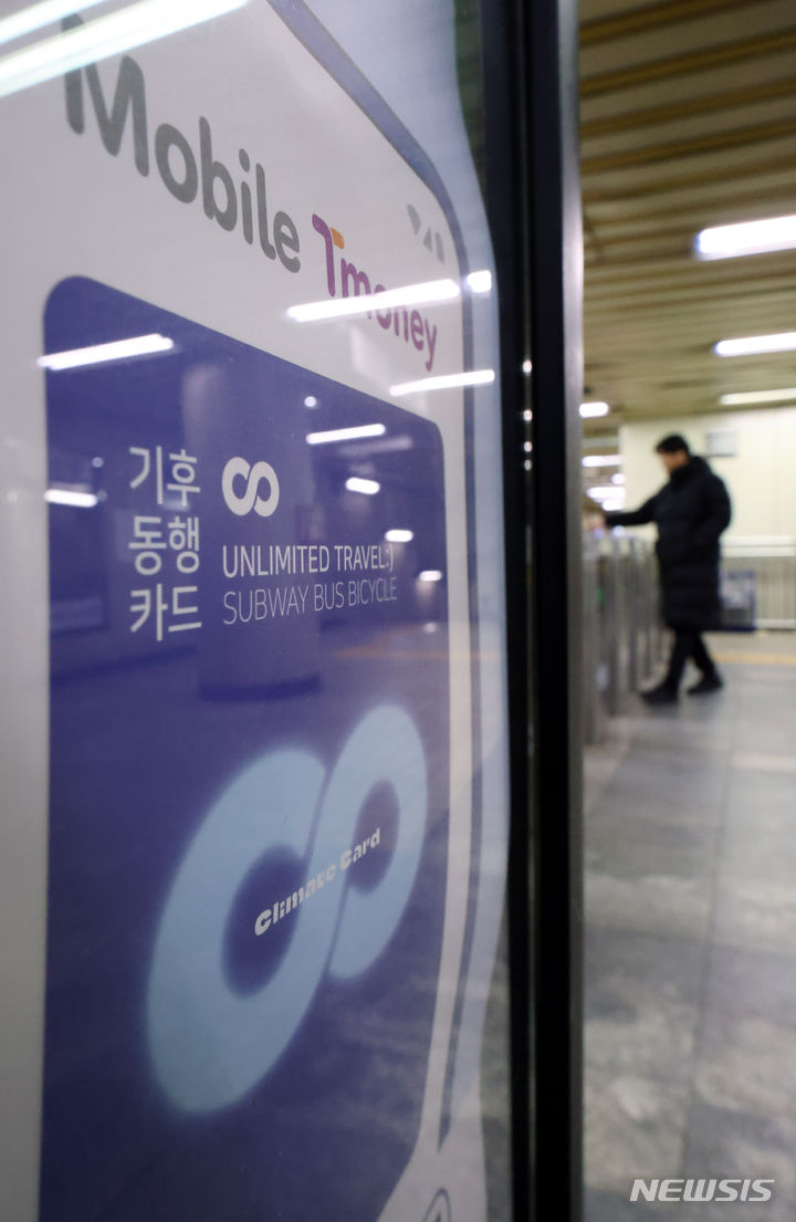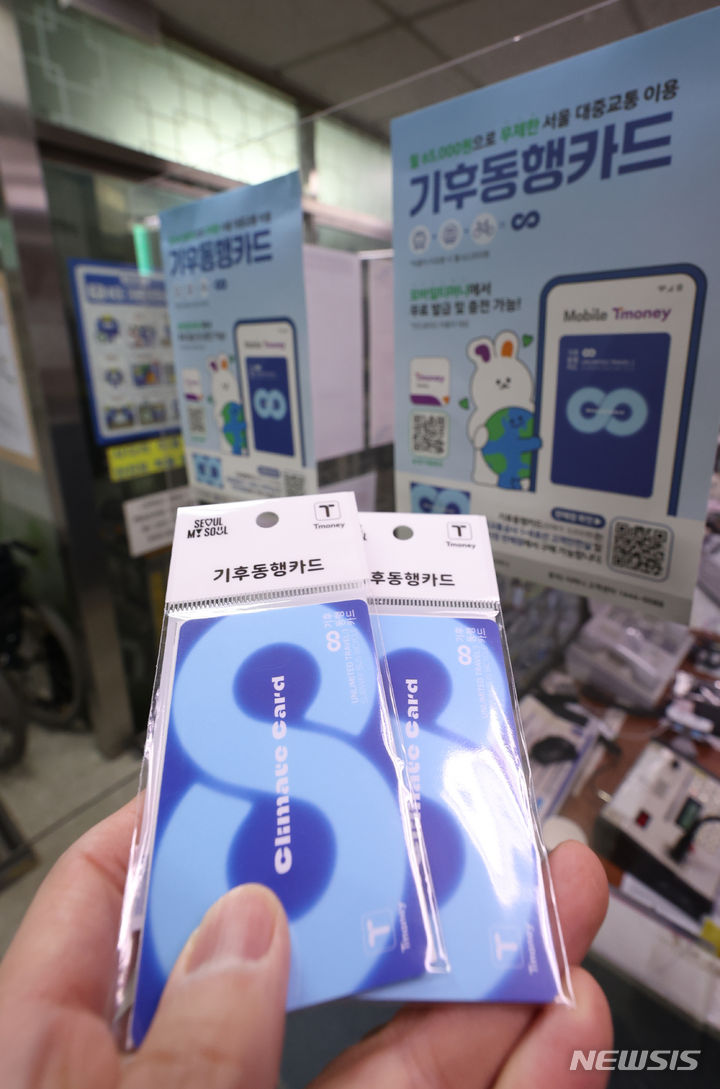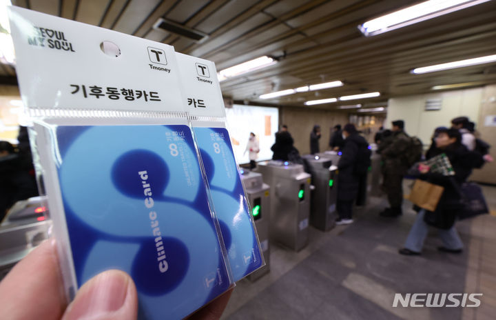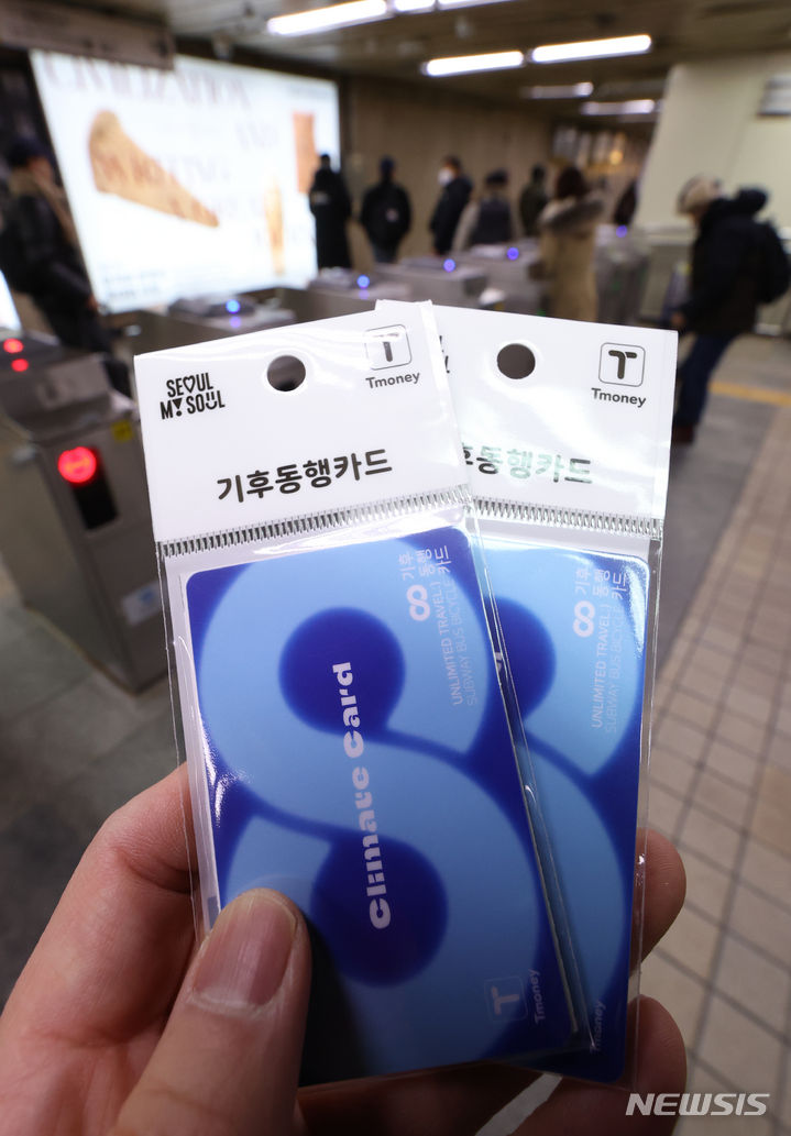 23日、ソウル市民のための公共交通統合定期券「気候同行カード」販売が始まった。写真は同日、ソウル駅の地下鉄顧客安全室で販売中の気候同行カード。このカードは、ソウル市内の地下鉄と市内バス・マウルバスなどを利用できる統合定期券だ。ソウル交通公社1号線のソウル駅-清凉里駅間、2号線から8号線までのソウル地域各駅の顧客安全室で、現金3000ウォン(約333円)で実物カードを購入し、チャージ後に利用できる。「モバイルカード」は口座を登録して自動引き落としでチャージ後に利用できる。