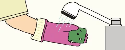 ゴム手袋をして皿洗いをする時は、手袋の端を一度折り返しておこう。ゴム手袋をつたって水が流れ込み、腕がぬれるのを防ぐことができる。