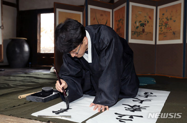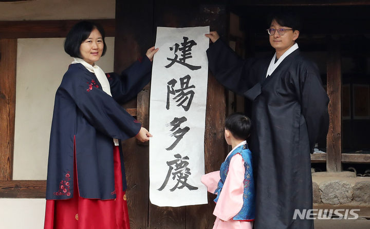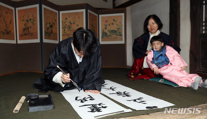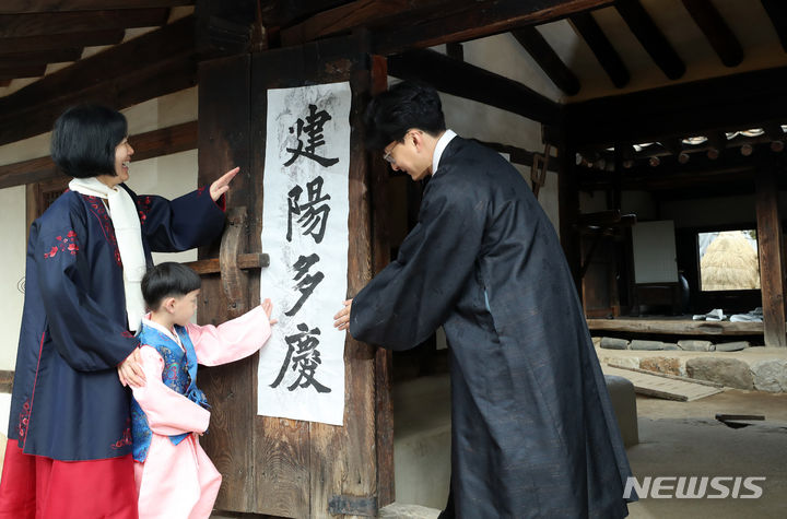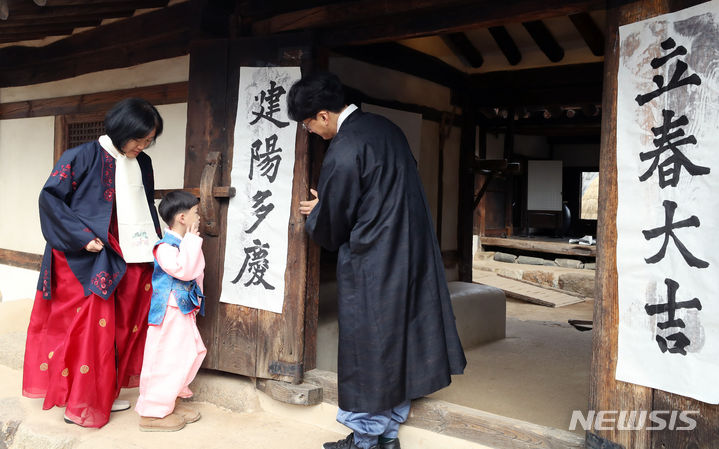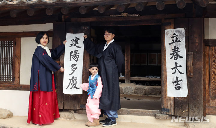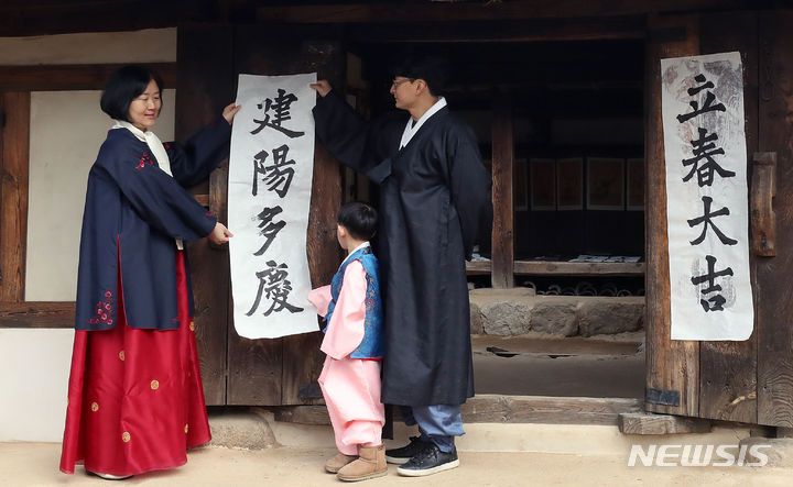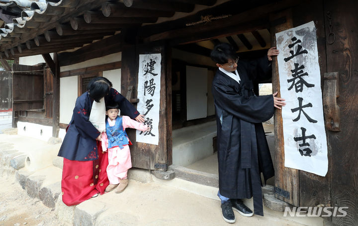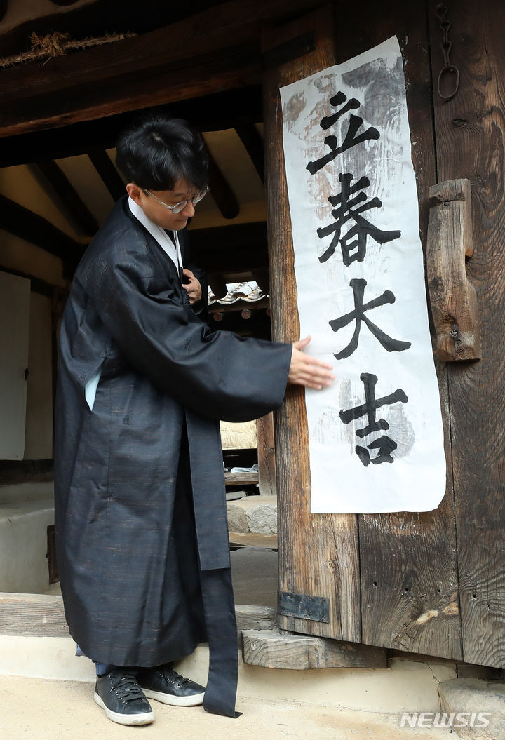 立春を二日後に控えた2日午前、ソウル市鍾路区の国立民俗博物館にある梧村宅で年中行事が行われ、書道家パク・チヌらが「立春大吉」や「建陽多慶」と書かれた立春帖を門に貼っていた。