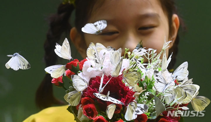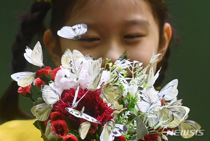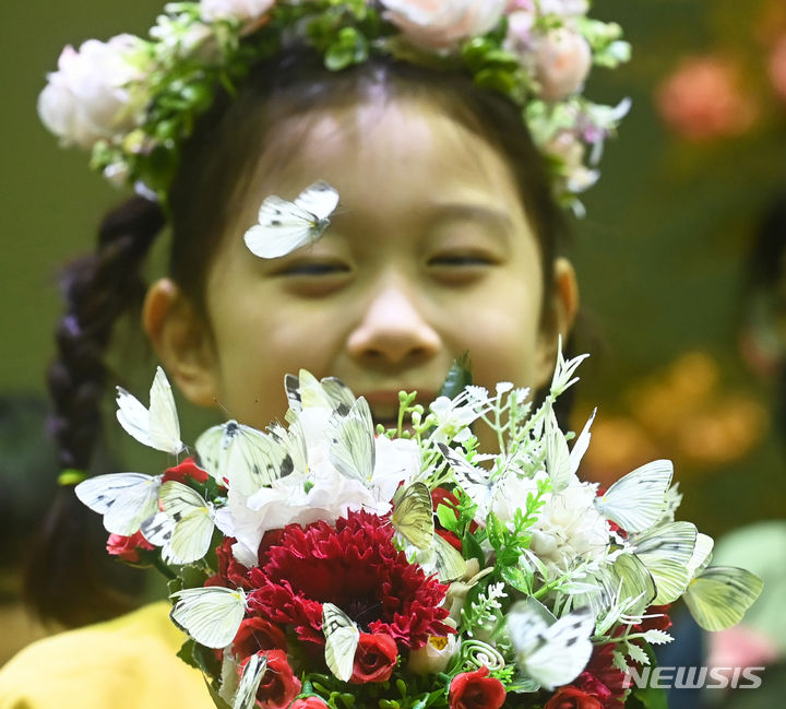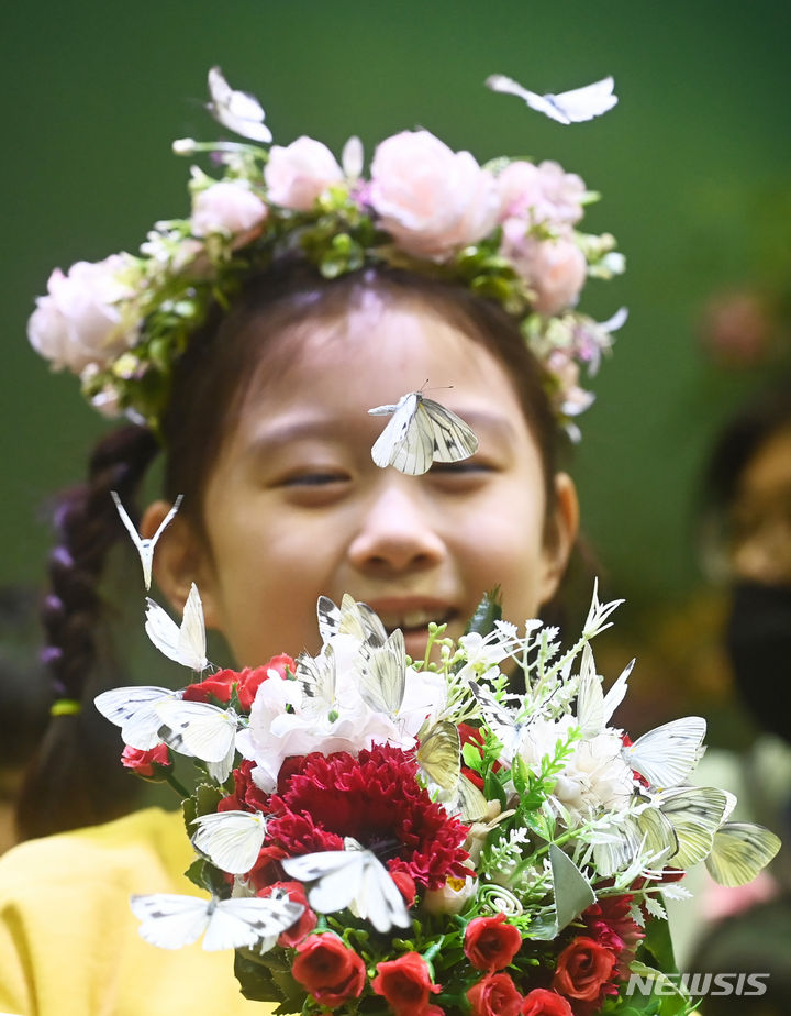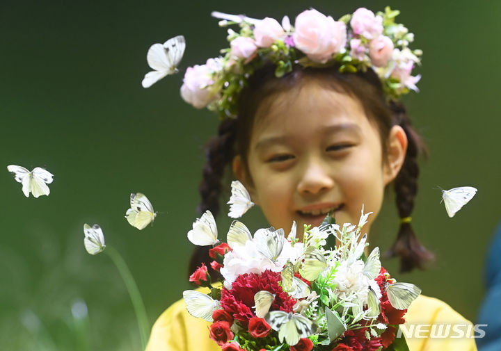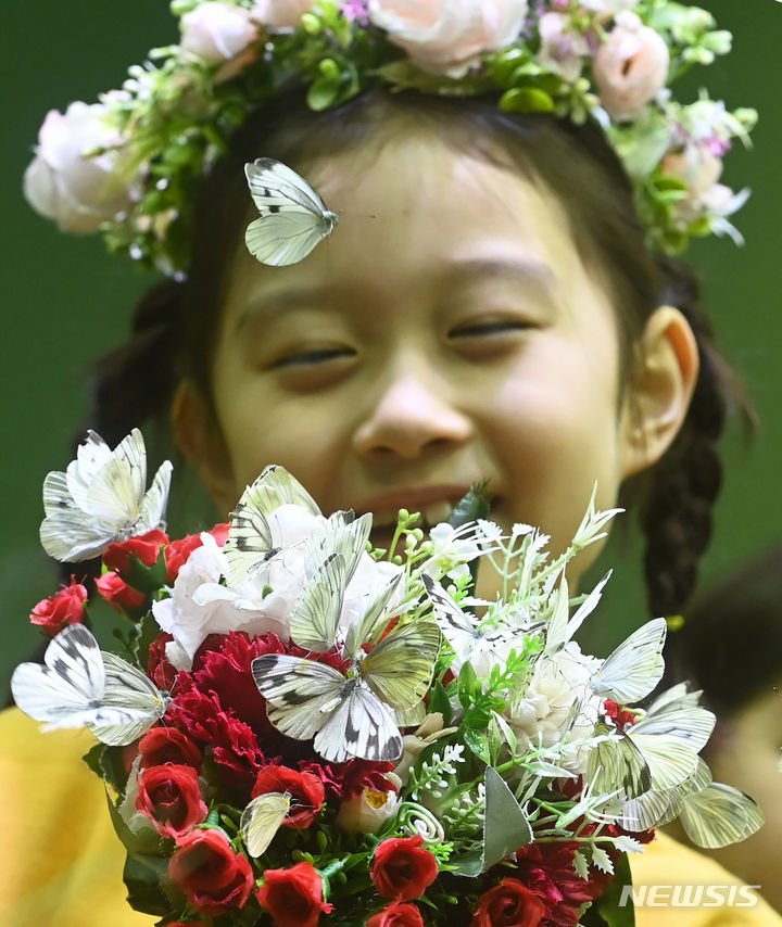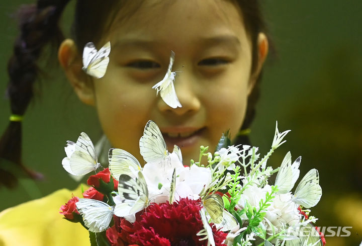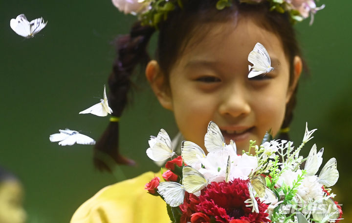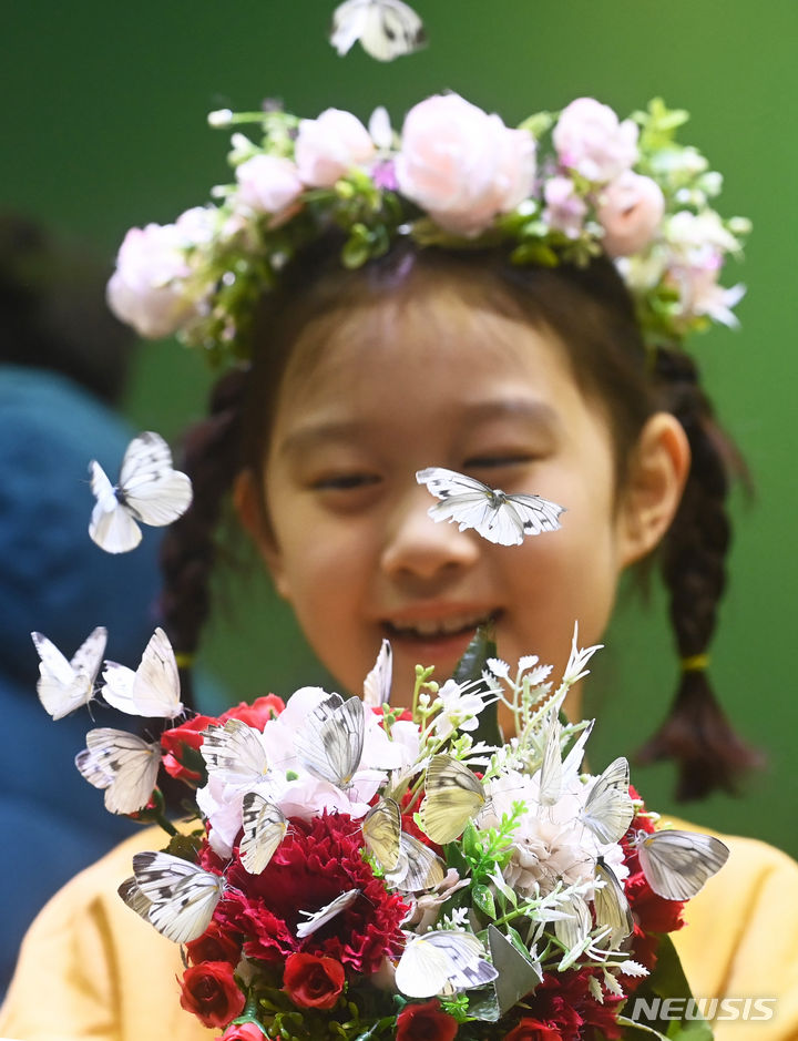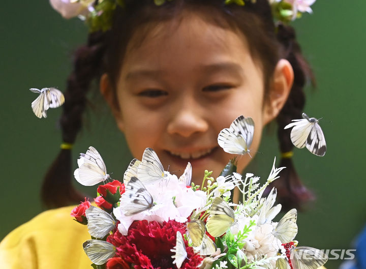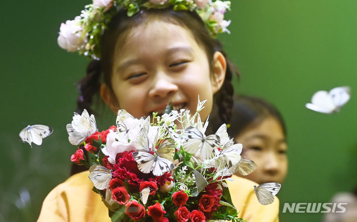 二十四節気の一つ「立春」まであと二日と迫った2日、京畿道竜仁市のエバーランド・ライブ・ナビ(チョウチョ)体験館を訪れて美しいチョウチョを見て回る子どもたち。
