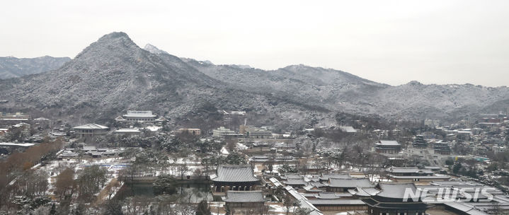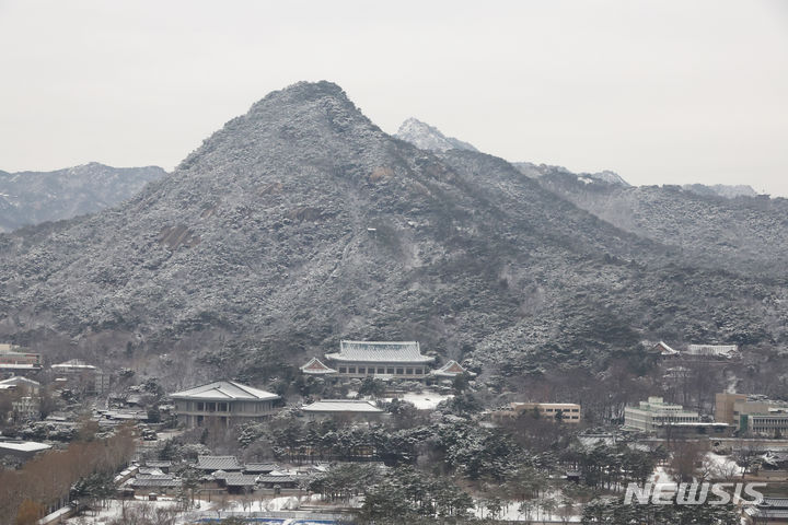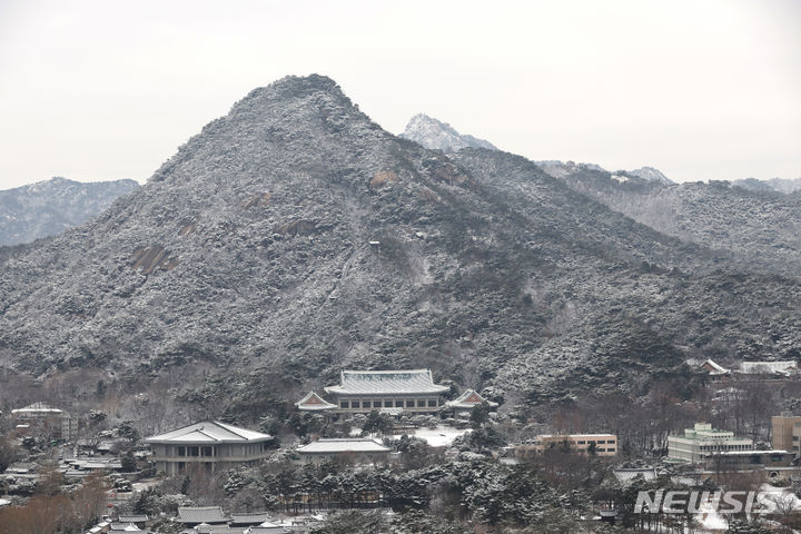 6日午前、ソウル市鍾路区の北岳山と青瓦台が、夜通し降った雪で真っ白になり、冬の風景が広がっている。