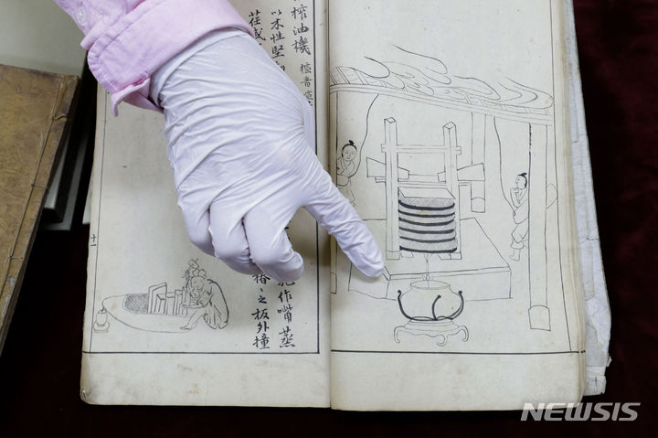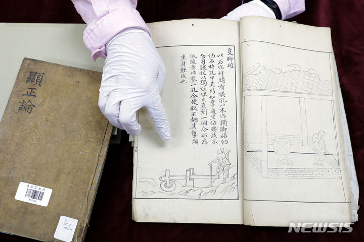 ソウルの鍾路図書館が27日、古文献保管室で、朝鮮王朝後期の粛宗の御医を務めた医官、李時弼(イ・シピル)が1720-1722年ごろ編さんした『ソウ聞事説』(ソウはごんべんに叟の字)を公開している様子。鍾路図書館内の「古文献実感世界」体験館で国家指定文化財やソウル市有形文化財など6種類の影印本を展示し、メディアテーブルを通して古書の解題や主要部分を直接検索できる。