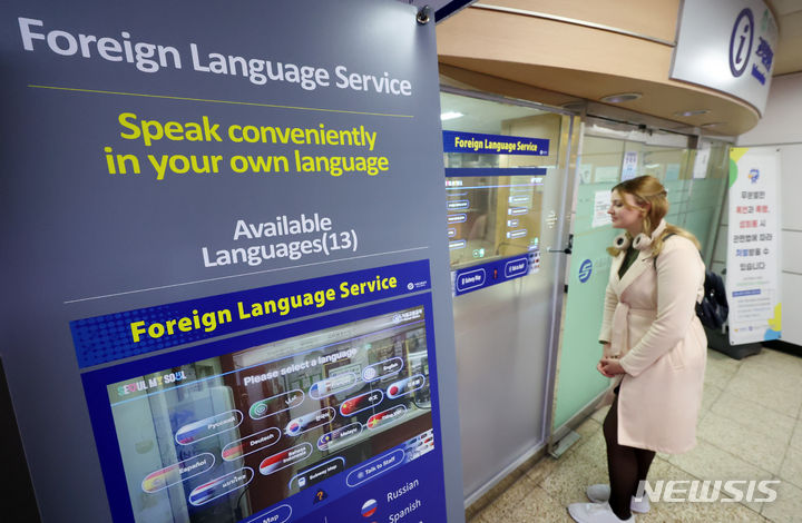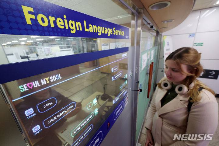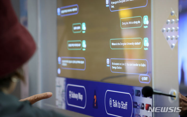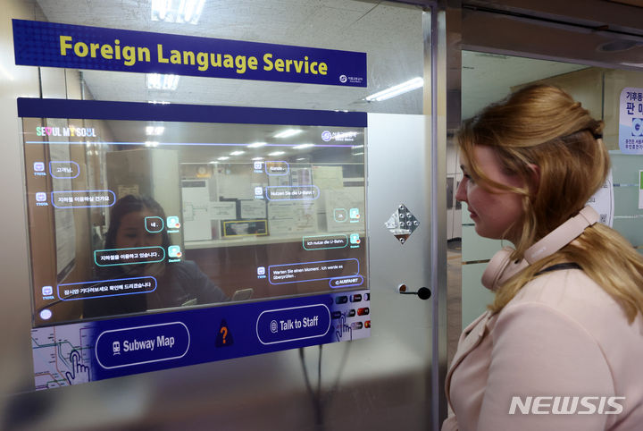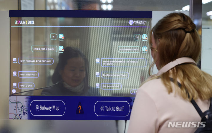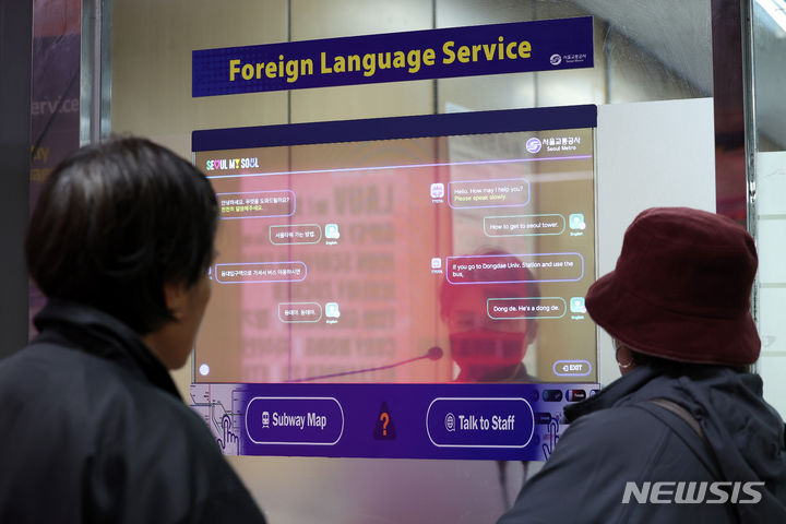 14日午前。ソウル市麻浦区の弘大入口駅で、ある外国人観光客が人工知能(AI)通訳システムを利用してソウル交通公社の関係者と対話を交わしている様子。ソウル交通公社はこの日、「外国語同時対話システム」を、従来から運営中の4号線明洞駅からさらに2号線市庁駅・弘大入口駅、1号線鍾路5街駅など11の駅に拡大設置すると発表した。